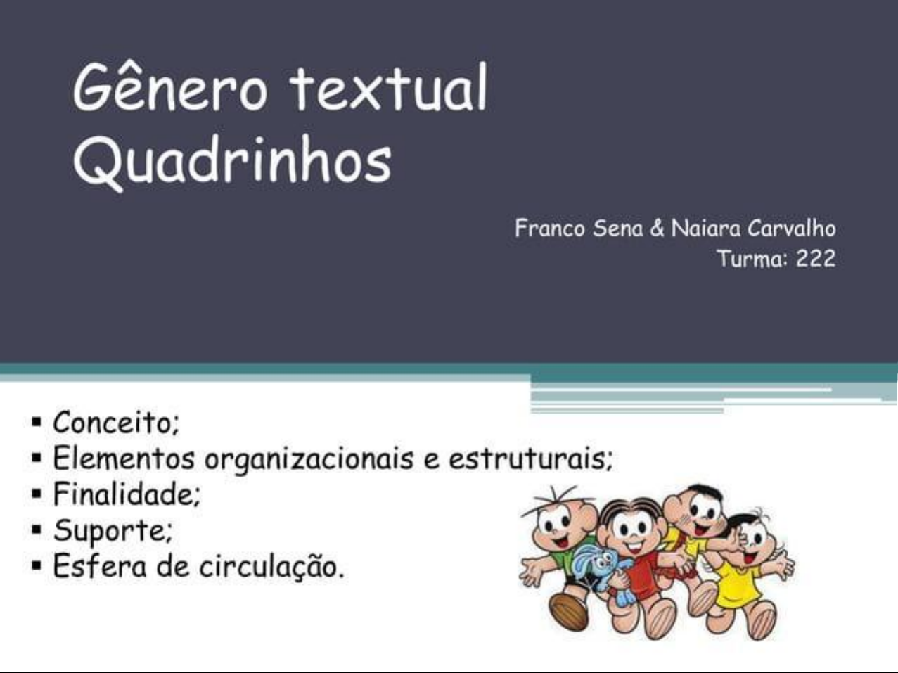 Gênero textual Quadrinhos Franco Sena & Naiara Carvalho Turma: 222 Conceito; Elementos organizacionais e estruturais; Finalidade; Suporte; Esfera de circulação.Conceito Quadrinhos são tramas narrativa que combinam a imagem plana com titulo escrito muitas vezes humorístico, busca a participação ativa do leitor por via emocional, assistemática, anedótica e concreta.Tipologia textual Podemos dizer que Quadrinho é um gênero misto, no qual predomina a tipologia textual narrativa, além disso, apresentam seqüências características de outros tipos textuais como a argumentação, a injunção e a exposição.Elementos organizacionais e estruturais Os elementos de organização e estrutura dos quadrinhos são balões de falas que utilizam uma linguagem rápida e coloquial com sincronia HQ a imagem facilitando entendimento, e os próprios quadrinhos que dividem as ações da historia. Ao lado vimos como é importantes os balões de falas para a compreensão em um HQ(historia em quadrinho).Finalidade do gênero Tem com maior alvo publico infantil e familiar, mas podem se utilizados como instrumento de ensino por apresentarem muitas vezes assuntos informativos e educacionais como mostrado no tira abaixo abordando assunto drogas. OLHA EU SABIA!!! BOTA MAIS UMA A PINGA ACABOU. QUEM SUSTENTA DOSE DE CACHAÇA SERVE LEITE COM DE DROGAS SÃO RICOS! MULHER! SODA CAUSTICA? Braobzao@gmail.comSuporte Os quadrinhos podem ser encontrados normalmente em bancas de revistas, livros didáticos, internet entre outros.Esfera de circulação Os quadrinho podem se encaixar na esfera de circulação BIBLIA cotidiana, por serem flexíveis para todos EM os tipos de público podem ser lidos em qualquer lugar e tempo. A HISTÓRIA DA SALVAÇÃO 00 MUNDOCrianças ao lerem as Os quadrinhos atraem histórias em as crianças e jovens Alem de ser um ótimo quadrinhos, se com mais facilidade e, divertem e satisfazem passa tempo para com seu processo de a necessidade interior adolescentes e adultos comunicação, atendem instintiva, o ocupando seu tempo com mais destreza à crescimento mental livre com diversão sem sua própria inerente ao ser em deixar de treinar a predisposição desenvolvimento. leitura e a escrita psicológica.Fim will