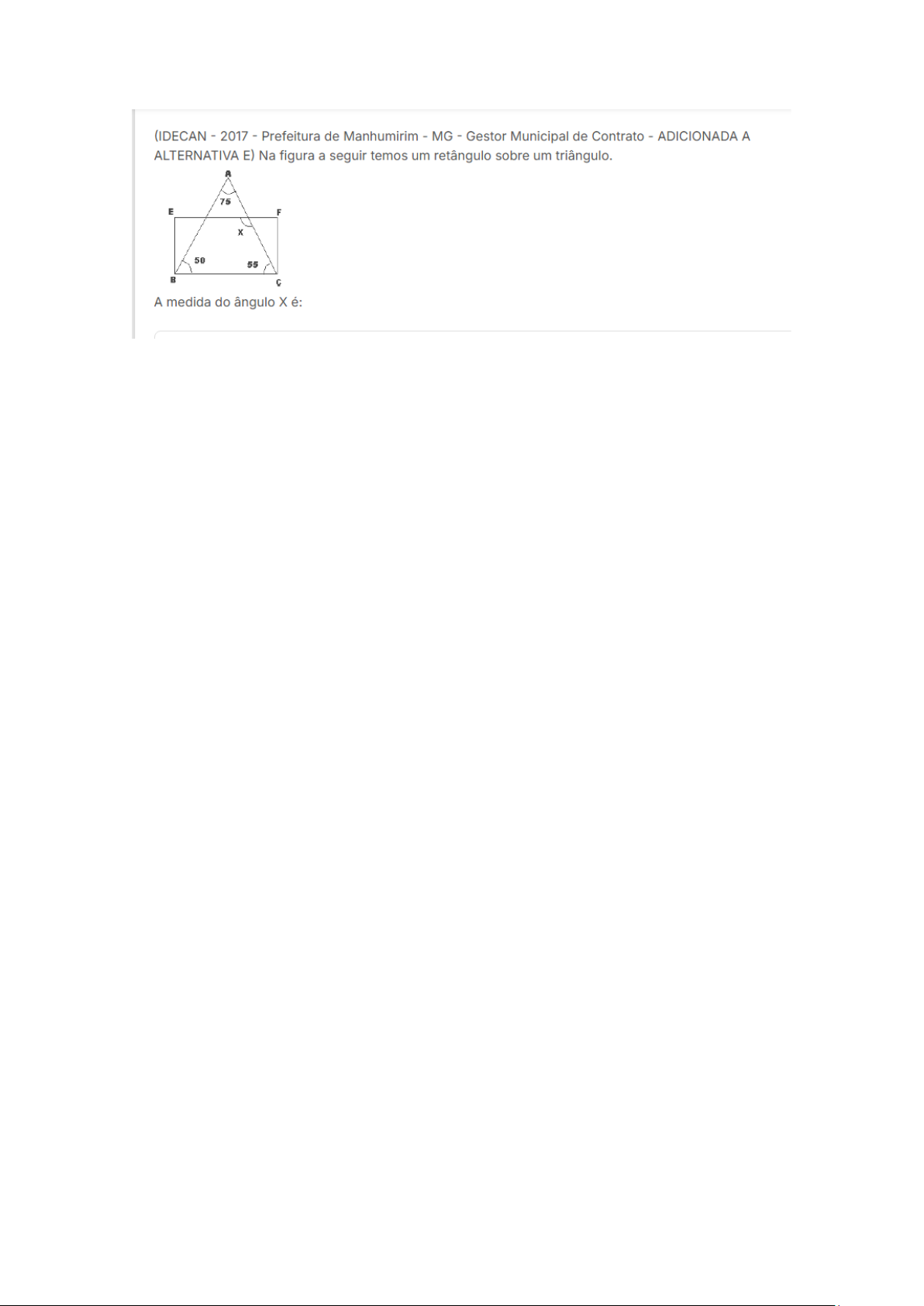 (IDECAN - 2017 - Prefeitura de Manhumirim - MG - Gestor Municipal de Contrato - ADICIONADA A ALTERNATIVA E) Na figura a seguir temos um retângulo sobre um triângulo. 75 E F X 50 55 C A medida do ângulo X é: