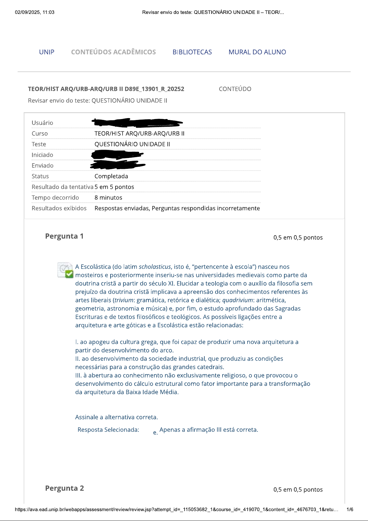 02/09/2025, 11:03 Revisar envio do teste: QUESTIONÁRIO UNIDADE TEOR/... UNIP CONTEÚDOS ACADÊMICOS BIBLIOTECAS MURAL DO ALUNO TEOR/HIST ARQ/URB-ARQ/URB II D89E_13901_R_20252 CONTEÚDO Revisar envio do teste: QUESTIONÁRIO UNIDADE Usuário Curso TEOR/HIST ARQ/URB-ARQ/URB II Teste QUESTIONÁRIO UNIDADE Iniciado Enviado Status Completada Resultado da tentativa 5 em 5 pontos Tempo decorrido 8 minutos Resultados exibidos Respostas enviadas, Perguntas respondidas incorretamente Pergunta 1 0,5 em 0,5 pontos A Escolástica (do latim scholasticus, isto é, "pertencente à escola") nasceu nos mosteiros e posteriormente inseriu-se nas universidades medievais como parte da doutrina cristã a partir do século XI. Elucidar a teologia com auxílio da filosofia sem prejuízo da doutrina cristã implicava a apreensão dos conhecimentos referentes às artes liberais (trivium: gramática, retórica e dialética; quadrivium: aritmética, geometria, astronomia e música) e, por fim, estudo aprofundado das Sagradas Escrituras e de textos filosóficos e teológicos. As possíveis ligações entre a arquitetura e arte góticas e a Escolástica estão relacionadas: I. ao apogeu da cultura grega, que foi capaz de produzir uma nova arquitetura a partir do desenvolvimento do arco. II. ao desenvolvimento da sociedade industrial, que produziu as condições necessárias para a construção das grandes catedrais. III. à abertura ao conhecimento não exclusivamente religioso, que provocou desenvolvimento do cálculo estrutural como fator importante para a transformação da arquitetura da Baixa Idade Média. Assinale a alternativa correta. Resposta Selecionada: e. Apenas a afirmação III está correta. Pergunta 2 0,5 em 0,5 pontos 1/602/09/2025, 11:03 Revisar envio do teste: QUESTIONÁRIO UNIDADE TEOR/... A partir do século IV, aparece a necessidade de desenvolver novos edifícios e soluções arquitetônicas voltadas a acolher os rituais cristãos. É correto afirmar: I. A igreja de San Vitale (em Ravena) segue tipo basílica presente durante toda a Alta Idade Média. II. mausoléu de Santa Constanza (em Roma) segue esquema de planta circular e cúpula presente na arquitetura bizantina. III. A arquitetura paleocristã desenvolvida em Ravena e a arquitetura bizantina apresentam espaço centralizado coberto por cúpula como característica comum. Assinale a alternativa correta. Resposta Selecionada: d. As afirmações e III estão corretas. Pergunta 3 0,5 em 0,5 pontos Além dos avanços técnicos, a transição entre Românico e 0 Gótico aponta para uma mudança de mentalidade. Os ensinamentos da filosofia escolástica enquadravam harmoniosamente todo saber daquele tempo e afirmavam a possibilidade de ascensão a Deus não só pela fé, como pela razão. Chegava-se a Deus por um esforço do pensamento, complexo, rigidamente formal, mas rico de sutilezas. Entre as evidências dessa transição na arquitetura, pode-se afirmar: I. As dimensões das catedrais góticas que apontavam um afastamento simbólico da escala humana. II. papel simbólico da luz por meio dos vitrais e rosáceas nas basílicas românicas. III. O predomínio da escala vertical nas catedrais românicas. Assinale a alternativa correta. Resposta Selecionada: Apenas a afirmação I está correta. a. Pergunta 4 0,5 em 0,5 pontos Entre os séculos XI e XII, enquanto no Oriente a arquitetura se desenvolve no Ocidente as soluções construtivas ainda mantêm como referência as estruturas abobadadas com grossas paredes de alvenaria dos antigos romanos do séc. le II. Pode-se afirmar que isso se deve: 2/602/09/2025, 11:03 Revisar envio do teste: QUESTIONÁRIO UNIDADE TEOR/... I. ao contexto histórico caracterizado pela falta de tranquilidade social e escassez de recursos técnicos e materiais. II. a opção por um sistema estrutural seguro, de fácil construção e eficiência comprovada pela história da arquitetura romana. III. às restrições do clero sobre possíveis inovações construtivas que constituiriam uma quebra da hierarquia e poder religioso. Assinale a alternativa correta. Resposta Selecionada: b. As afirmações I e estão corretas. Pergunta 5 0,5 em 0,5 pontos princípio tipológico da maior parte das igrejas cristãs ocidentais, a basílica paleocristã, tem sua origem na basílica romana. As diferenças se resumem à escala e à orientação, que no caso cristão desloca acesso para lado menor do retângulo da planta e estabelece como diretriz um eixo longitudinal. Pode-se afirmar que tipo basilical cristão implica: I. nave central e naves laterais. II. abside e nártex. III. espaço central e trifório. Assinale a alternativa correta. Resposta Selecionada: b. As afirmações I e II estão corretas. Pergunta 6 0,5 em 0,5 pontos Sabe-se que Românico é primeiro estilo arquitetônico do ocidente, principalmente por constituir uma unidade tridimensional que se tornou modelo construtivo para a disseminação da fé cristã por toda a Europa. Pode-se afirmar que seu sistema estrutural característico inclui: I. a adoção da massa ativa. II. a cúpula como solução para a cobertura. III. a presença de contrafortes e abóbadas. Assinale a alternativa correta. 3/602/09/2025, 11:03 Revisar envio do teste: QUESTIONÁRIO UNIDADE TEOR/... Resposta Selecionada: b. As afirmações I e III estão corretas. Pergunta 7 0,5 em 0,5 pontos (a cidade)... depende do campo para abastecimento de víveres, e controla de fato um território mais ou menos grande; mas, diferentemente da cidade grega, não concede paridade de direitos aos habitantes dos campos. Permanece uma cidade fechada: suas relações econômicas e políticas podem ser estendidas à escala nacional ou mundial, mas sua política permanece guiada pelos interesses restritos da população urbana" (BENEVOLO, L. história da cidade. São Paulo: Perspectiva, 2001. p. 260). O texto se refere: I. à configuração das bastides medievais. II. à estrutura da cidade-estado medieval. III. à cid