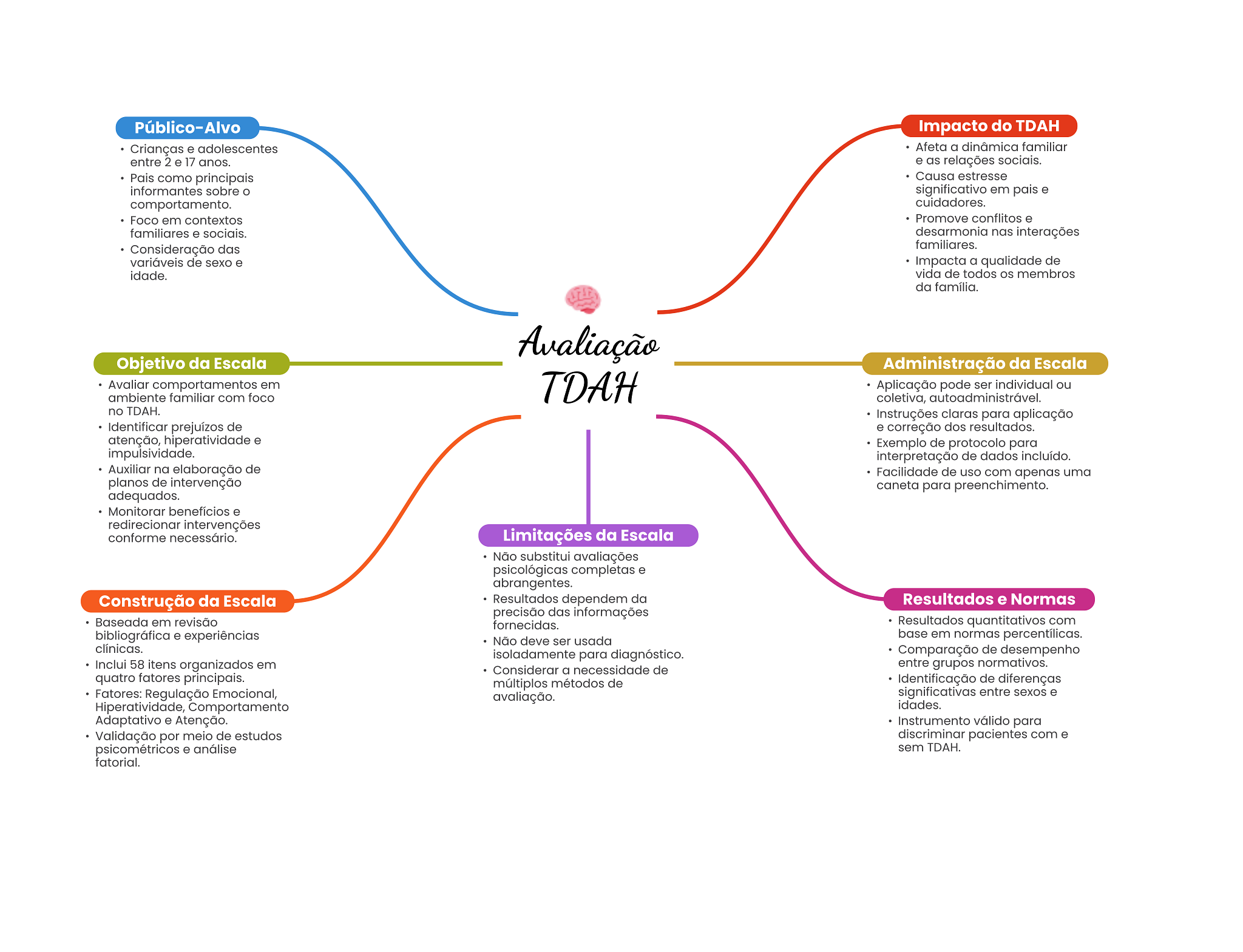 Público-Alvo Impacto do TDAH Crianças e adolescentes Afeta a dinâmica familiar entre 2 e 17 anos. e as relações sociais. Pais como principais Causa estresse informantes sobre significativo em pais e comportamento. cuidadores. Foco em contextos Promove conflitos e familiares e sociais. desarmonia nas interações Consideração das familiares. variáveis de sexo e Impacta a qualidade de idade. vida de todos os membros da família. Avaliação Objetivo da Escala Administração da Escala Avaliar comportamentos em TDAH Aplicação pode ser individual ou ambiente familiar com foco coletiva, no TDAH. Instruções claras para aplicação Identificar prejuízos de e correção dos resultados. atenção, hiperatividade e Exemplo de protocolo para impulsividade. interpretação de dados incluído. Auxiliar na elaboração de Facilidade de uso com apenas uma planos de intervenção caneta para preenchimento. adequados. Monitorar benefícios e redirecionar intervenções conforme necessário. Limitações da Escala Não substitui avaliações psicológicas completas e abrangentes. Construção da Escala Resultados dependem da Resultados e Normas precisão das informações Baseada em revisão fornecidas. Resultados quantitativos com bibliográfica e experiências Não deve ser usada base em normas percentílicas. clínicas. isoladamente para diagnóstico. Comparação de desempenho Inclui 58 itens organizados em Considerar a necessidade de entre grupos normativos. quatro fatores principais. múltiplos métodos de Identificação de diferenças Fatores: Regulação Emocional, avaliação. significativas entre sexos e Hiperatividade, Comportamento idades. Adaptativo e Atenção. Instrumento válido para Validação por meio de estudos discriminar pacientes com e psicométricos e análise sem TDAH. fatorial.