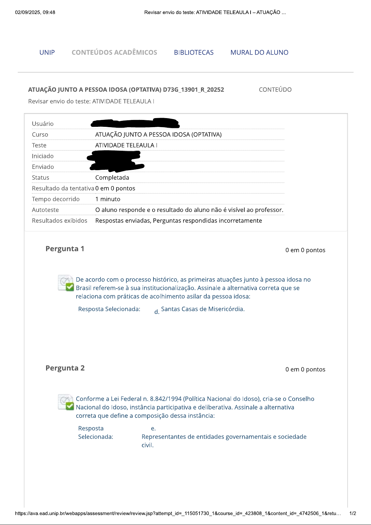 02/09/2025, 09:48 Revisar envio do teste: ATIVIDADE TELEAULA ATUAÇÃO UNIP CONTEÚDOS ACADÊMICOS BIBLIOTECAS MURAL DO ALUNO ATUAÇÃO JUNTO A PESSOA IDOSA (OPTATIVA) D73G_13901_R_20252 CONTEÚDO Revisar envio do teste: ATIVIDADE TELEAULA Usuário Curso ATUAÇÃO JUNTO A PESSOA IDOSA (OPTATIVA) Teste ATIVIDADE TELEAULA Iniciado Enviado Status Completada Resultado da tentativa 0 em 0 pontos Tempo decorrido 1 minuto Autoteste O aluno responde e resultado do aluno não é visível ao professor. Resultados exibidos Respostas enviadas, Perguntas respondidas incorretamente Pergunta 1 0 em 0 pontos De acordo com processo histórico, as primeiras atuações junto à pessoa idosa no Brasil referem-se à sua institucionalização. Assinale a alternativa correta que se relaciona com práticas de acolhimento asilar da pessoa idosa: Resposta Selecionada: d. Santas Casas de Misericórdia. Pergunta 2 0 em 0 pontos Conforme a Lei Federal n. 8.842/1994 (Política Nacional do Idoso), cria-se Conselho Nacional do Idoso, instância participativa e deliberativa. Assinale a alternativa correta que define a composição dessa instância: Resposta e. Selecionada: Representantes de entidades governamentais e sociedade civil. 1/202/09/2025, 09:48 Revisar envio do teste: ATIVIDADE TELEAULA ATUAÇÃO Pergunta 3 0 em 0 pontos A partir do texto, é correto afirmar que no programa habitacional Minha Casa, Minha Vida é obrigatório um percentual de reserva mínima nas unidades habitacionais para atendimento às pessoas idosas. Esse percentual é de: Resposta Selecionada: b. 3%. Pergunta 4 0 em 0 pontos A partir do cenário internacional, nota-se que cada civilização construiu historicamente a forma de tratar as pessoas idosas. Assinale a alternativa correta que aponta as civilizações que respeitam a pessoa idosa em sua cultura: Resposta Selecionada: Chinesa e japonesa. a. Terça-feira, 2 de Setembro de 2025 09h48min28s GMT-03:00 OK 2/2