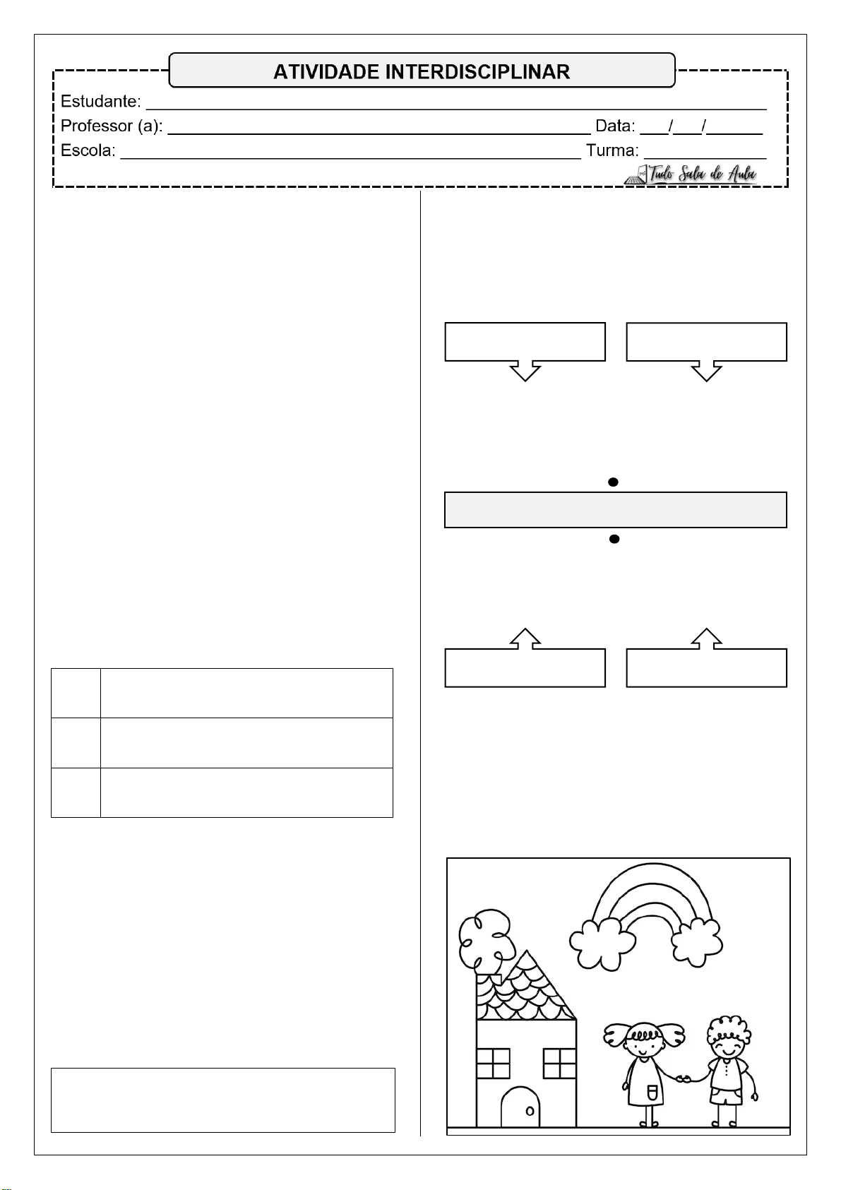 LEIA O TEXTO ABAIXO. O DIREITO DAS CRIANÇAS CRIANÇA TEM QUE TER NOME CRIANÇA TEM QUE TER LAR TER SAÚDE E NÃO TER FOME TER SEGURANÇA E ESTUDAR. NÃO É QUESTÃO DE QUERER NEM QUESTÃO DE CONCORDAR OS DIRETOS DAS CRIANÇAS TODOS TÊM DE RESPEITAR. RUTH ROCHA 1. RETIRE DO TEXTO 3 DIREITOS DAS CRIANÇAS E ESCREVA NO ESPAÇO ABAIXO. 1 2 3 2. CONFORME O TEXTO, AS CRIANÇAS TÊM QUE TER DIREITO A) À FOME. B) À SAÚDE. C) AO DESRESPEITO. D) AO TRABALHO. 3. SEGUNDO O TEXTO, O QUE TODOS TÊM QUE RESPEITAR? 4. LIGUE AS PALAVRAS QUE SE RELACIONAM AOS DIREITOS DAS CRIANÇAS. 5. PINTE A IMAGEM QUE REPRESENTA UM DIREITO DAS CRIANÇAS CITADO NO TEXTO. CRIANÇA TEM QUE TER LAR! DIREITO DAS CRIANÇAS TRABALHAR BRINCAR ESTUDAR INJUSTIÇA