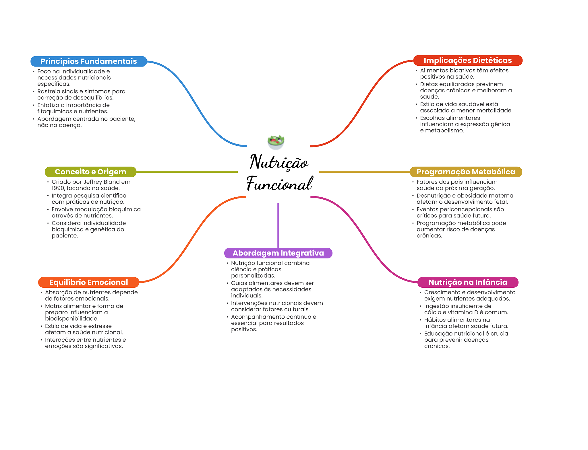 Princípios Fundamentais Implicações Dietéticas Foco na individualidade e Alimentos bioativos têm efeitos necessidades nutricionais positivos na saúde. específicas. Dietas equilibradas previnem Rastreia sinais e sintomas para doenças crônicas e melhoram a correção de saúde. Enfatiza a importância de Estilo de vida saudável está fitoquímicos e nutrientes. associado a menor mortalidade. Abordagem centrada no paciente, Escolhas alimentares não na doença. influenciam a expressão gênica e metabolismo. Nutrição Conceito e Origem Programação Metabólica Criado por Jeffrey Bland em Funcional Fatores dos pais influenciam 1990, focando na saúde. saúde da próxima geração. Integra pesquisa científica Desnutrição e obesidade materna com práticas de nutrição. afetam desenvolvimento fetal. Envolve modulação bioquímica Eventos periconcepcionais são através de nutrientes. críticos para saúde futura. Considera individualidade Programação metabólica pode bioquímica e genética do aumentar risco de doenças paciente. crônicas. Abordagem Integrativa Nutrição funcional combina ciência e práticas personalizadas. Equilíbrio Emocional Guias alimentares devem ser Nutrição na Infância Absorção de nutrientes depende adaptados às necessidades Crescimento e desenvolvimento individuais. de fatores emocionais. exigem nutrientes adequados. Matriz alimentar e forma de Intervenções nutricionais devem considerar fatores culturais. Ingestão insuficiente de preparo influenciam a cálcio e vitamina comum. biodisponibilidade. Acompanhamento contínuo é Hábitos alimentares na Estilo de vida e estresse essencial para resultados infância afetam saúde futura. afetam a saúde nutricional. positivos. Educação nutricional é crucial Interações entre nutrientes e para prevenir doenças emoções são significativas. crônicas.
