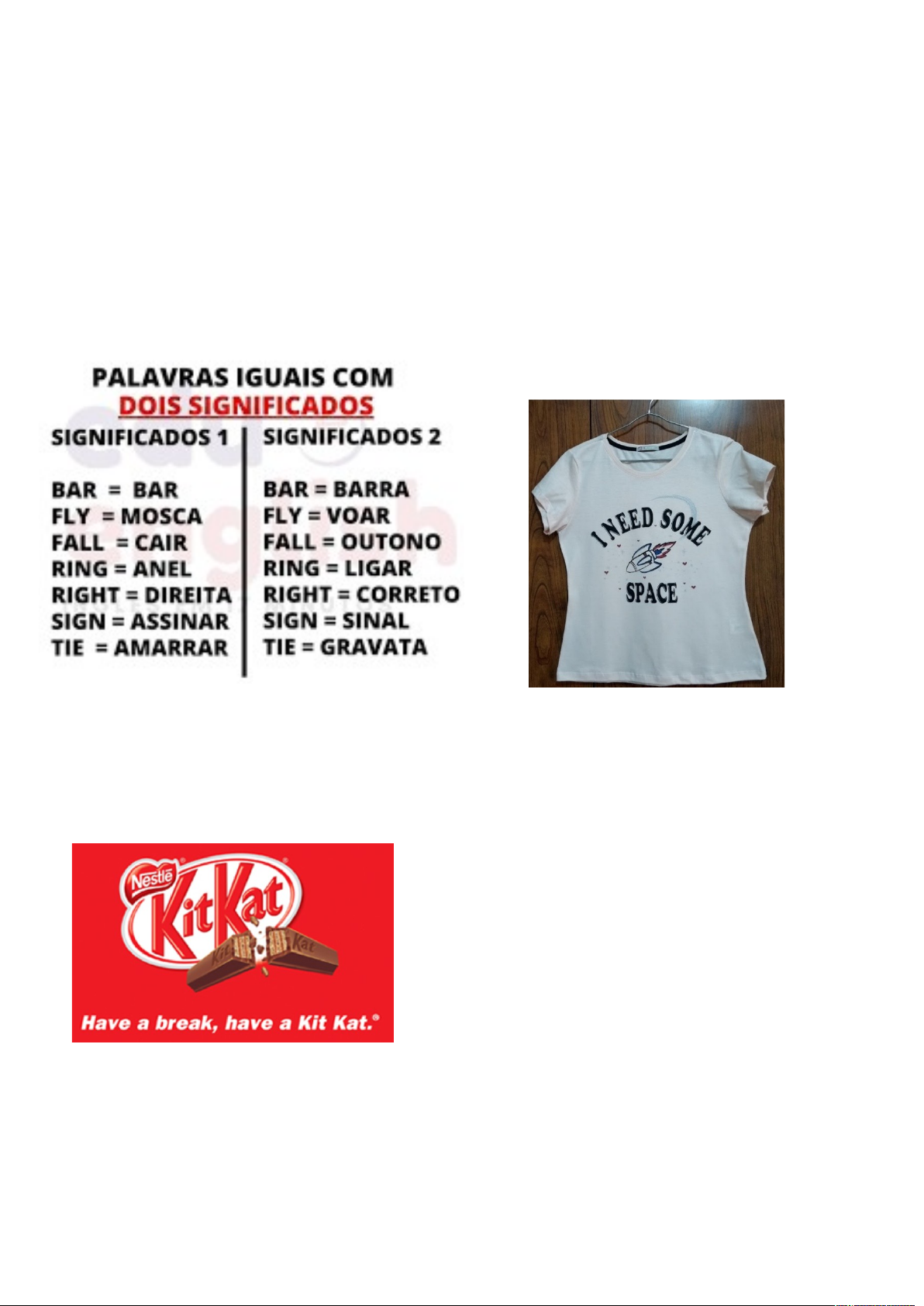 ATIVIDADE NÃO PRESENCIAL – 14ª QUINZENA - DISCIPLINA: INGLÊS SÉRIE: 7ª Nome do (a) estudante: _____________________________________ Turma: _______ POLYSEMY (POLISSEMIA). Você já ouviu falar desse termo? “Polissemia é a associação de uma palavra com dois ou mais significados distintos. Um polissema é uma palavra ou frase com vários significados. A palavra "polissemia" vem do grego para "muitos sinais." Leia os exemplos a seguir: Exemplo prático: 1. ESCREVA QUAL A PALAVRA CITADA NA CAMISETA EM INGLÊS QUE TEM DUPLO SENTIDO? ___________________ 2. QUAL O SIGNIFICADO DESSSA PALAVRA EM PORTUGUÊS:______________________________________ 3 . NA IMAGEM AO LADO TAMBÉM HÁ UMA PALAVRA EM INGLÊS QUE TEM DUPLO SENTIDO. COPIE A PALAVRA AQUI: _______________ 4. QUAL O SIGNIFICADO (TRADUÇÃO) DELA EM PORTUGUÊS: ___________________________ 5. EM QUE OUTRO SENTIDO ELA PODE SER USADA EM INGLÊS? _______________________________ 6. NA IMAGEM AO LADO TAMBÉM HÁ UMA PALAVRA EM INGLÊS QUE TEM DUPLO SENTIDO. COPIE A PALAVRA AQUI: _______________ 7. QUAL O SIGNIFICADO (TRADUÇÃO) DELA EM PORTUGUÊS: ___________________________ 8. EM QUE OUTRO SENTIDO ELA PODE SER USADA EM INGLÊS? _______________________________ 9. NAS IMAGENS ACIMA, A MESMA PALAVRA “ORDER” TRAZ SIGNIFICADOS DIFERENTES PARA OS CONTEXTOS APRESENTADOS: 9.1. QUAL O SIGNIFICADO EM PORTUGUÊS DA PALAVRA “ORDER”? ___________________________ 9.2. EXPLIQUE EM POUCAS PALAVRAS O QUE A PALAVRA “ORDER” SIGNIFICA NA IMAGEM 1: ______________________________________________________________________ 9.3. EXPLIQUE EM POUCAS PALAVRAS O QUE A PALAVRA “ORDER” SIGNIFICA NA IMAGEM 2: ___________________________________________________________________ 10. ESCREVA EM PORTUGUÊS DOIS SIGNIFICADOS DIFERENTES PARA AS PALAVRAS EM INGLÊS ABAIXO: 10.1. LIGHT: ____________________ / ____________________________ 10.2. WATCH: ____________________ / ____________________________ 10.3. FIRE: ____________________ / ____________________________ 10.4. POOL: ____________________ / ____________________________ image4.png image5.png image1.png image2.jpeg image3.png