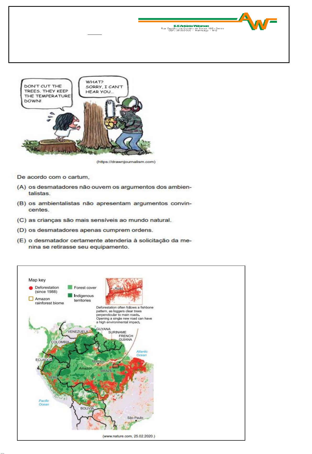 AVALIAÇÃO 4º BIMESTRE - Disciplina: Língua Estrangeira – Inglês Professora: Emanuelle Data: ____/____/2021 Turma: 7º ______ Valor: 10,0 Nota: _______ Aluno: _______________________________________________________________________ Observe a imagem para responder a questão 1: Questão 1: Analise o mapa para responder as questões 2 e 3 : Questão 3: Read the text and answer question 1. Questão 4 The modal verb CAN in “but we can stop sharing it” conveys the idea of __________. a) certainty b) obligation c) permission d) possibility TEXT: Celebration – kool and The Gang – Listening, reading and practicing Yahoo! This is your celebration (2x) Celebrate good times, come on! (Let’s celebrate) (2x) There’s a party goin’ on right here A celebration to last throughout the years So bring your good times, and your laughter too We gonna celebrate your party with you Come on now Celebration Let’s all celebrate and have a good time Celebration Questão 2: We gonna celebrate and have a good time It’s time to come together It’s up to you, what’s your pleasure Everyone around the world Come on! Yahoo! It’s a celebration Yahoo! Celebrate good times, come on! (2x) It’s a celebration(2x) We’re gonna have a good time tonight (3x) Let’s celebrate, it’s all right(3x) Baby… Yahoo! Yahoo! Celebrate good times, come on! (Let’s celebrate) Celebrate good times, come on! It’s a celebration! Celebrate good times, come on! (Let’s celebrate) Come on and celebrate, tonight (Celebrate good times, come on!) ‘Cause everything’s gonna be all right Let’s celebrate (Celebrate good times, come on) Link: http://www.vagalume.com.br/kool- Celebração - kool e a turma - ouvir, ler e praticar Yahoo! Esta é a sua comemoração (2x) Comemore os bons momentos, vamos lá! (Vamos comemorar) (2x) Tem uma festa acontecendo bem aqui Uma celebração para durar ao longo dos anos Então traga seus bons momentos e suas risadas também Vamos celebrar sua festa com você Venha agora Celebração Vamos todos comemorar e nos divertir Celebração Vamos comemorar e nos divertir É hora de nos unirmos Depende de você, qual é o seu prazer Todos ao redor do mundo Vamos! Yahoo! É uma celebração Yahoo! Comemore os bons momentos, vamos lá! (2x) É uma celebração (2x) Vamos nos divertir hoje à noite (3x) Vamos comemorar, está tudo bem (3x) Baby ... Yahoo! Yahoo! Comemore os bons momentos, vamos lá! (Vamos celebrar) Comemore os bons momentos, vamos lá! É uma celebração! Comemore os bons momentos, vamos lá! (Vamos celebrar) Venha e comemore, esta noite (Comemore os bons momentos, vamos lá!) 'Porque tudo vai ficar bem Vamos comemorar (comemore os bons tempos, vamos lá) Responda em Português: 4. You liked the song? 5. What kind of music do you like? 6. How does music make you feel? 7. How often do you listen to music? 8. If you were a song, what song would you be and why? 9. What is one of your favorite songs? 10. Who sings it?
