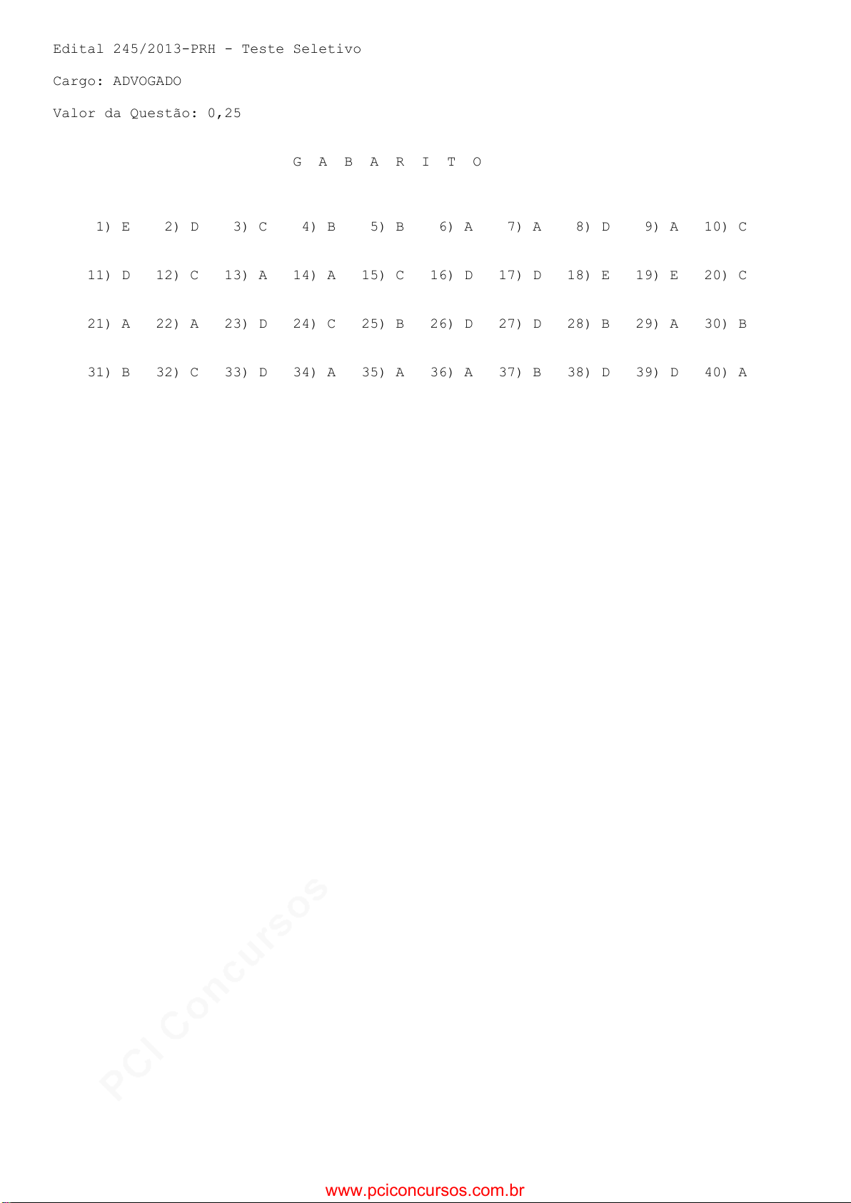 pcimarkpci MjgwNDo2ZmU4OjAxZDU6ZTcwMDpiYzJjOmNkZTI6MjJmOTo0M2Nh:V2VkLCAyNSBGZWIgMjAyNiAyMzowMjowOSAtMDMwMA== www.pciconcursos.com.br Edital 245/2013-PRH - Teste Seletivo Cargo: ADVOGADO Valor da Questão: 0,25 G A B A R I T O 1) E 2) D 3) C 4) B 5) B 6) A 7) A 8) D 9) A 10) C 11) D 12) C 13) A 14) A 15) C 16) D 17) D 18) E 19) E 20) C 21) A 22) A 23) D 24) C 25) B 26) D 27) D 28) B 29) A 30) B 31) B 32) C 33) D 34) A 35) A 36) A 37) B 38) D 39) D 40) A www.pciconcursos.com.br pcimarkpci MjgwNDo2ZmU4OjAxZDU6ZTcwMDpiYzJjOmNkZTI6MjJmOTo0M2Nh:V2VkLCAyNSBGZWIgMjAyNiAyMzowMjowOSAtMDMwMA== www.pciconcursos.com.br Edital 245/2013-PRH - Teste Seletivo Cargo: BIÓLOGO Valor da Questão: 0,25 G A B A R I T O 1) A 2) A 3) B 4) A 5) A 6) A 7) B 8) B 9) B 10) C 11) C 12) D 13) C 14) B 15) A 16) E 17) D 18) D 19) B 20) C 21) B 22) E 23) C 24) C 25) E 26) B 27) A 28) D 29) B 30) A 31) A 32) B 33) D 34) C 35) E 36) A 37) E 38) B 39) D 40) A www.pciconcursos.com.br pcimarkpci MjgwNDo2ZmU4OjAxZDU6ZTcwMDpiYzJjOmNkZTI6MjJmOTo0M2Nh:V2VkLCAyNSBGZWIgMjAyNiAyMzowMjowOSAtMDMwMA== www.pciconcursos.com.br Edital 245/2013-PRH - Teste Seletivo Cargo: MOTORISTA Valor da Questão: 0,25 G A B A R I T O 1) D 2) A 3) C 4) E 5) B 6) A 7) B 8) C 9) E 10) A 11) B 12) D 13) E 14) A 15) A 16) C 17) B 18) E 19) D 20) B 21) C 22) C 23) A 24) E 25) A 26) B 27) D 28) E 29) D 30) B 31) A 32) C 33) E 34) A 35) E 36) D 37) B 38) C 39) E 40) C www.pciconcursos.com.br pcimarkpci MjgwNDo2ZmU4OjAxZDU6ZTcwMDpiYzJjOmNkZTI6MjJmOTo0M2Nh:V2VkLCAyNSBGZWIgMjAyNiAyMzowMjowOSAtMDMwMA== www.pciconcursos.com.br Edital 245/2013-PRH - Teste Seletivo Cargo: AUXILIAR OPERACIONAL (APOIO ADMINISTRATIVO ) - GOIOERÊ Valor da Questão: 0,25 G A B A R I T O 1) A 2) E 3) D 4) D 5) E 6) C 7) A 8) C 9) D 10) B 11) B 12) B 13) A 14) B 15) C 16) E 17) D 18) C 19) D 20) B 21) A 22) C 23) E 24) D 25) E 26) C 27) C 28) B 29) B 30) A 31) C 32) D 33) A 34) B 35) D 36) D 37) C 38) E 39) D 40) E www.pciconcursos.com.br pcimarkpci MjgwNDo2ZmU4OjAxZDU6ZTcwMDpiYzJjOmNkZTI6MjJmOTo0M2Nh:V2VkLCAyNSBGZWIgMjAyNiAyMzowMjowOSAtMDMwMA== www.pciconcursos.com.br Edital 245/2013-PRH - Teste Seletivo Cargo: AUXILIAR OPERACIONAL (AGROPECUÁRIA) - CIDADE GAÚCHA Valor da Questão: 0,25 G A B A R I T O 1) A 2) E 3) D 4) D 5) E 6) C 7) A 8) C 9) D 10) E 11) B 12) D 13) B 14) A 15) C 16) B 17) B 18) C 19) D 20) B 21) A 22) C 23) E 24) D 25) E 26) C 27) C 28) B 29) A 30) B 31) A 32) B 33) C 34) C 35) D 36) B 37) D 38) A 39) D 40) E www.pciconcursos.com.br pcimarkpci MjgwNDo2ZmU4OjAxZDU6ZTcwMDpiYzJjOmNkZTI6MjJmOTo0M2Nh:V2VkLCAyNSBGZWIgMjAyNiAyMzowMjowOSAtMDMwMA== www.pciconcursos.com.br Edital 245/2013-PRH - Teste Seletivo Cargo: AUXILIAR OPERACIONAL (AGROPECUÁRIA) - FAZENDA DO CAMPUS DE UMUARAMA Valor da Questão: 0,25 G A B A R I T O 1) A 2) E 3) D 4) D 5) E 6) C 7) A 8) C 9) D 10) E 11) B 12) D 13) B 14) A 15) C 16) B 17) B 18) C 19) D 20) B 21) A 22) C 23) E 24) D 25) E 26) C 27) C 28) B 29) A 30) B 31) A 32) B 33) C 34) C 35) D 36) B 37) D 38) A 39) D 40) E www.pciconcursos.com.br pcimarkpci MjgwNDo2ZmU4OjAxZDU6ZTcwMDpiYzJjOmNkZTI6MjJmOTo0M2Nh:V2VkLCAyNSBGZWIgMjAyNiAyMzowMjowOSAtMDMwMA== www.pciconcursos.com.br Edital 245/2013-PRH - Teste Seletivo Cargo: AUXILIAR OPERACIONAL (AGROPECUÁRIA) - DIAMANTE DO NORTE Valor da Questão: 0,25 G A B A R I T O 1) A 2) E 3) D 4) D 5) E 6) C 7) A 8) C 9) D 10) E 11) B 12) D 13) B 14) A 15) C 16) B 17) B 18) C 19) D 20) B 21) A 22) C 23) E 24) D 25) E 26) C 27) C 28) B 29) A 30) B 31) A 32) B 33) C 34) C 35) D 36) B 37) D 38) A 39) D 40) E www.pciconcursos.com.br pcimarkpci MjgwNDo2ZmU4OjAxZDU6ZTcwMDpiYzJjOmNkZTI6MjJmOTo0M2Nh:V2VkLCAyNSBGZWIgMjAyNiAyMzowMjowOSAtMDMwMA== www.pciconcursos.com.br Edital 245/2013-PRH - Teste Seletivo Cargo: AUXILIAR OPERACIONAL (AGROPECUÁRIA) - FAZENDA DE IGUATEMI Valor da Questão: 0,25 G A B A R I T O 1) A 2) E 3) D 4) D 5) E 6) C 7) A 8) C 9) D 10) E 11) B 12) D 13) B 14) A 15) C 16) B 17) B 18) C 19) D 20) B 21) A 22) C 23) E 24) D 25) E 26) C 27) C 28) B 29) A 30) B 31) A 32) B 33) C 34) C 35) D 36) B 37) D 38) A 39) D 40) E www.pciconcursos.com.br pcimarkpci MjgwNDo2ZmU4OjAxZDU6ZTcwMDpiYzJjOmNkZTI6MjJmOTo0M2Nh:V2VkLCAyNSBGZWIgMjAyNiAyMzowMjowOSAtMDMwMA== www.pciconcursos.com.br Edital 245/2013-PRH - Teste Seletivo Cargo: AUXILIAR OPERACIONAL (LABORATÓRIO) - FAZENDA DE IGUATEMI Valor da Questão: 0,25 G A B A R I T O 1) A 2) E 3) D 4) D 5) E 6) C 7) A 8) C 9) D 10) E 11) B 12) D 13) B 14) A 15) C 16) B 17) B 18) C 19) D 20) B 21) A 22) C 23) E 24) D 25) E 26) C 27) C 28) B 29) B 30) A 31) D 32) C 33) A 34) C 35) B 36) B 37) E 38) C 39) D 40) E www.pciconcursos.com.br pcimarkpci MjgwNDo2ZmU4OjAxZDU6ZTcwMDpiYzJjOmNkZTI6MjJmOTo0M2Nh:V2VkLCAyNSBGZWIgMjAyNiAyMzowMjowOSAtMDMwMA== www.pciconcursos.com.br Edital 245/2013-PRH - Teste Seletivo Cargo: AUXILIAR OPERACIONAL (LIMPEZA) Valor da Questão: 0,25 G A B A R I T O 1) A 2) E 3) D 4) D 5) E 6) C 7) A 8) C 9) D 10) E 11) B 12) D 13) B 14) A 15) C 16) B 17) B 18) C 19) D 20) B 21) A 22) C 23) E 24) D 25) E 26) C 27) C 28) B 29) A 30) B 31) A 32) B 33) C 34) C 35) D 36) B 37) D 38) A 39) D 40) E www.pciconcursos.com.br pcimarkpci MjgwNDo2ZmU4OjAxZDU6ZTcwMDpiYzJjOmNkZTI6MjJmOTo0M2Nh:V2VkLCAyNSBGZWIgMjAyNiAyMzowMjowOSAtMDMwMA== www.pciconcursos.com.br Edital 245/2013-PRH - Teste Seletivo Cargo: QUÍMICO Valor da Questão: 0,25 G A B A R I T O 1) A 2) B 3) C 4) C 5) D 6) E 7) A 8) B 9) C 10) D 11) E 12) A 13) E 14) B 15) C 16) D 17) E 18) A 19) B 20) C 21) D 22) E 23) A 24) B 25) C 26) D 27) E 28) A 29) B 30) C 31) A 32) B 33) D 34) C 35) E 36) A 37) E 38) B 39) D 40) A www.pciconcursos.com.br pcimarkpci MjgwNDo2ZmU4OjAxZDU6ZTcwMDpiYzJjOmNkZTI6MjJmOTo0M2Nh:V2VkLCAyNSBGZWIgMjAyNiAyMzowMjowOSAtMDMwMA== www.pciconcursos.com.br Edital 245/2013-PRH - Teste Seletivo Cargo: TÉCNICO EM INFORMÁTICA Valor da Questão: 0,25 G A B A R I T O 1) B 2) A 3) C 4) E 5) E 6) B 7) D 8) D 9) A 10)D 11) C 12) A 13) C 14) C 15) E 16) D 17) C 18) E 19) C 20) B 21) D 22) C 23) B 24) C 25) A 26) A