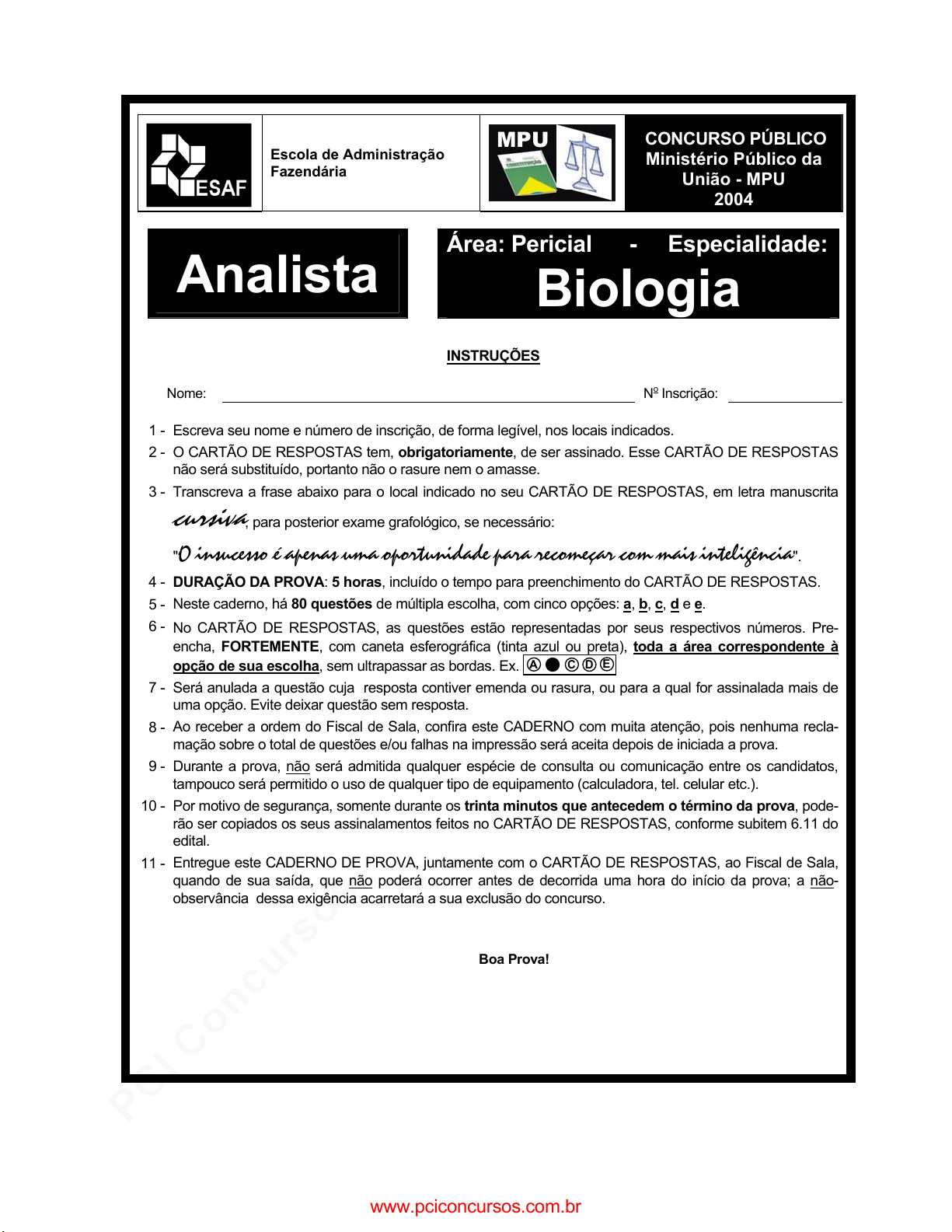pcimarkpci MjgwNDo2ZmU4OjAxZDU6ZTcwMDpiYzJjOmNkZTI6MjJmOTo0M2Nh:V2VkLCAyNSBGZWIgMjAyNiAyMzowNjoyMSAtMDMwMA== www.pciconcursos.com.br Escola de Administração Fazendária CONCURSO PÚBLICO Ministério Público da União - MPU 2004 Analista Área: Pericial - Especialidade: Biologia INSTRUÇÕES Nome: No Inscrição: 1 - Escreva seu nome e número de inscrição, de forma legível, nos locais indicados. 2 - O CARTÃO DE RESPOSTAS tem, obrigatoriamente, de ser assinado. Esse CARTÃO DE RESPOSTAS não será substituído, portanto não o rasure nem o amasse. 3 - Transcreva a frase abaixo para o local indicado no seu CARTÃO DE RESPOSTAS, em letra manuscrita cursiva, para posterior exame grafológico, se necessário: "O insucesso é apenas uma oportunidade para recomeçar com mais inteligência". 4 - DURAÇÃO DA PROVA: 5 horas, incluído o tempo para preenchimento do CARTÃO DE RESPOSTAS. 5 - Neste caderno, há 80 questões de múltipla escolha, com cinco opções: a, b, c, d e e. 6 - No CARTÃO DE RESPOSTAS, as questões estão representadas por seus respectivos números. Pre- encha, FORTEMENTE, com caneta esferográfica (tinta azul ou preta), toda a área correspondente à opção de sua escolha, sem ultrapassar as bordas. Ex. 7 - Será anulada a questão cuja resposta contiver emenda ou rasura, ou para a qual for assinalada mais de uma opção. Evite deixar questão sem resposta. 8 - Ao receber a ordem do Fiscal de Sala, confira este CADERNO com muita atenção, pois nenhuma recla- mação sobre o total de questões e/ou falhas na impressão será aceita depois de iniciada a prova. 9 - Durante a prova, não será admitida qualquer espécie de consulta ou comunicação entre os candidatos, tampouco será permitido o uso de qualquer tipo de equipamento (calculadora, tel. celular etc.). 10 - Por motivo de segurança, somente durante os trinta minutos que antecedem o término da prova, pode- rão ser copiados os seus assinalamentos feitos no CARTÃO DE RESPOSTAS, conforme subitem 6.11 do edital. 11 - Entregue este CADERNO DE PROVA, juntamente com o CARTÃO DE RESPOSTAS, ao Fiscal de Sala, quando de sua saída, que não poderá ocorrer antes de decorrida uma hora do início da prova; a não- observância dessa exigência acarretará a sua exclusão do concurso. Boa Prova! MPU A B C D E www.pciconcursos.com.br pcimarkpci MjgwNDo2ZmU4OjAxZDU6ZTcwMDpiYzJjOmNkZTI6MjJmOTo0M2Nh:V2VkLCAyNSBGZWIgMjAyNiAyMzowNjoyMSAtMDMwMA== www.pciconcursos.com.br Analista - TCU - 2004 Área: Pericial - Especialidade: Biologia 2 LÍNGUA PORTUGUESA Leia os itens seguintes, que formam um texto, para res- ponder às questões 01 e 02. 01- Marque o item que expressa o tema central desse texto. a) Se a data da Abolição marcará no Brasil o fim do predomínio agrário, o quadro político instituído no ano seguinte quer responder à conveniência de uma forma adequada à nova composição social. b) Existe um elo secreto estabelecendo entre esses dois acontecimentos e numerosos outros uma revolução lenta, mas segura e concertada, a única que, rigorosamente, temos experimentado em toda a nossa vida nacional. c) Processa-se, é certo, sem o grande alarde de al- gumas convulsões de superfície, que os historia- dores exageram freqüentemente em seu zelo, minucioso e fácil, de compendiar as transforma- ções exteriores da existência dos povos. d) Perto dessa revolução, a maioria de nossas agita- ções do período republicano, como as suas simila- res das nações da América espanhola, parecem desvios na trajetória da vida política legal do Esta- do comparáveis a essas antigas “revoluções pala- cianas”, e) tão familiares aos conhecedores da história euro- péia. (Sérgio Buarque de Holanda) 02- Marque V diante das asserções corretas e F diante das falsas e depois escolha a seqüência certa. ( ) Em: “Se a data da Abolição marcará no Brasil o fim do predomínio agrário ...”, ( .1 e 2 da opção a da questão 01) empregando-se no presente a forma verbal, altera-se o sentido do enunciado. ( ) Em “... estabelecendo entre esses dois aconteci- mentos e numerosos outros uma revolução len- ta...” ( .1, 2 e 3 da opção b da questão 01), o autor pode- ria ter usado uma oração adjetiva desenvolvida mantendo o mesmo sentido. ( ) Em “...temos experimentado em toda a nossa vida nacional...” ( .4 e 5 da opção b da questão 01), pode-se dispensar o artigo sem prejuízo da ortodoxia gra- matical. ( ) Em “Processa-se, é certo, sem o grande alarde de algumas convulsões de superfície...” ( .1 e 2 da op- ção c da questão 01), o sujeito implícito é “elo secre- to”. ( ) Em “comparáveis a essas antigas revoluções pa- lacianas” ( . 5 e 6 da opção d da questão 01), o termo sublinhado opõe-se conceitualmente, no texto, a “revolução lenta, mas segura e concertada” ( . 3 da opção b da questão 01). a) V, F, F, V, V b) F, V, V, F, V c) F, V, F, F, V d) F, V, V, F, F e) F, F, V, V, F 03- Entre as diferentes versões do mesmo texto, escolha a que representa a melhor opção estilística. a) Os portugueses foram pioneiros da conquista do trópico para a civilização e eles tiveram, nessa proeza, sua maior missão histórica. E sem em- bargo de tudo quanto se possa alegar contra sua obra, forçoso é reconhecer que eles foram não somente os portadores efetivos como os portado- res naturais dessa missão. Nenhum outro povo do Velho Mundo achou-se tão bem armado para se aventurar à exploração regular e intensa das ter- ras próximas da linha equinocial, onde os homens depressa degeneram, segundo o conceito genera- lizado na era quinhentista. b) Foram os portugueses os pioneiros da conquista do trópico para a civilização, tendo nessa proeza sua maior missão histórica. Não obstante tudo quanto se possa alegar contra sua obra, forçoso é reconhecer que eles foram não somente os por- tadores efetivos como os portadores naturais des- sa missão. Nenhum outro povo do Velho 