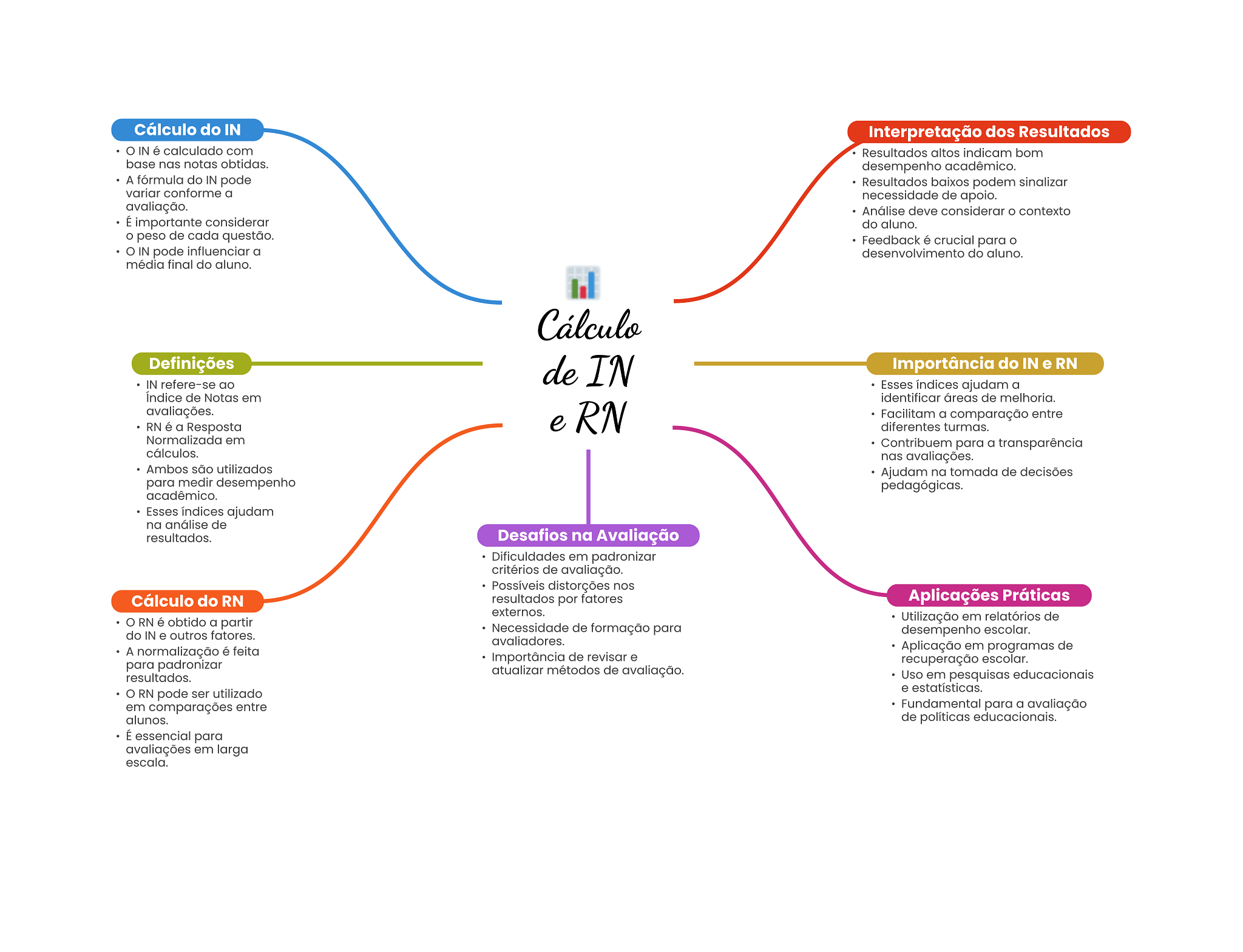 Cálculo do IN Interpretação dos Resultados IN é calculado com Resultados altos indicam bom base nas notas obtidas. desempenho acadêmico. A fórmula do IN pode Resultados baixos podem sinalizar variar conforme a necessidade de apoio. avaliação. Análise deve considerar contexto É importante considerar do aluno. peso de cada questão. Feedback é crucial para IN pode influenciar a desenvolvimento do aluno. média final do aluno. Cálculo Definições de IN Importância do IN e RN IN refere-se ao Esses índices ajudam a Indice de Notas em identificar áreas de melhoria. avaliações. e RN Facilitam a comparação entre RN é a Resposta diferentes turmas. Normalizada em Contribuem para a transparência cálculos. nas avaliações. Ambos são utilizados Ajudam na tomada de decisões para medir desempenho pedagógicas. acadêmico. Esses ajudam na análise de resultados. Desafios na Avaliação Dificuldades em padronizar critérios de avaliação. Possíveis distorções nos Cálculo do RN resultados por fatores Aplicações Práticas externos. RN é obtido a partir Utilização em relatórios de do IN e outros fatores. Necessidade de formação para desempenho escolar. avaliadores. A normalização é feita Aplicação em programas de Importância de revisar e para padronizar recuperação escolar. atualizar métodos de avaliação. resultados. Uso em pesquisas educacionais e estatísticas. RN pode ser utilizado em comparações entre Fundamental para a avaliação alunos. de políticas educacionais. É essencial para avaliações em larga escala.