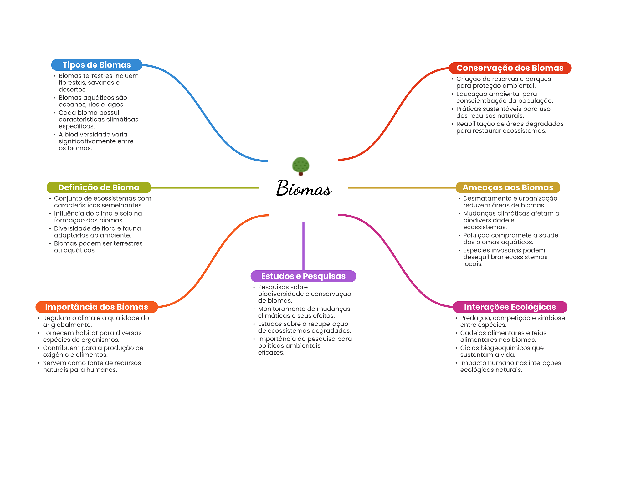 Tipos de Biomas Conservação dos Biomas Biomas terrestres incluem florestas, savanas e Criação de reservas e parques desertos. para proteção ambiental. Educação ambiental para Biomas aquáticos são oceanos, rios e lagos. conscientização da população. Práticas sustentáveis para uso Cada bioma possui dos recursos naturais. características climáticas específicas. Reabilitação de áreas degradadas A biodiversidade varia para restaurar ecossistemas. significativamente entre biomas. Definição de Bioma Biomas Ameaças aos Biomas Conjunto de ecossistemas com Desmatamento e urbanização características semelhantes. reduzem áreas de biomas. Influência do clima e solo na Mudanças climáticas afetam a formação dos biomas. biodiversidade e Diversidade de flora e fauna ecossistemas. adaptadas ao ambiente. Poluição compromete a saúde Biomas podem ser terrestres dos biomas aquáticos. ou aquáticos. Espécies invasoras podem desequilibrar ecossistemas locais. Estudos e Pesquisas Pesquisas sobre biodiversidade e conservação de biomas. Importância dos Biomas Monitoramento de mudanças Interações Ecológicas Regulam clima e a qualidade do climáticas e seus efeitos. Predação, competição e simbiose ar globalmente. Estudos sobre a recuperação entre espécies. Fornecem habitat para diversas de ecossistemas degradados. Cadeias alimentares e teias espécies de organismos. Importância da pesquisa para alimentares nos biomas. Contribuem para a produção de políticas ambientais Ciclos biogeoquímicos que oxigênio e alimentos. eficazes. sustentam a vida. Servem como fonte de recursos Impacto humano nas interações naturais para humanos. ecológicas naturais.