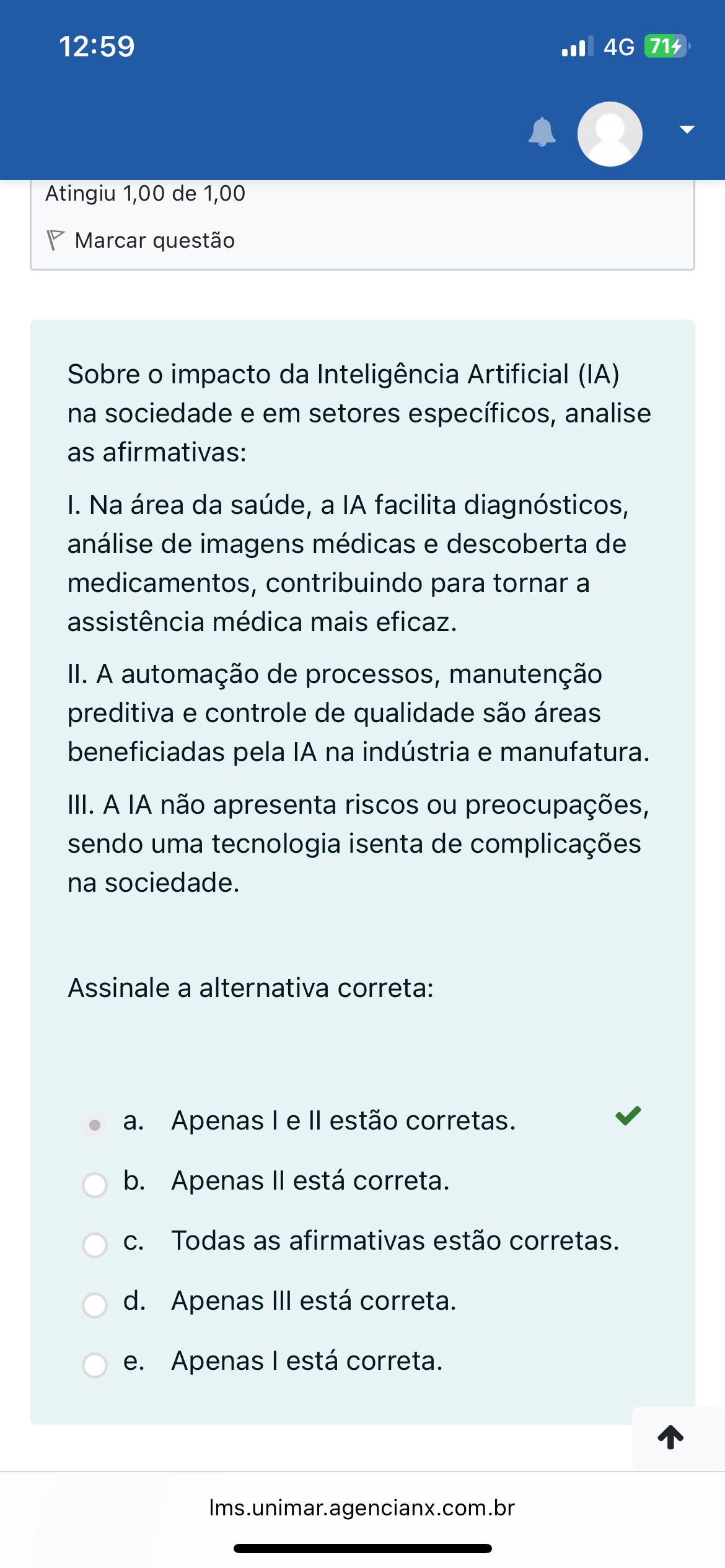 12:59 4G 714 Atingiu 1,00 de 1,00 Marcar questão Sobre impacto da Inteligência Artificial (IA) na sociedade e em setores específicos, analise as afirmativas: I. Na área da saúde, a IA facilita diagnósticos, análise de imagens médicas e descoberta de medicamentos, contribuindo para tornar a assistência médica mais eficaz. II. A automação de processos, manutenção preditiva e controle de qualidade são áreas beneficiadas pela IA na indústria e manufatura. III. A IA não apresenta riscos ou preocupações, sendo uma tecnologia isenta de complicações na sociedade. Assinale a alternativa correta: a. Apenas e estão corretas. b. Apenas está correta. Todas as afirmativas estão corretas. d. Apenas III está correta. e. Apenas está correta. Ims.unimar.agencianx.com.br