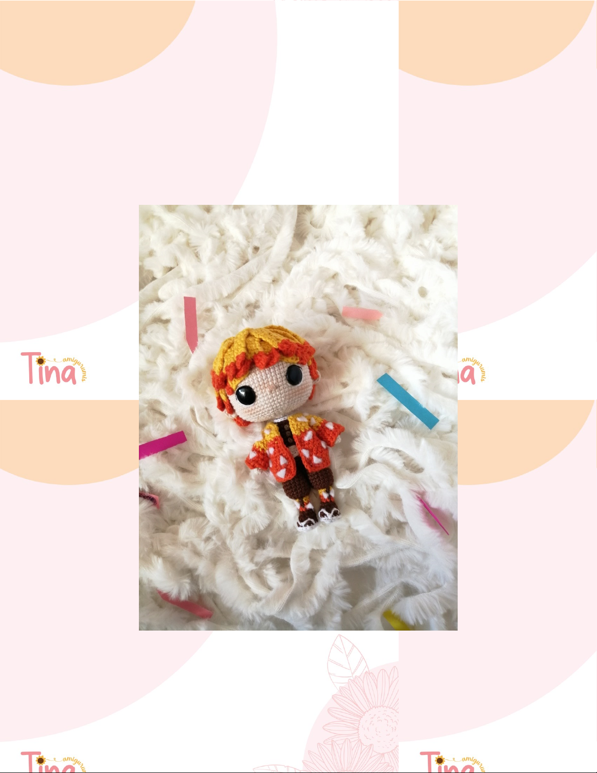 Diseño realizado por: Alexandra Lévano 2023 – Tina Amigurumis – Diseño realizado por Alexandra Lévano - Derechos Reservados – Queda prohibido alterar, reproducir o vender el presente patrón en ningún sitio web. Recuerda dar los créditos correspondientes. Zenitsu Agatsuma Diseño realizado por: Alexandra Lévano 2023 – Tina Amigurumis – Diseño realizado por Alexandra Lévano - Derechos Reservados – Queda prohibido alterar, reproducir o vender el presente patrón en ningún sitio web. Recuerda dar los créditos correspondientes. ¡HOLA! Hola queridx crocheterx, gracias por adquirir este patrón, este diseño ha sido realizado con mucho cariño. Este es un patrón de nivel intermedio y quiero que sepas que ante cualquier duda puedes enviarme un mensajito a @tina_amigurumis, estaré encantada de ayudarte. Recuerda etiquetarme para ver tu hermoso resultado, me haría demasiado feliz verlo. Por favor, recuerda que cada patrón toma mucho tiempo y dedicación, queda PROHIBIDO compartir, alterar o revender este documento sin autorización. Puedes vender el producto final al precio que creas conveniente. No quería dejar de mencionar mi agradecimiento a cada unx de ustedes, por hacer esto posible y por inspirarme a siempre brindarles lo mejor. ACERCA DE TINA Este lindo proyecto nació gracias a mi abuela , como un tributo a quien fue una de las mejores personas que estuvieron en mi vida, una buena madre, una buena esposa, que sin duda dejó huella en nuestros corazones. A pesar de que se fue hace 13 años, su recuerdo sigue intacto. También tengo que mencionar a mi tía Antonia, quien tampoco está con nosotros, pero era la persona con más arte que conocí, sabía tejer a crochet a una velocidad que aún no puedo superar, hacía muñecas de tela, bordaba en punto cruz, etc. Fue verla lo que me inspiró a aprender a tejer. Tina nace un 13 de julio del 2020, gracias a Ariana y a María, mis primas quienes me convencieron de dar a conocer mi trabajo. Igual y este espacio me sirve para agradecer a mi familia por todo el apoyo que me han brindado. Abuelita Tina, tía Antonia, las extraño todos los días, gracias por inspirarme y enseñarme tanto. Diseño realizado por: Alexandra Lévano 2023 – Tina Amigurumis – Diseño realizado por Alexandra Lévano - Derechos Reservados – Queda prohibido alterar, reproducir o vender el presente patrón en ningún sitio web. Recuerda dar los créditos correspondientes. MATERIALES • Crochet 2mm • Hilos de algodón NORELI – LA COLONIAL 100% algodón (4 cabos) Blanco (1102), color para la piel (3002), marrón (5902), amarillo (2702), gris (9202), naranja (2902) • Ojos de seguridad de 12mm • Hilo de bordar negro • Alambre, alicate • Aguja lanera • Napa o algodón sintético • Silicona fría/caliente (a elección) • Tela en fieltro color blanco • Alfileres • Maquillaje para detalles • Tijera ABREVIACIONES Am: Anillo Mágico Pb: punto bajo Pd: punto deslizado Cad: cadena Mpa: medio punto alto Pa: punto alto Aum: aumento Dism: disminución BLO: back loop o hebra trasera FLO: front loop o hebra delantera V: vuelta Rnd: ronda CyV: Cadena y vuelta M: Mechón () x n: Repite lo del paréntesis n cantidad de veces *n*: n cantidad de puntos en la misma cadena Diseño realizado por: Alexandra Lévano 2023 – Tina Amigurumis – Diseño realizado por Alexandra Lévano - Derechos Reservados – Queda prohibido alterar, reproducir o vender el presente patrón en ningún sitio web. Recuerda dar los créditos correspondientes. CUERPO Comenzaremos por las piernas, si quieres articular tu amigurumi, rellena el cuerpo al final, si no lo articularás puedes rellenar el cuerpo conforme tejes. PRIMERA PIERNA Comenzaremos con el color blanco Haz 4cad Rnd 1: 1aum, 1pb, *4mpa*, 1pb, 1aum (10) Rnd 2: 1aum, 2pb, 4aum, 2pb, 1aum (16) *cambia a color marrón* Rnd 3: BLO 16pb (16) Rnd 4: 16pb (16) Rnd 5: 4pb, 4dism, 4pb (12) Rnd 6: 3pb, 3dism, 3pb (9) *puedes rellenar el piecito y te recomiendo dejar la hebra marrón en espera ya que en este punto iremos intercalando colores* *cambia a color naranja* Rnd 7: FLO 9pb (9) Rnd 8: 3pb, 1pb, 5pb (9) *cambia a amarillo* Rnd 9 – Rnd 10: 3pb, 1pb, 5pb (9) *2 rondas* *cambia a color marrón* Rnd 11: FLO 9aum (18) Rnd 12 – Rnd 15: 18pb (18) *4 rondas* Rnd 16: (4pb, 1dism) x3 (15) Rnd 17 – Rnd 18: 15pb (15) *2 rondas* *haz un pd y corta dejando una hebra corta que luego esconderemos* Diseño realizado por: Alexandra Lévano 2023 – Tina Amigurumis – Diseño realizado por Alexandra Lévano - Derechos Reservados – Queda prohibido alterar, reproducir o vender el presente patrón en ningún sitio web. Recuerda dar los créditos correspondientes. SEGUNDA PIERNA, UNIÓN Y CUERPO Teje la segunda pierna siguiendo los mismos pasos de la primera, esta vez no cortes el hilo y continúa tejiendo, 3pb adicionales (esto para ubicarte en el lateral de la pierna, si necesitas más o menos puntos, hazlo), luego une a la primera pierna contando 3pb desde el último punto (si necesitas colocarlo en otro punto para que queden alineadas, hazlo), marca este punto como el nuevo inicio de las rondas. Continuamos con el color marrón: Rnd 19: 15pb en la 1° pierna, 15pb en la 2° pierna (30) Rnd 20 – Rnd 22: 30pb (30) *3 rondas* Rnd 23: 4pb, 1dism, (8pb, 1dism) x2, 4pb (27) *cambia a color blanco* Rnd 24 – Rnd 25: 27pb (27) *2 rondas* *cambia a color marrón* Rnd 26: (7pb, 1dism) x3 (24) Rnd 27: 24pb (24) Rnd 28: 3pb, 1dism, (6pb, 1dism) x2, 3pb (21) Rnd 29: 21pb (21) Rnd 30: (5pb, 1dism) x3 (18) Rnd 31 – Rnd 33: 18pb (18) *3 rondas* *comienza a rellenar* *cambio al color piel* Rnd 34: BLO (1pb, 1dism) x6 (12) Rnd 35: (2pb, 1dism) x3 (9) Rnd 36 – Rnd 43: 9pb (9) *terminar de rellenar firmemente* Rnd37: (1pb, 1dism) x3 (6) *cortar y dejar hebra para cerrar* Diseño realizado por: Alexandra Lévano 2023 – Tina Amigurumis – Diseño realizado por Alexandra Lévano - Derechos Reservados – Queda prohibido alterar