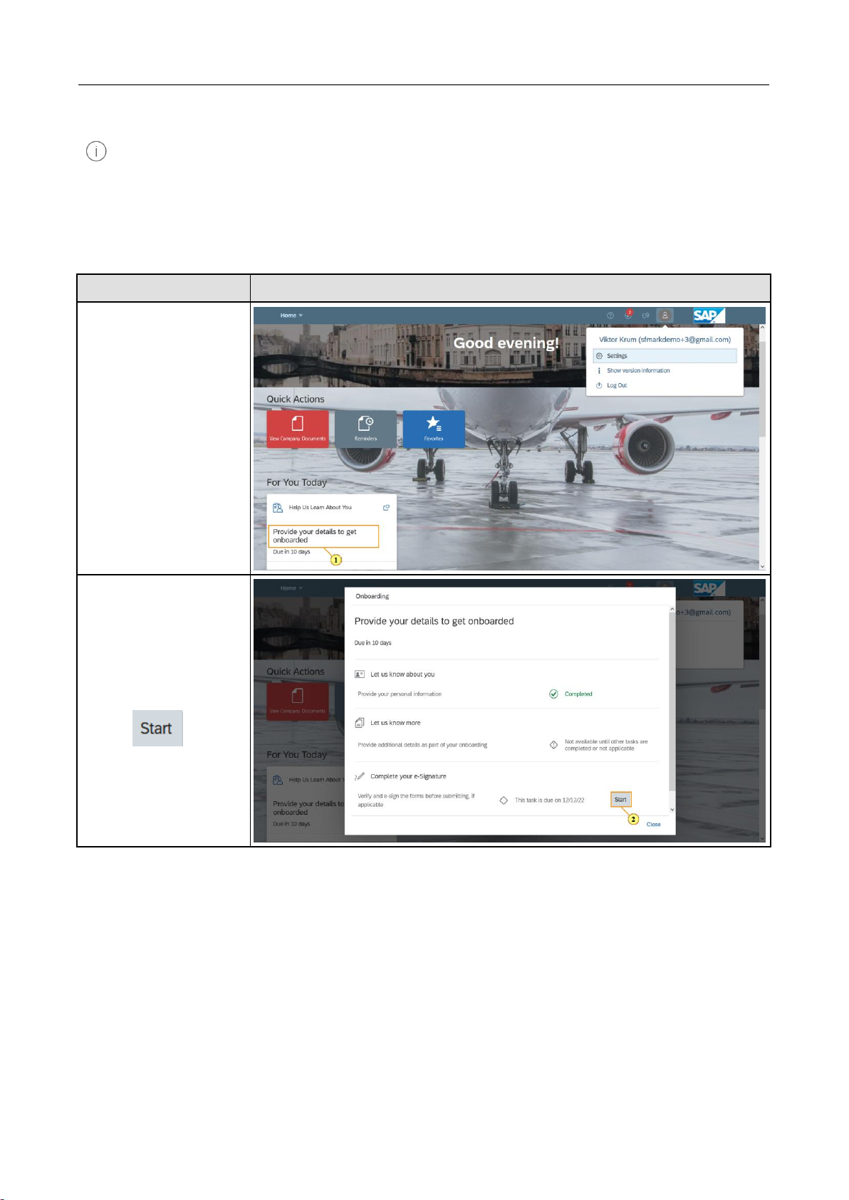 How to sign required documents 1 How to sign required documents In this demo, Viktor Krum will electronically sign a policy form as a new hire. To continue, select > Explanation Screenshot 1. In the card Help Us Learn About You, click on the link to Provide your details to get onboarded. 2. Let us know about you task shows completed. Select on the Complete your e- Signature task. How to sign required documents 2 Explanation Screenshot 3. Select the checkbox to accept the Terms and Conditions. 4. Select . 5. Scroll mouse wheel down to bring the screen to desired location and read the document. How to sign required documents 3 Explanation Screenshot 6. Select to electronically sign the document. 7. Select to submit all signed documents. How to sign required documents 4 Explanation Screenshot 9. Select to close the e-Sign Documents page. Viktor Krum has successfully signed the New Hire Policy Form required document. To complete the demo, select >8. Select to confirm submition of all signed documents.