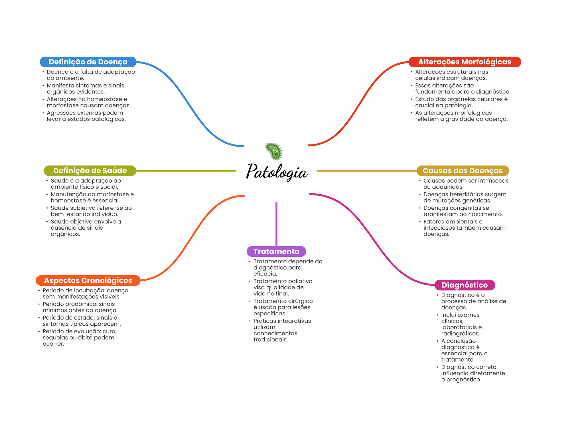Definição de Doença Alterações Morfológicas Doença é a falta de adaptação Alterações estruturais nas ao ambiente. células indicam doenças. Manifesta sintomas e sinais Essas alterações são orgânicos evidentes. fundamentais para diagnóstico. Alterações na homeostase e Estudo das organelas celulares é morfostase causam doenças. crucial na patologia. Agressões externas podem As alterações morfológicas levar a estados patológicos. refletem a gravidade da doença. Definição de Saúde Patologia Causas das Doenças Saúde é a adaptação ao Causas podem ser intrínsecas ambiente físico e social. ou adquiridas. Manutenção da morfostase e Doenças hereditárias surgem homeostase é essencial. de mutações genéticas. Saúde subjetiva refere-se ao Doenças congênitas se bem-estar do indivíduo. manifestam ao nascimento. Saúde objetiva envolve a Fatores ambientais e ausência de sinais infecciosos também causam orgânicos. doenças. Tratamento Tratamento depende do diagnóstico para eficácia. Aspectos Cronológicos Tratamento paliativo Período de incubação: doença visa qualidade de Diagnóstico vida no final. sem manifestações visíveis. Diagnóstico é O Período prodômico: sinais Tratamento cirúrgico processo de análise de mínimos antes da doença. é usado para lesões doenças. específicas. Inclui exames Período de estado: sinais e sintomas típicos aparecem. Práticas integrativas clínicos, utilizam laboratoriais e Período de evolução: cura, conhecimentos radiográficos. sequelas ou óbito podem tradicionais. A conclusão ocorrer. diagnóstica é essencial para tratamento. Diagnóstico correto influencia diretamente O prognóstico.