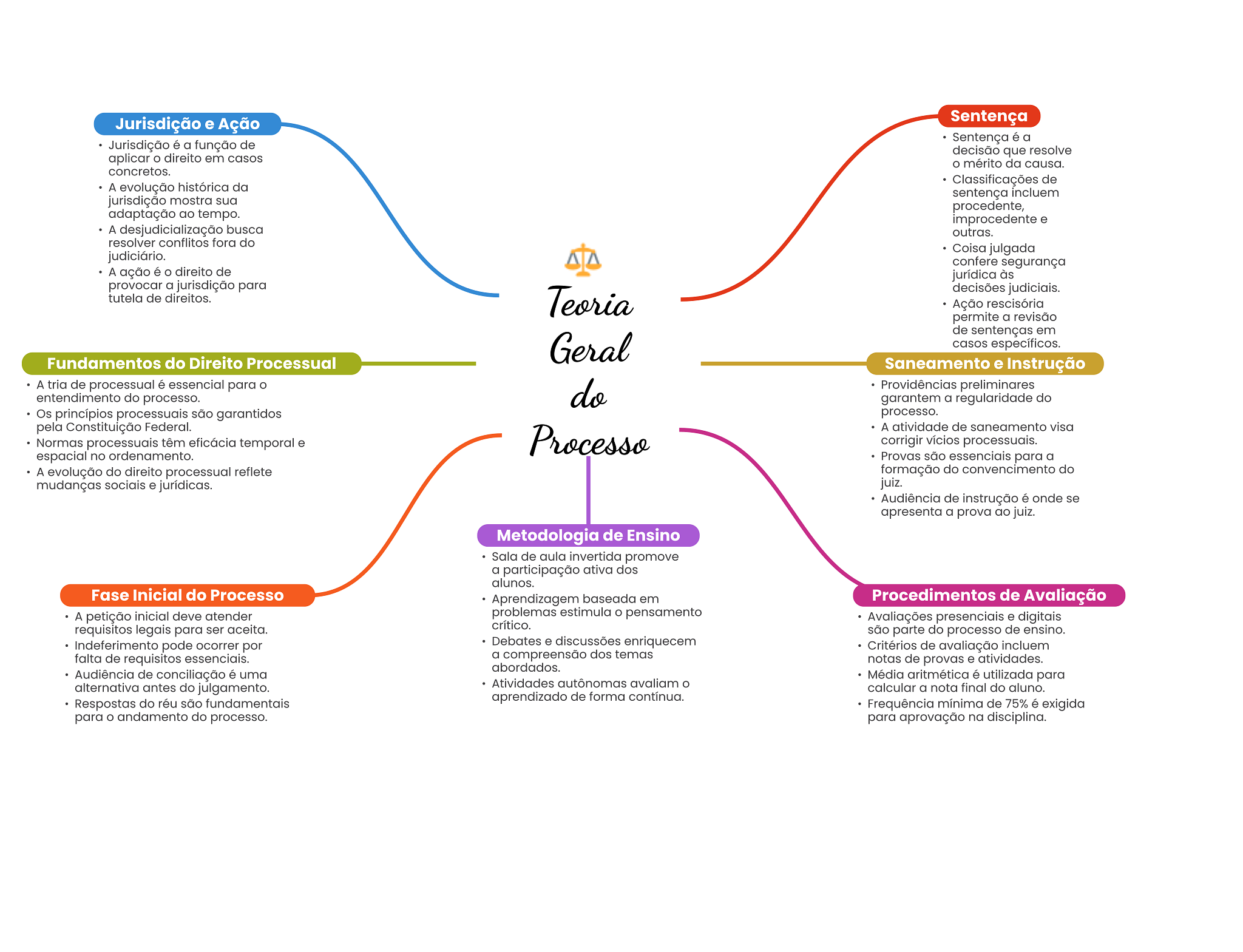 Jurisdição e Ação Sentença Sentença é a Jurisdição é a função de decisão que resolve aplicar direito em casos mérito da causa. concretos. Classificações de A evolução histórica da sentença incluem jurisdição mostra sua procedente, adaptação ao tempo. improcedente e A desjudicialização busca outras. resolver conflitos fora do Coisa julgada judiciário. confere segurança A ação é direito de jurídica às provocar a jurisdição para Teoria decisões judiciais. tutela de direitos. Ação rescisória permite a revisão de sentenças em Geral casos específicos. Fundamentos do Direito Processual Saneamento e Instrução A tria de processual é essencial para entendimento do processo. do Providências preliminares garantem a regularidade do Os princípios processuais são garantidos processo. pela Constituição Federal. A atividade de saneamento visa Normas processuais têm eficácia temporal e Processo corrigir vícios processuais. espacial no ordenamento. Provas são essenciais para a A evolução do direito processual reflete formação do convencimento do mudanças sociais e jurídicas. juiz. Audiência de instrução é onde se apresenta a prova ao juiz. Metodologia de Ensino Sala de aula invertida promove a participação ativa dos alunos. Fase Inicial do Processo Aprendizagem baseada em Procedimentos de Avaliação A petição inicial deve atender problemas estimula pensamento Avaliações presenciais e digitais requisitos legais para ser aceita. crítico. são parte do processo de ensino. Indeferimento pode ocorrer por Debates e discussões enriquecem Critérios de avaliação incluem falta de requisitos essenciais. a compreensão dos temas notas de provas e atividades. abordados. Audiência de conciliação é uma Média aritmética é utilizada para alternativa antes do julgamento. Atividades autônomas avaliam calcular a nota final do aluno. Respostas do réu são fundamentais aprendizado de forma contínua. Frequência mínima de 75% é exigida para andamento do processo. para aprovação na disciplina.