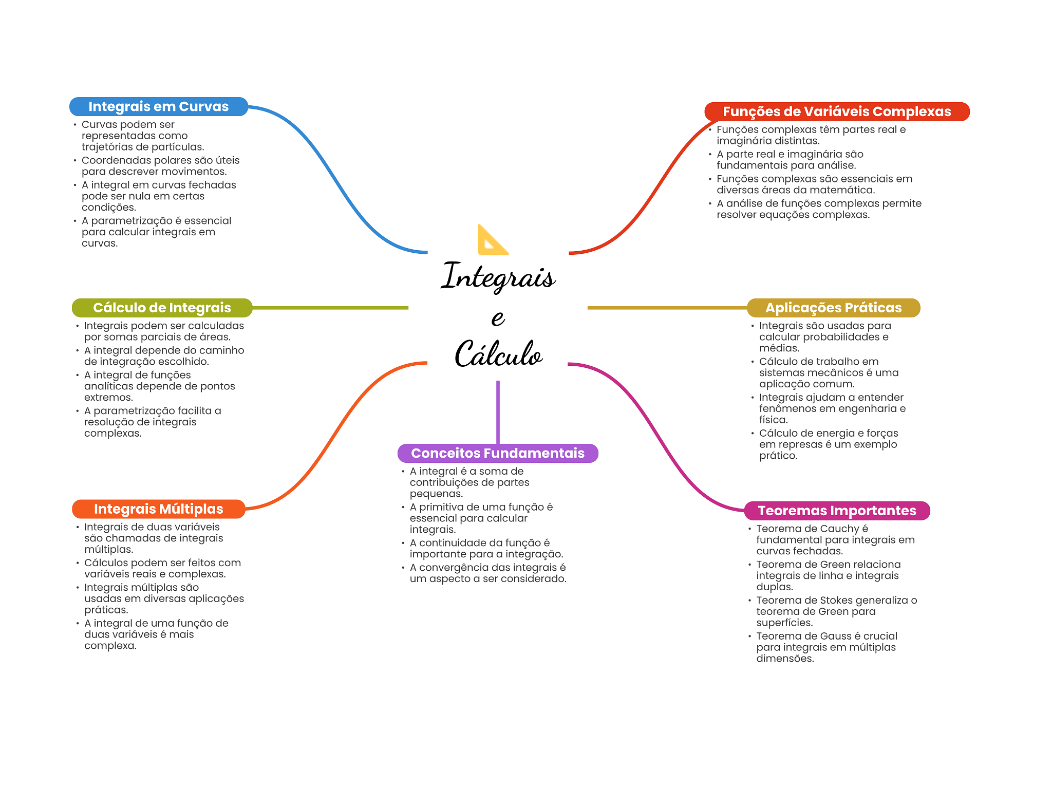 Integrais em Curvas Funções de Variáveis Complexas Curvas podem ser Funções complexas têm partes real e representadas como imaginária distintas. trajetórias de partículas. A parte real e imaginária são Coordenadas polares são úteis fundamentais para análise. para descrever movimentos. Funções complexas são essenciais em A integral em curvas fechadas diversas áreas da matemática. pode ser nula em certas condições. A análise de funções complexas permite A parametrização é essencial resolver equações complexas. para calcular integrais em curvas. Integrais Cálculo de Integrais Aplicações Práticas e Integrais podem ser calculadas Integrais são usadas para por somas parciais de áreas. calcular probabilidades e A integral depende do caminho de integração escolhido. Cálculo médias. Cálculo de trabalho em A integral de funções sistemas mecânicos é uma analíticas depende de pontos aplicação comum. extremos. Integrais ajudam a entender A parametrização facilita a fenômenos em engenharia e resolução de integrais física. complexas. Cálculo de energia e forças em represas é um exemplo Conceitos Fundamentais prático. A integral é a soma de contribuições de partes pequenas. Integrais Múltiplas A primitiva de uma função é essencial para calcular Teoremas Importantes Integrais de duas variáveis integrais. Teorema de Cauchy é são chamadas de integrais A continuidade da função é fundamental para integrais em múltiplas. importante para a integração. curvas fechadas. Cálculos podem ser feitos com A convergência das integrais é Teorema de Green relaciona variáveis reais e complexas. um aspecto a ser considerado. integrais de linha e integrais Integrais múltiplas são duplas. usadas em diversas aplicações Teorema de Stokes generaliza práticas. teorema de Green para A integral de uma função de superfícies. duas variáveis é mais Teorema de Gauss é crucial complexa. para integrais em múltiplas dimensões.