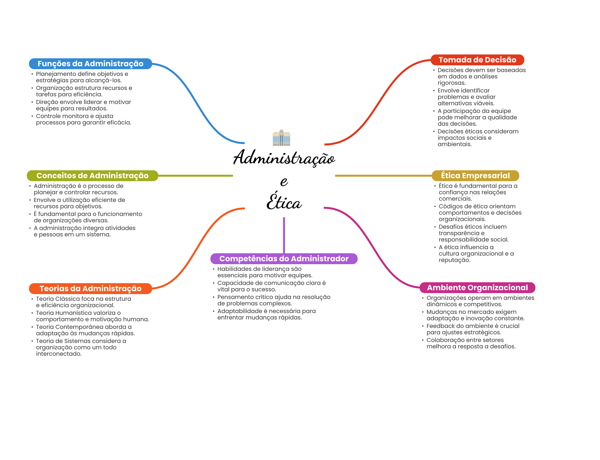 Tomada de Decisão Funções da Administração Decisões devem ser baseadas Planejamento define objetivos e em dados e análises estratégias para alcançá-los. rigorosas. Organização estrutura recursos e Envolve identificar tarefas para eficiência. problemas e avaliar Direção envolve liderar e motivar alternativas viáveis. equipes para resultados. A participação da equipe Controle monitora e ajusta pode melhorar a qualidade processos para garantir eficácia. das decisões. Decisões éticas consideram impactos sociais e ambientais. Administração Conceitos de Administração Ética Empresarial e Administração é processo de Ética é fundamental para a planejar e controlar recursos. Ética confiança nas relações Envolve a utilização eficiente de comerciais. recursos para objetivos. Códigos de ética orientam É fundamental para funcionamento comportamentos e decisões de organizações diversas. organizacionais. A administração integra atividades Desafios éticos incluem e pessoas em um sistema. transparência e responsabilidade social. A ética influencia a cultura organizacional e a Competências do Administrador reputação. Habilidades de liderança são essenciais para motivar equipes. Capacidade de comunicação clara é Teorias da Administração vital para sucesso. Ambiente Organizacional Teoria Clássica foca na estrutura Pensamento crítico ajuda na resolução Organizações operam em ambientes e eficiência organizacional. de problemas complexos. dinâmicos e competitivos. Teoria Humanística valoriza Adaptabilidade é necessária para Mudanças no mercado exigem comportamento e motivação humana. enfrentar mudanças rápidas. adaptação e inovação constante. Teoria Contemporânea aborda a Feedback do ambiente é crucial adaptação às mudanças rápidas. para ajustes estratégicos. Teoria de Sistemas considera a Colaboração entre setores organização como um todo melhora a resposta a desafios. interconectado.
