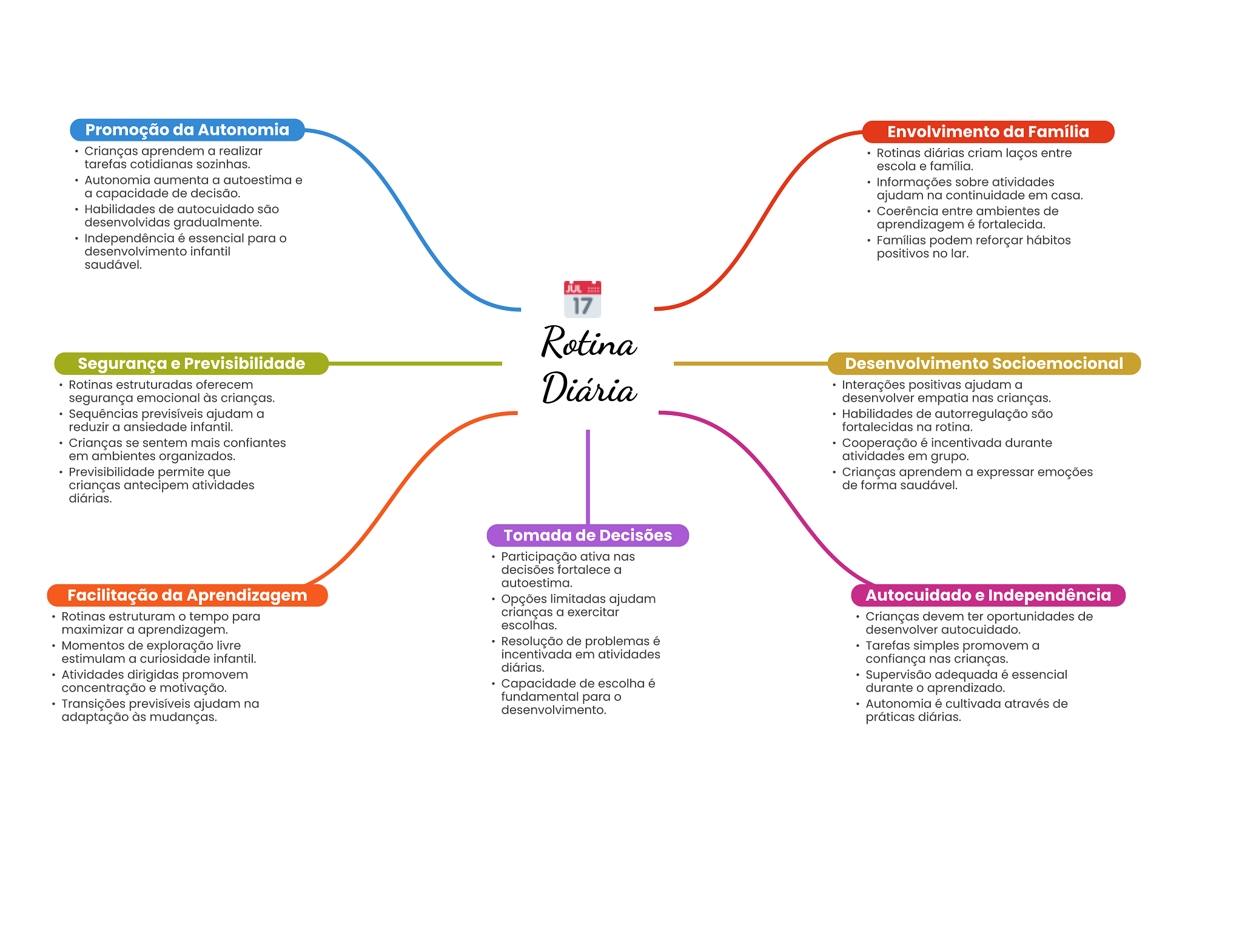 Promoção da Autonomia Envolvimento da Família Crianças aprendem a realizar Rotinas diárias criam laços entre tarefas cotidianas sozinhas. escola e família. Autonomia aumenta a autoestima e Informações sobre atividades a capacidade de decisão. ajudam na continuidade em casa. Habilidades de autocuidado são Coerência entre ambientes de desenvolvidas gradualmente. aprendizagem é fortalecida. Independência é essencial para Famílias podem reforçar hábitos desenvolvimento infantil positivos no lar. saudável. JUL 17 Rotina Segurança e Previsibilidade Desenvolvimento Socioemocional Rotinas estruturadas oferecem Diária Interações positivas ajudam a segurança emocional às crianças. desenvolver empatia nas crianças. Sequências previsíveis ajudam a Habilidades de autorregulação são reduzir a ansiedade infantil. fortalecidas na rotina. Crianças se sentem mais confiantes Cooperação é incentivada durante em ambientes organizados. atividades em grupo. Previsibilidade permite que Crianças aprendem a expressar emoções crianças antecipem atividades de forma saudável. diárias. Tomada de Decisões Participação ativa nas decisões fortalece a autoestima. Facilitação da Aprendizagem Opções limitadas ajudam Autocuidado e Independência Rotinas estruturam tempo para crianças a exercitar Crianças devem ter oportunidades de maximizar a aprendizagem. escolhas. desenvolver autocuidado. Momentos de exploração livre Resolução de problemas é Tarefas simples promovem a estimulam a curiosidade infantil. incentivada em atividades confiança nas crianças. diárias. Atividades dirigidas promovem Supervisão adequada é essencial concentração e motivação. Capacidade de escolha é durante aprendizado. Transições previsíveis ajudam na fundamental para Autonomia é cultivada através de desenvolvimento. adaptação às mudanças. práticas diárias.