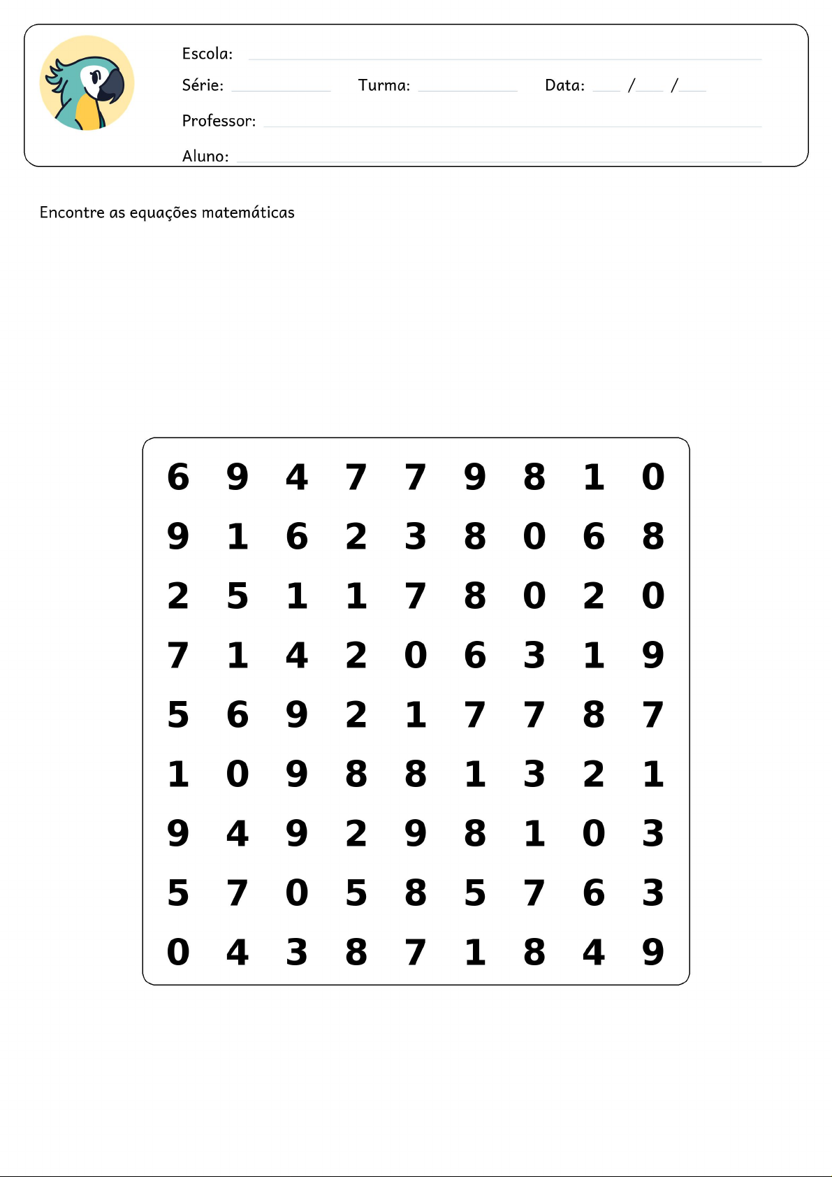 Escola: Série: Turma: Data: / / Professor: Aluno: Encontre as equações matemáticas 694779810 916238068 251178020 714206319 569217787 109881321 949298103 570585763 0438718499 3 8 = 1 1 2 + 8 3 5 6 8 8 7 7 9