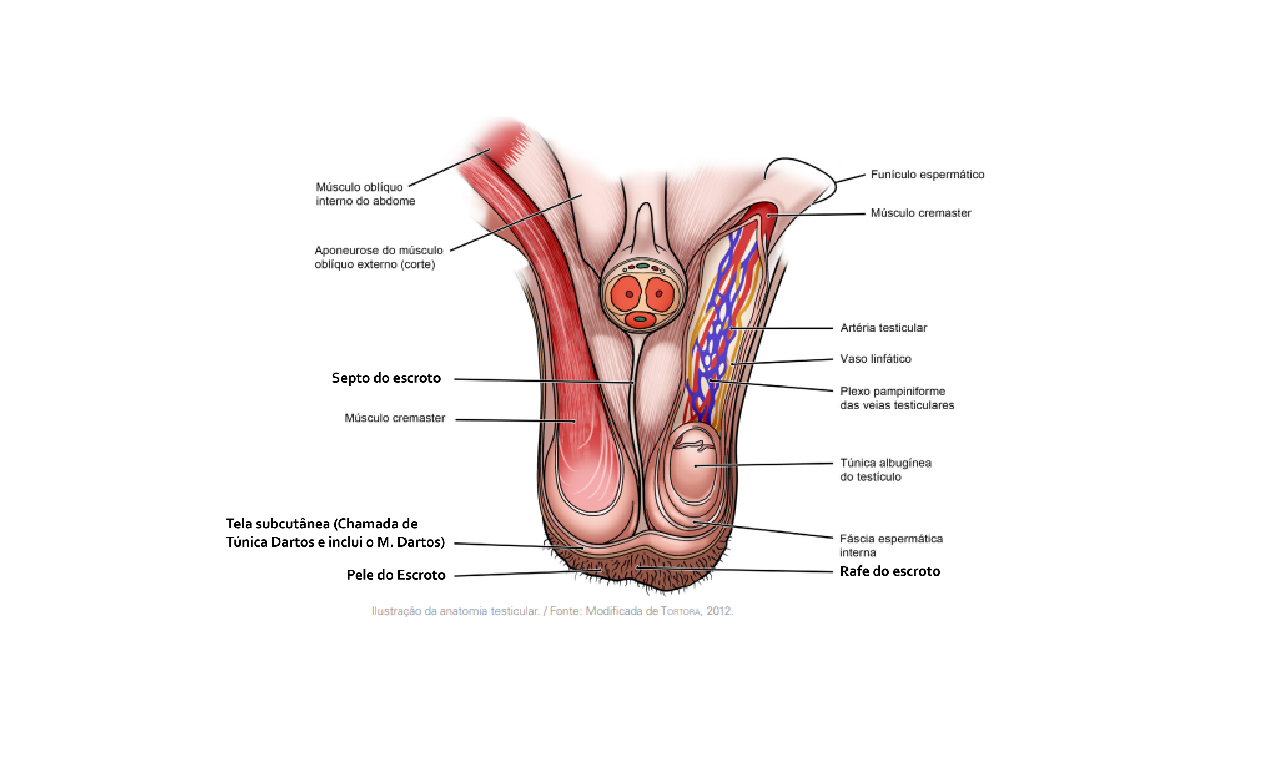 Músculo interno do abdome Aponeurose do músculo obliquo externo (corte) Septo do escroto Músculo cremaster Tela subcutânea (Chamada de Túnica Dartos e inclui M. Dartos) Pele do Escroto llustração da anatomia testicular. / Fonte: Modificada de TORTORA, 2012.