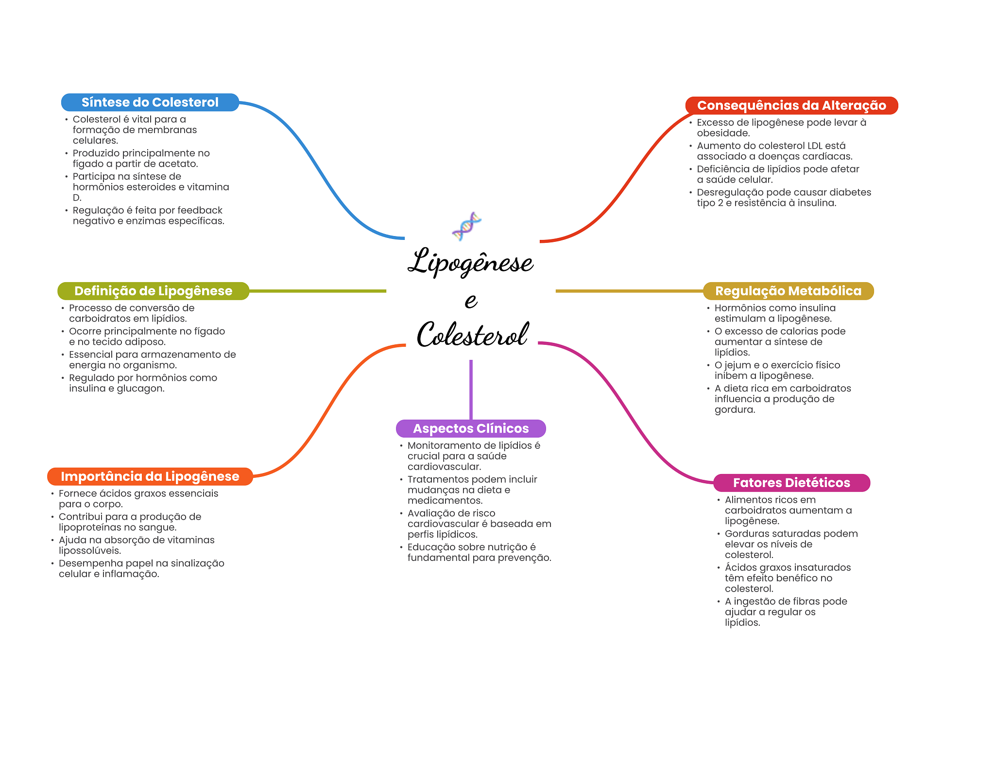 Síntese do Colesterol Consequências da Alteração Colesterol é vital para a Excesso de lipogênese pode levar à formação de membranas obesidade. celulares. Aumento do colesterol LDL está Produzido principalmente no associado a doenças cardíacas. fígado a partir de acetato. Deficiência de lipídios pode afetar Participa na síntese de a saúde celular. hormônios esteroides e vitamina D. Desregulação pode causar diabetes tipo 2 e resistência à insulina. Regulação é feita por feedback negativo e enzimas específicas. Lipogênese Definição de Lipogênese Regulação Metabólica Processo de conversão de e Hormônios como insulina carboidratos em lipídios. estimulam a lipogênese. Ocorre principalmente no fígado e no tecido adiposo. Colesterol excesso de calorias pode aumentar a síntese de Essencial para armazenamento de lipídios. energia no organismo. jejum e O exercício físico Regulado por hormônios como inibem a lipogênese. insulina e glucagon. A dieta rica em carboidratos influencia a produção de gordura. Aspectos Clínicos Monitoramento de lipídios é crucial para a saúde cardiovascular. Importância da Lipogênese Tratamentos podem incluir Fatores Dietéticos Fornece ácidos graxos essenciais mudanças na dieta e medicamentos. Alimentos ricos em para corpo. Contribui para a produção de Avaliação de risco carboidratos aumentam a lipoproteínas no sangue. cardiovascular é baseada em lipogênese. perfis lipídicos. Gorduras saturadas podem Ajuda na absorção de vitaminas Educação sobre nutrição é elevar OS níveis de lipossolúveis. fundamental para prevenção. colesterol. Desempenha papel na sinalização Ácidos graxos insaturados celular e inflamação. têm efeito benéfico no colesterol. A ingestão de fibras pode ajudar a regular os lipídios.