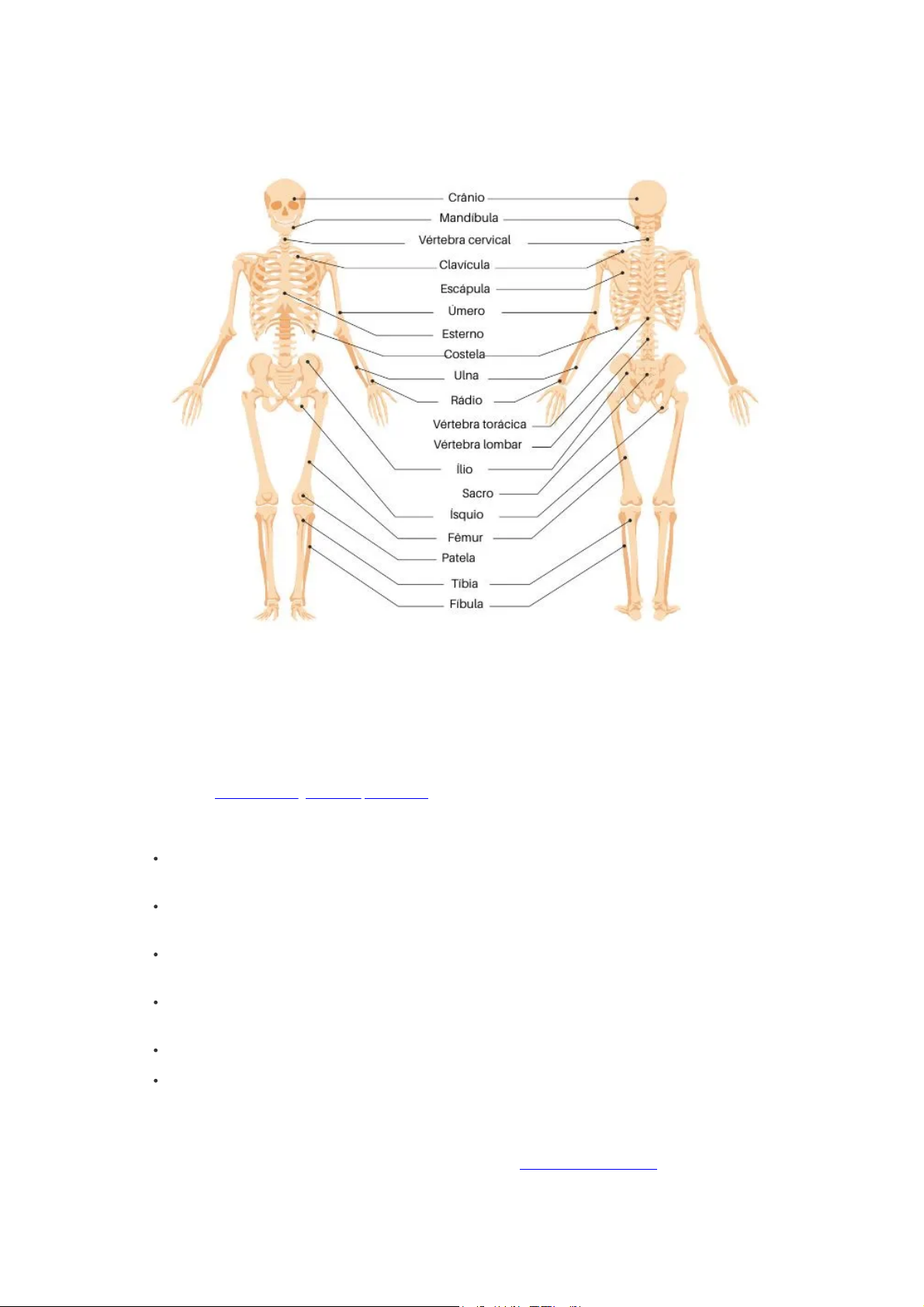 Ossos do corpo humano Os ossos do corpo humano formam o esqueleto e podem ser divididos em duas partes funcionais: esqueleto axial e esqueleto apendicular. Os ossos do corpo humano formam nosso esqueleto. Crédito da Imagem: Shutterstock Os ossos do corpo humano são estruturas formadas por tecido ósseo e que permitem, entre outras funções, movimentação, proteção de órgãos internos e produção de células sanguíneas em nosso organismo. No total, um indivíduo adulto apresenta 206 ossos, os quais são divididos em duas partes funcionais: esqueleto axial e esqueleto apendicular. O esqueleto axial é formado pelos ossos da cabeça, osso hioide, vértebras, costelas e osso esterno. Já o esqueleto apendicular é formado pelos ossos dos membros superiores e inferiores, incluindo a cintura escapular e pélvica. Leia também: Quais são os órgãos do corpo humano? Resumo sobre os ossos do corpo humano Os ossos do corpo humano são formados por tecido ósseo, o qual é composto por células específicas (osteoblastos, osteoclastos e osteócitos) e uma matriz extracelular calcificada. Os ossos podem, de acordo com a sua forma, ser classificados em cinco tipos: longos, curtos, planos, irregulares e sesamoides. Eles atuam protegendo órgãos vitais, suportando os tecidos, ajudando no movimento do corpo, produzindo células sanguíneas e armazenando sais minerais. O esqueleto humano é constituído por 206 ossos em um indivíduo adulto e pode ser dividido em duas partes funcionais: o esqueleto axial e o esqueleto apendicular. O esqueleto axial é formado pelos ossos da cabeça, osso hioide, vértebras, costelas e osso esterno. O esqueleto apendicular é formado pelos ossos dos membros superiores e inferiores, incluindo a cintura escapular e pélvica. Características gerais dos ossos do corpo humano Os ossos são formados por um tipo especial de tecido conjuntivo, denominado tecido ósseo. Assim como todo tecido conjuntivo, o tecido ósseo é formado por células que estão dispostas em uma matriz extracelular, que, no caso desse tecido, caracteriza-se por ser calcificada e rígida. As células que compõem o tecido ósseo são três: 28/06/25, 08:16 biologianet.com/imprimir/1124 https://www.biologianet.com/imprimir/1124 1/7 https://www.biologianet.com/anatomia-fisiologia-animal/orgaos-do-corpo-humano.htm https://www.biologianet.com/histologia-animal/tecido-osseo.htm Osteoblastos: células que atuam na formação do osso. São responsáveis por sintetizar a parte orgânica da matriz óssea. Osteoclastos: células que estão associadas à reabsorção do osso. Trata-se de células móveis, grandes, multinucleadas e com grande quantidade de ramificações. Osteócitos: células que são encontradas no osso maduro. Os osteócitos podem ser observados no interior de lacunas na matriz óssea. Os ossos podem, de acordo com a sua forma, ser classificados em cinco tipos: Longos: comprimento maior que a largura e espessura. Ex.: fêmur e rádio. Curtos: comprimento, espessura e largura equivalentes. Ex.: ossos do carpo e tarso. Planos: largura e comprimento maiores que a espessura e estão associados, geralmente, à proteção de partes moles do corpo. Ex.: Escápula e ossos do crânio. Irregulares: forma diferente e peculiar, não se encaixando nas descrições anteriores. Ex.: vértebras e ossículos da orelha. Sesamoides: pequenos e arredondados. Ex.: patela. Leia também: Sistemas do corpo humano Importância dos ossos do corpo humano Os ossos são estruturas extremamente importantes para o nosso organismo e estão associados, formando o esqueleto humano. Algumas funções que podem ser atribuídas aos ossos humanos são: proteção dos órgãos internos; movimentação do corpo; suporte dos tecidos; produção de células sanguíneas; armazenamento de sais minerais, principalmente cálcio e fósforo. Quais são os ossos do corpo humano? 28/06/25, 08:16 biologianet.com/imprimir/1124 https://www.biologianet.com/imprimir/1124 2/7 https://www.biologianet.com/anatomia-fisiologia-animal/principais-sistemas-corpo-humano.htm https://www.biologianet.com/anatomia-fisiologia-animal/esqueleto-humano.htm O indivíduo adulto possui 206 ossos. Ossos do esqueleto axial 1. Ossos da cabeça A nossa cabeça é formada pelos ossos faciais e cranianos, os quais totalizam 28 ossos. → Na face, temos os ossos: nasal (2 ossos), maxila (2 ossos), zigomático (2 ossos), mandíbula (1 osso), lacrimal (2 ossos), palatino (2 ossos), vômer (1 osso) e conchas nasais inferiores (2 ossos). → No crânio, temos os seguintes ossos: occipital (1 osso), 28/06/25, 08:16 biologianet.com/imprimir/1124 https://www.biologianet.com/imprimir/1124 3/7 parietal (2 ossos), frontal (1 osso), temporal (2 ossos), esfenoide (1 osso) e etmoide (1 osso). → Temos ainda os ossículos auditivos, que são: martelo (2 ossos), bigorna (2 ossos) e estribo (2 ossos). Os ossos da cabeça totalizam 28 ossos, incluindo ossos faciais e cranianos. 2. Osso hioide O osso hioide é um osso móvel que está localizado na parte anterior do pescoço. Esse osso destaca-se por não se articular com nenhum outro osso, estando separado do restante do esqueleto. 3. Vértebras As vértebras são ossos que formam a coluna vertebral. No total, temos 33 ossos formando a coluna, sendo: 7 vértebras cervicais; 12 vértebras torácicas; 5 vértebras lombares; 5 vértebras fundidas, formando o sacro; 4 vértebras fundidas, formando o cóccix. Como algumas vértebras da coluna estão fundidas, alguns autores consideram a coluna como sendo formada por 26 vértebras. 28/06/25, 08:16 biologianet.com/imprimir/1124 https://www.biologianet.com/imprimir/1124 4/7 https://www.biologianet.com/anatomia-fisiologia-animal/coluna-vertebral.htm A coluna vertebral é formada por vértebras cervicais, torácicas, lombares, sacro e cóccix. 3. Costelas No corpo humano, temos 12 pares de costelas, as quais, junto com as vértebras torácicas e esterno, formam a caixa torácica. As costelas
