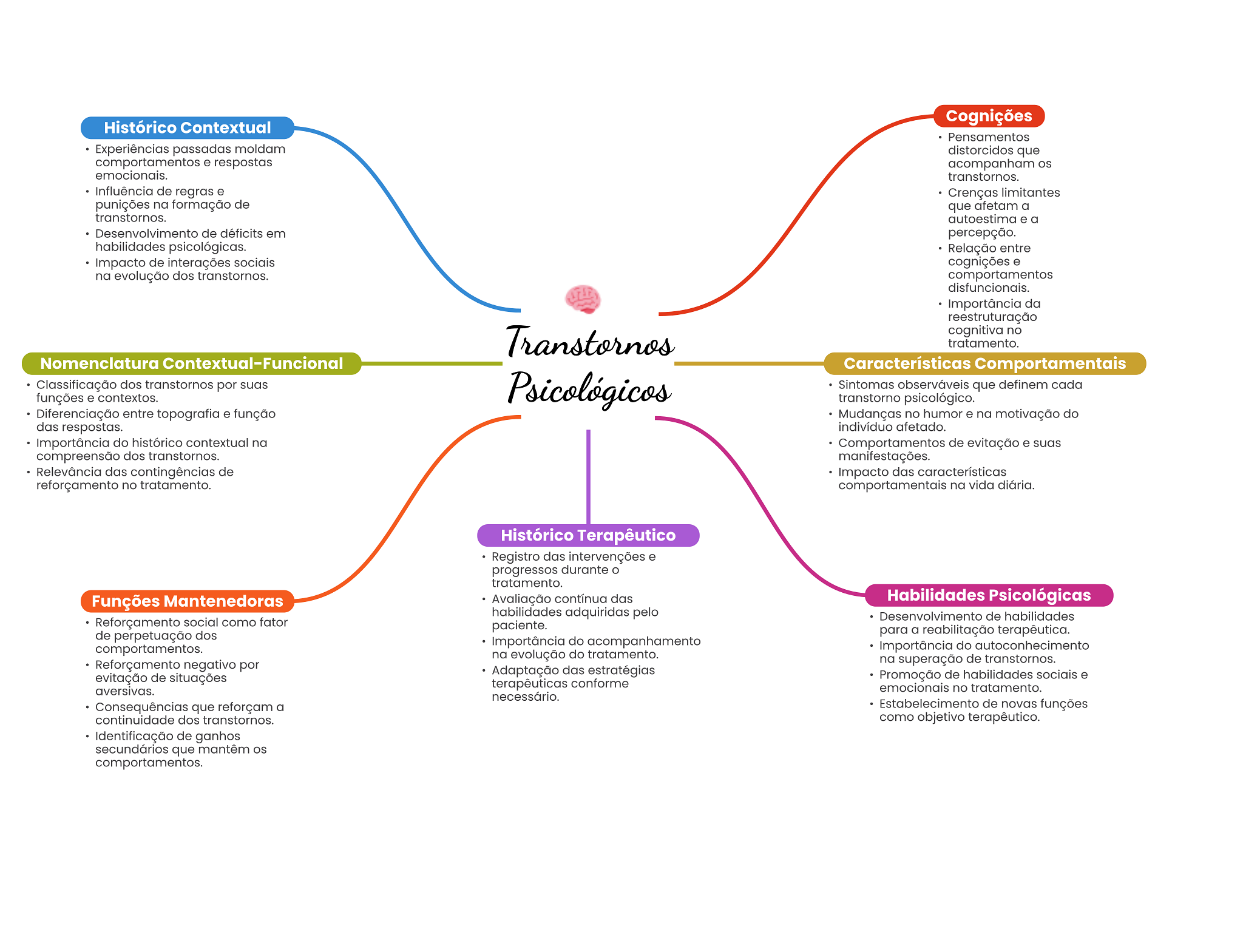 Cognições Histórico Contextual Pensamentos Experiências passadas moldam distorcidos que comportamentos e respostas acompanham os emocionais. transtornos. Influência de regras e Crenças limitantes punições na formação de que afetam a transtornos. autoestima e a Desenvolvimento de déficits em percepção. habilidades psicológicas. Relação entre Impacto de interações sociais cognições e na evolução dos transtornos. comportamentos disfuncionais. Importância da reestruturação Transtornos cognitiva no tratamento. Nomenclatura Contextual-Funciona Características Comportamentais Classificação dos transtornos por suas Psicológicos Sintomas observáveis que definem cada funções e contextos. transtorno psicológico. Diferenciação entre topografia e função Mudanças no humor e na motivação do das respostas. indivíduo afetado. Importância do histórico contextual na Comportamentos de evitação e suas compreensão dos transtornos. manifestações. Relevância das contingências de Impacto das características reforçamento no tratamento. comportamentais na vida diária. Histórico Terapêutico Registro das intervenções e progressos durante tratamento. Funções Mantenedoras Avaliação contínua das Habilidades Psicológicas habilidades adquiridas pelo Desenvolvimento de habilidades Reforçamento social como fator paciente. de perpetuação dos para a reabilitação terapêutica. Importância do acompanhamento comportamentos. Importância do autoconhecimento na evolução do tratamento. Reforçamento negativo por na superação de transtornos. Adaptação das estratégias evitação de situações Promoção de habilidades sociais e terapêuticas conforme aversivas. emocionais no tratamento. necessário. Consequências que reforçam a Estabelecimento de novas funções continuidade dos transtornos. como objetivo terapêutico. Identificação de ganhos secundários que mantêm comportamentos.