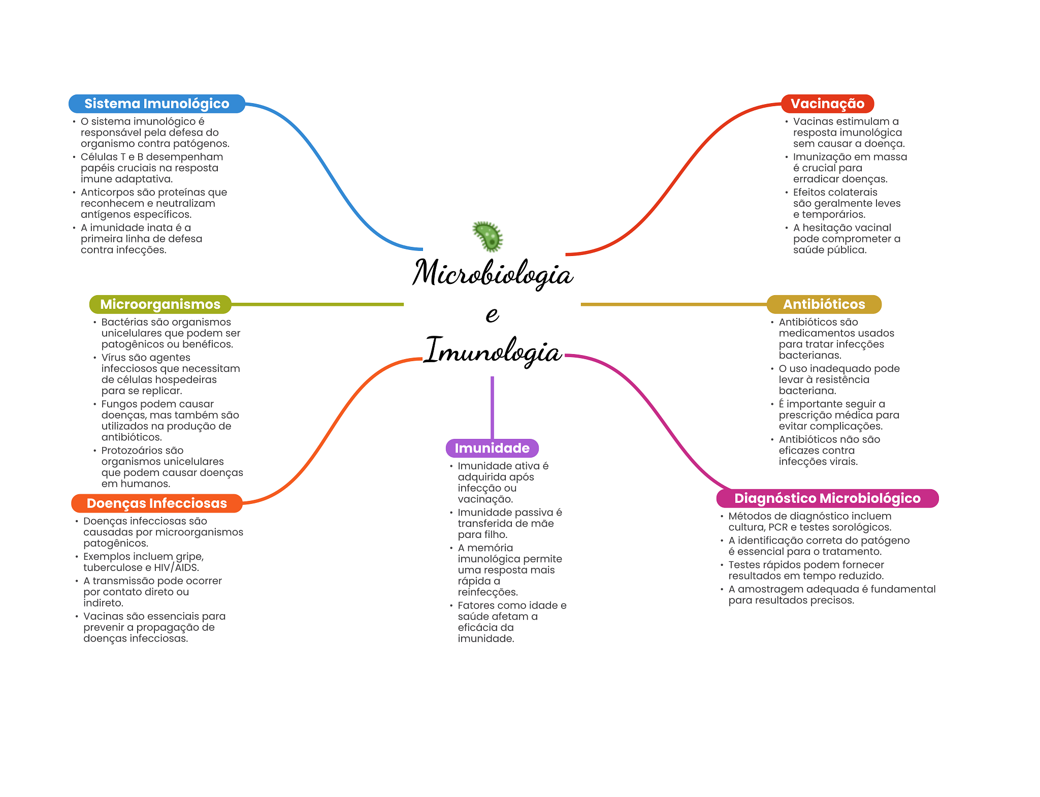Sistema Imunológico Vacinação sistema imunológico é Vacinas estimulam a responsável pela defesa do resposta imunológica organismo contra patógenos. sem causar a doença. Células T e desempenham Imunização em massa papéis cruciais na resposta é crucial para imune adaptativa. erradicar doenças. Anticorpos são proteínas que Efeitos colaterais reconhecem e neutralizam são geralmente leves antígenos específicos. e temporários. A imunidade inata é a A hesitação vacinal primeira linha de defesa pode comprometer a contra infecções. saúde pública. Microbiologia Microorganismos Antibióticos e Bactérias são organismos Antibióticos são unicelulares que podem ser medicamentos usados patogênicos ou benéficos. Imunologia para tratar infecções Vírus são agentes bacterianas. infecciosos que necessitam O uso inadequado pode de células hospedeiras levar à resistência para se replicar. bacteriana. Fungos podem causar É importante seguir a doenças, mas também são prescrição médica para utilizados na produção de evitar complicações. antibióticos. Antibióticos não são Protozoários são Imunidade eficazes contra organismos unicelulares Imunidade ativa é infecções virais. que podem causar doenças adquirida após em humanos. infecção ou Doenças Infecciosas vacinação. Diagnóstico Microbiológico Imunidade passiva é Doenças infecciosas são Métodos de diagnóstico incluem transferida de mãe causadas por microorganismos cultura, PCR e testes sorológicos. para filho. patogênicos. A identificação correta do patógeno A memória Exemplos incluem gripe, é essencial para O tratamento. imunológica permite tuberculose e HIV/AIDS. uma resposta mais Testes rápidos podem fornecer A transmissão pode ocorrer rápida a resultados em tempo reduzido. por contato direto ou reinfecções. A amostragem adequada é fundamental indireto. Fatores como idade e para resultados precisos. Vacinas são essenciais para saúde afetam a prevenir a propagação de eficácia da doenças infecciosas. imunidade.