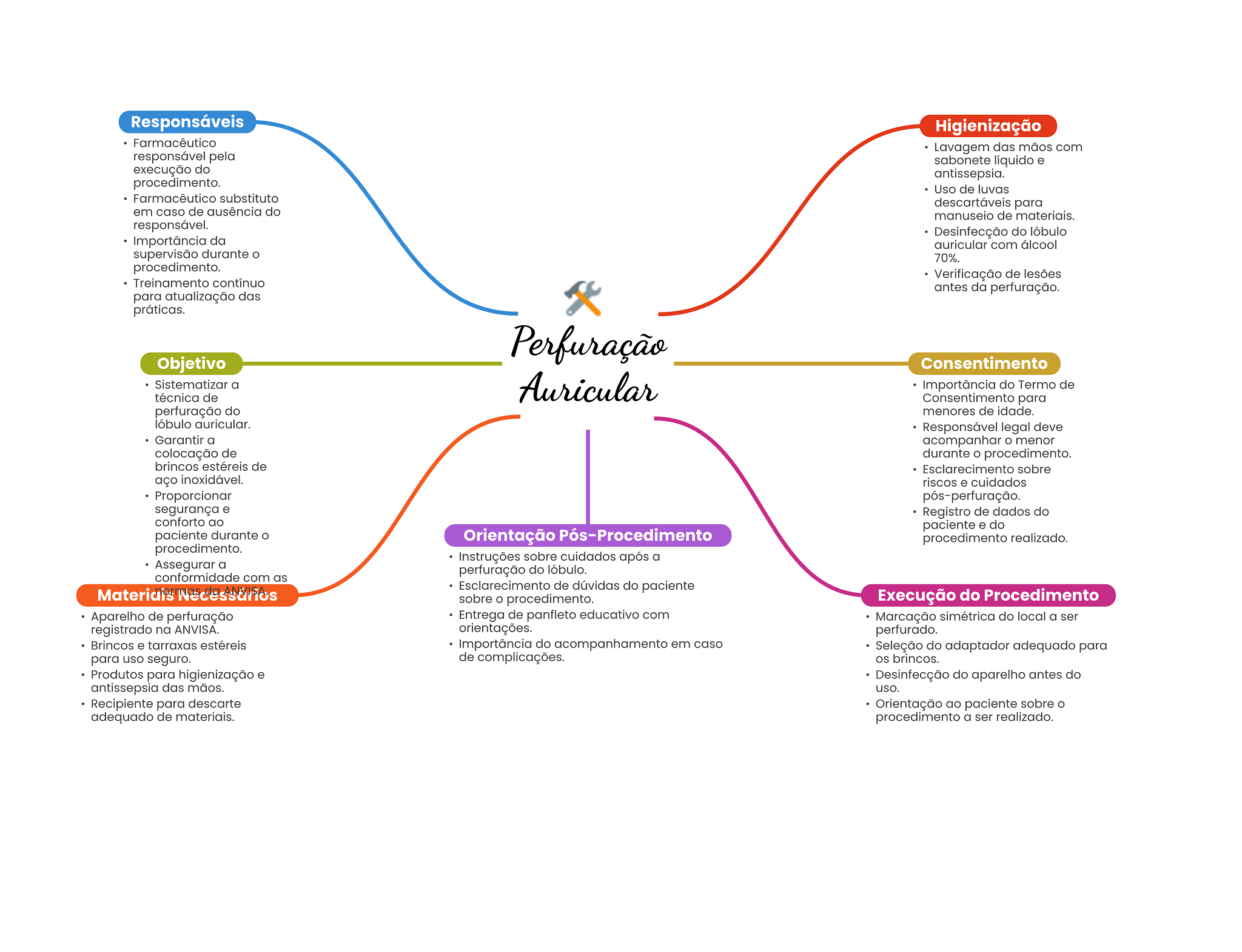 Responsáveis Higienização Farmacêutico Lavagem das mãos com responsável pela sabonete líquido e execução do antissepsia. procedimento. Uso de luvas Farmacêutico substituto descartáveis para em caso de ausência do manuseio de materiais. responsável. Desinfecção do lóbulo Importância da auricular com álcool supervisão durante 70%. procedimento. Verificação de lesões Treinamento contínuo antes da perfuração. para atualização das práticas. Perfuração Objetivo Consentimento Sistematizar a técnica de Auricular Importância do Termo de Consentimento para perfuração do menores de idade. lóbulo auricular. Responsável legal deve Garantir a acompanhar O menor colocação de durante procedimento. brincos estéreis de Esclarecimento sobre aço inoxidável. riscos e cuidados Proporcionar pós-perfuração. segurança e Registro de dados do conforto ao paciente e do paciente durante Orientação Pós-Procedimento procedimento realizado. procedimento. Instruções sobre cuidados após a Assegurar a perfuração do lóbulo. conformidade com as Esclarecimento de dúvidas do paciente Necessarios sobre O procedimento. Execução do Procedimento Aparelho de perfuração Entrega de panfleto educativo com Marcação simétrica do local a ser registrado na ANVISA. orientações. perfurado. Brincos e tarraxas estéreis Importância do acompanhamento em caso Seleção do adaptador adequado para para uso seguro. de complicações. OS brincos. Produtos para higienização e Desinfecção do aparelho antes do antissepsia das mãos. uso. Recipiente para descarte Orientação ao paciente sobre adequado de materiais. procedimento a ser realizado.