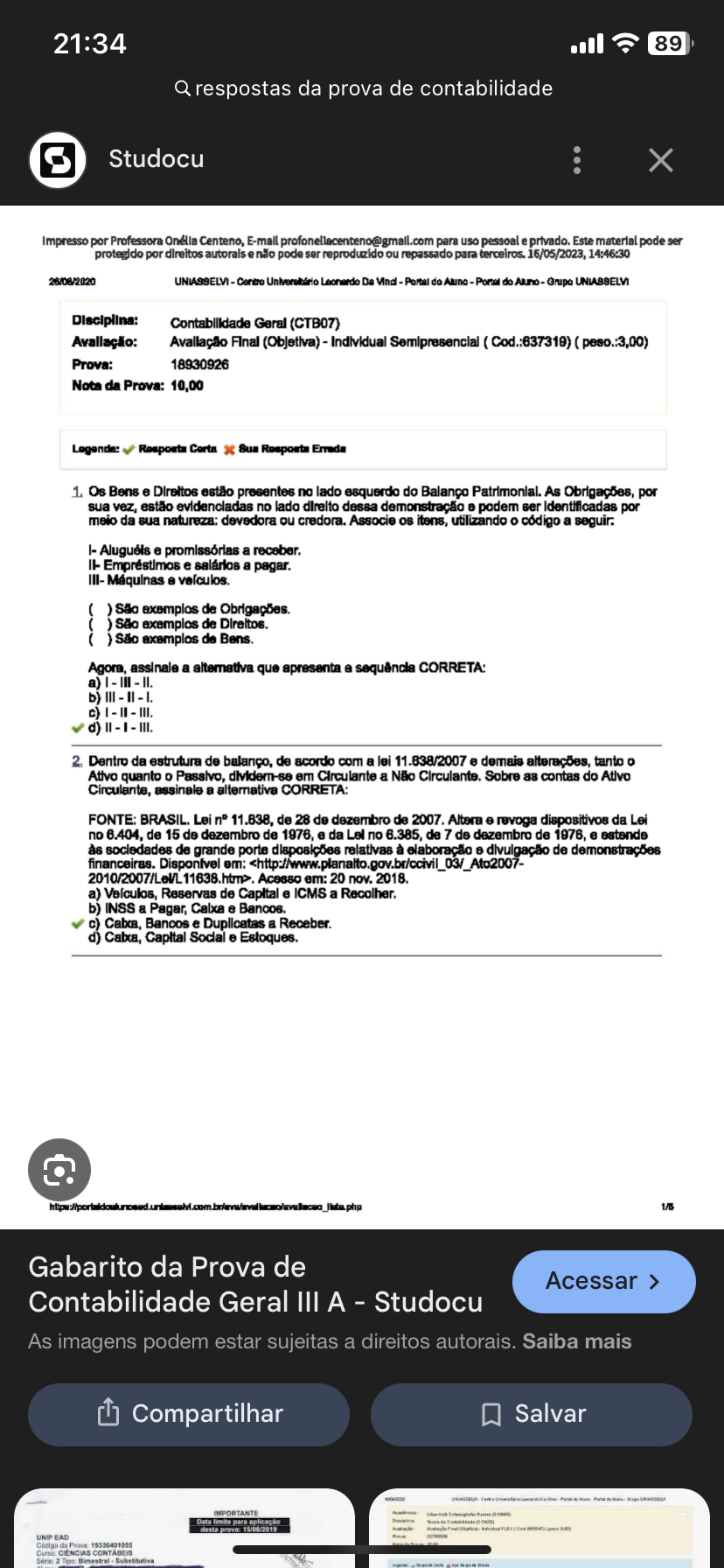 21:34 89 Q respostas da prova de contabilidade Studocu X Impresso por Centeno, E-mail profonellacenteno@gmail.com para pessoal e privado. Este material pode ser protegido por direitos e não pode ser reproduzido ou repassado para terceiros. 16/05/2023, 14:46:30 UNIASSELVI Centro Da Vind Portal do Aluno do Grupo UNIASSELVI Contabilidade Geral (CTB07) Availação: Avallação Final (Objetiva) Individual Semipresencial ( Cod.:637319) ( peso.:3,00) Prova: 18930926 da Prova: 10,00 Resports 1. Os Bens e estão presentes no lado esquerdo do Balanço Patrimonial. As Obrigações, por sua vez, estão evidenciadas no lado direito dessa demonstração podem ser Identificadas por meio da sua natureza: devedora ou credora. Associe os itens, utilizando código a e promissórias a receber. Empréstimos e salários a pagar. III- Máquinas ( ) São exemplos de Obrigações. ( ) São exemplos de ( ) São exemplos de Bens. Agora, assinale a que apresenta a sequência CORRETA: a) III II. b) III - I. c) II III. d) III. 2. Dentro da estrutura de balanço, de acordo com a lei 11.838/2007 e demais alterações, tanto quanto Passivo, dividem-se em Circulante a Não Circulante. Sobre as contas do Ativo Circulante, assinale a alternative CORRETA: FONTE: Lei de 28 de dezembro de 2007. Altera revoga dispositivos da Lei no 6.404, de 15 de dezembro de 1976, e da Lei no 6.385, de 7 de dezembro de 1976, e estende às sociedades de grande porte disposições relativas à elaboração divulgação de demonstrações financeiras. em: Acesso em: 20 nov. 2018. a) Veículos, Reservas de Capital e ICMS a Recolher. b) INSS a Pagar, e Bancos. c) Bancos e Duplicatas a Receber. d) Cabxa, Capital Social Estoques. php 1/5 Gabarito da Prova de Acessar > Contabilidade Geral III Studocu As imagens podem estar sujeitas a direitos autorais. Saiba mais Compartilhar Salvar IMPORTANTE Data limite para aplicação desta 15/06/2019 UNIP EAD da 19336401055 CIENCIAS CONTABEIS Bimestral Substitutiva