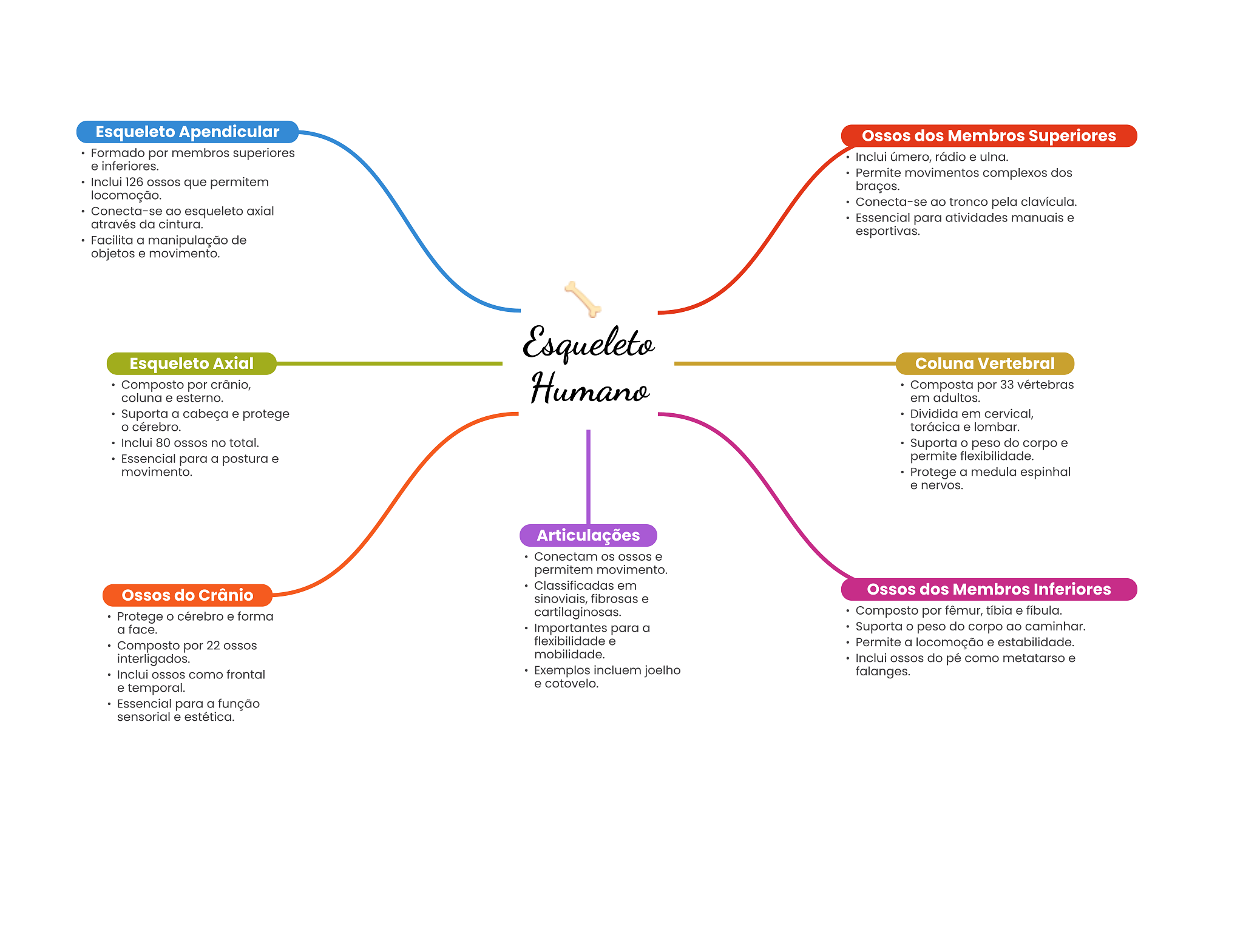 Esqueleto Apendicular Ossos dos Membros Superiores Formado por membros superiores Inclui úmero, rádio e ulna. e inferiores. Permite movimentos complexos dos Inclui 126 que permitem braços. locomoção. Conecta-se ao tronco pela clavícula. Conecta-se ao esqueleto axial através da cintura. Essencial para atividades manuais e esportivas. Facilita a manipulação de objetos e movimento. Esqueleto Esqueleto Axial Coluna Vertebral Composto por crânio, coluna e esterno. Humano Composta por 33 vértebras em adultos. Suporta a cabeça e protege Dividida em cervical, cérebro. torácica e lombar. Inclui 80 OSSOS no total. Suporta peso do corpo e Essencial para a postura e permite flexibilidade. movimento. Protege a medula espinhal e nervos. Articulações Conectam OSSOS e permitem movimento. Classificadas em Ossos do Crânio Ossos dos Membros Inferiores sinoviais, fibrosas e Protege cérebro e forma cartilaginosas. Composto por fêmur, tíbia e fíbula. a face. Importantes para a Suporta peso do corpo ao caminhar. Composto por 22 flexibilidade e Permite a locomoção e estabilidade. interligados. mobilidade. Inclui OSSOS do pé como metatarso e Inclui OSSOS como frontal Exemplos incluem joelho falanges. e temporal. e cotovelo. Essencial para a função sensorial e estética.
