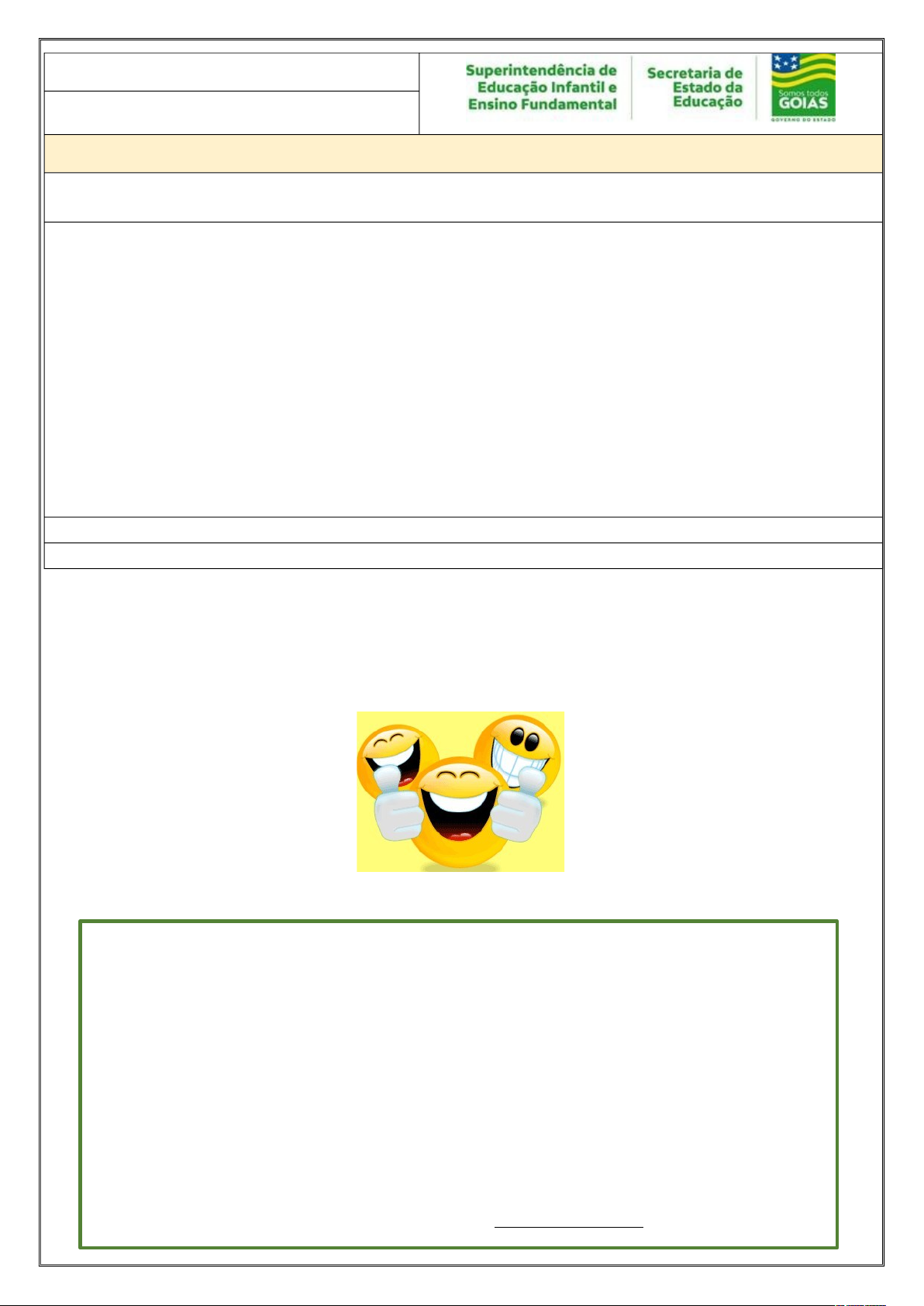 3º ANO LÍNGUA PORTUGUESA ATIVIDADE 6 Tema: gênero: anedotas e piadas. Decodificação/ fluência de leitura; compreensão em leitura; estratégias de leitura; forma de composição do texto; construção do sistema alfabético e da ortografia. Habilidades Essenciais: (EF35LP03) Identificar a ideia central do texto, demonstrando compreensão global; EF15LP03) Localizar informações explícitas em textos. (EF35LP04) Inferir informações implícitas nos textos lidos;(EF35LP05) Inferir o sentido de palavras ou expressões desconhecidas em textos, com base no contexto da frase ou do texto; EF35LP08-A) Compreender, com a ajuda do professor e de forma contextualizada, as noções básicas de: recursos de referenciação, por substituição lexical ou por pronomes pessoais, possessivos e demonstrativo), vocabulário apropriado ao gênero, recursos de coesão pronominal (pronomes anafóricos) e articuladores de relações de sentido, como tempo, causa, oposição, conclusão, comparação, para produzir textos corretamente. (EF35LP12) Recorrer ao dicionário para esclarecer dúvida sobre a escrita de palavras, especialmente no caso de palavras com relações irregulares fonema-grafema; (EF35LP13) Memorizar a grafia de palavras de uso frequente nas quais as relações fonema-grafema são irregulares e com h inicial que não representa fonema;(EF03LP01) Ler e escrever palavras com correspondências regulares contextuais entre grafemas e fonemas – c/qu; g/gu; r/rr; s/ss; o (e não u) e e (e não i) em sílaba átona em final de palavra – e com marcas de nasalidade (til, m, n).;(EF03LP02) Ler e escrever corretamente palavras com sílabas CV, V, CVC, CCV, VC, VV, CVV, identificando que existem vogais em todas as sílabas; (EF03LP03) Ler e escrever corretamente palavras com os dígrafos lh, nh, ch; (EF15LP05) (EF35LP09) Organizar o texto em unidades de sentido, dividindo-o em parágrafos segundo as normas gráficas e de acordo com as características do gênero textual. NOME: UNIDADE ESCOLAR: ATIVIDADES Piada ou anedota é uma breve história, de final engraçado e às vezes surpreendente, cujo objetivo é o de provocar risos ou gargalhadas em quem a ouve ou lê. Disponível em http://akigifs.blogspot.com/2014/06/emoticons-felizes-sorrindo-alegre.html.Acessado dia 11 de mar. de 2021. 1. Leia a anedota silenciosamente e depois em voz alta.O Elefante e a Formiguinha Um elefante e uma formiguinha caminhavam pelo deserto com passos firmes. O elefante, no seu pique: bum, bum, bum. A formiguinha no seu ritmo: pim, pim, pim. O elefante: bum, bum, bum... A formiguinha: pim, pim, pim... Uma hora, a formiguinha olha para trás, dá uma risada e diz: · Elefante! · O que foi? · Você não acredita na poeira que nós estamos levantando! Disponível em: www.paranacentro.com.br. Acesso em: 11 de mar de 2021. 2. Responda as questões de acordo com a anedota. a) Que gênero textual é esse ( ) um aviso ( ) uma poesia b) Qual o título do texto? ( ) uma anedota ( ) uma receita c) Qual é a função do texto? d) Quem são os personagens? e) Quem disse essa frase: “Você não acredita a poeira que nós estamos levantando!”? 3. O humor dessa anedota está em: ( ) a formiguinha estar no deserto. ( ) o elefante caminhar no deserto. ( ) a formiguinha pensar que o seu rastro provocava muita poeira. ( ) o barulho produzido pelos passos dos dois. 4. Procure no dicionário o significado das palavras sublinhadas nas frases e escreva o seu significado. a) O elefante no seu pique: bum, bum, bum. b) A formiguinha no seu ritmo: pim, pim, pim. 5. Chegou a sua vez!! Escreva uma piada bem engraçada nas linhas a seguir. Não se esqueça de organizar os parágrafos. Conte esta piada para um (uma) conhecido(a) e escreva o nome da pessoa. 6. Leia a piada e divirta-se mais um pouco. Disponível em https://www.maioresemelhores.com/melhores-piadas-para-criancas/ acessado dia 11 de mar. de 2021. Você se lembra que em todas as sílabas possuem vogais? Observe a palavra PROFESSORA. A sílaba PRO possui 1 consoante + 1 consoante + 1 vogal C C V C – significa Consoante V – significa Vogal Agora, seguindo o exemplo, retire do texto “Piada do Joãozinho” palavras com CV CVV V VV CVC VC 7. Para escrever ARROZ usamos também a letrinha R que é fantástica e pode ser usada em diferentes lugares na palavra. Disponível em https://es.liveworksheets.com/yv1255324qy. Acessado dia 12 de mar. de 2021 Palavras com R/RR serrote rosa ralo carro rei barata cenoura corrida caro Leia as palavras da lista e organize conforme a tabela a seguir: Palavras com R no início Palavras com R no meio Palavras com RR Disponível em http://portugueseforeverypeople.blogspot .com/2013/07/pronomes- possessivos.html?spref=pi . Acessado dia 11 de mar. de 2021. 8. Preencha os espaços nas frases com os pronomes possessivos do quadro. Meus - nosso - Nossas - Minha - sua a) A blusa da Marcela é vermelha, mas a é rosa. b) olhos são azuis como o céu. c) Este brinquedo nos pertence. Ele é . d) mãe é muito querida entre nós. e) crianças viajaram para a fazenda. 9. Vamos recordar a letra H Observe a imagem e faça a leitura da palavra helicóptero. Disponível em https://br.pinterest.com/pin/234539093081670124/.Adaptado. Acessado dia 11 de mar. de 2021. O H é a única letra do alfabeto português sem valor fonético, ou seja, sem som. Descubra no caça palavras 8 palavras com a letra H inicial. HINO – HÁLITO – HIENA – HOJE – HUMILDE – HIPOPÓTAMO – HONESTO – HORA Disponível em https://soatividades.com/atividades-de-ortografia-com-letra-h-alfabetizacao/Adaptado. Acessado dia 11 de mar. de 2021. 10. Leia a piada Disponível em https://www.maioresemelhores.com/melhores-piadas-para-criancas/. Acessado dia 12 de mar. de 2021 a) Encontre no texto a palavras escrita com NH e copie a seguir b) Recorte de jornais ou revistas, palavras com NH que você conhece e cole no quadro. c) Escolha duas palavras que você recortou e colou no quadro e crie fr