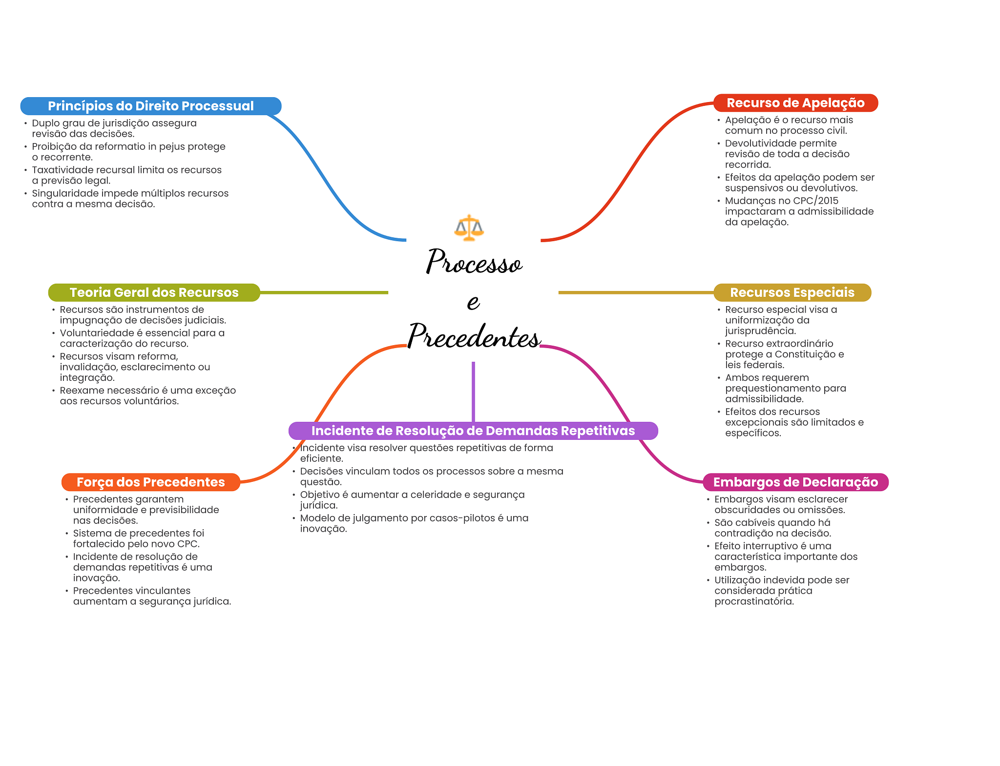 Princípios do Direito Processual Recurso de Apelação Duplo grau de jurisdição assegura Apelação é o recurso mais revisão das decisões. comum no processo civil. Proibição da reformatio in pejus protege Devolutividade permite recorrente. revisão de toda a decisão recorrida. Taxatividade recursal limita recursos a previsão legal. Efeitos da apelação podem ser Singularidade impede múltiplos recursos suspensivos ou devolutivos. contra a mesma decisão. Mudanças no CPC/2015 impactaram a admissibilidade da apelação. Processo Teoria Geral dos Recursos Recursos Especiais Recursos são instrumentos de e Recurso especial visa a impugnação de decisões judiciais. uniformização da Voluntariedade é essencial para a Precedentes jurisprudência. caracterização do recurso. Recurso extraordinário Recursos visam reforma, protege a Constituição e invalidação, esclarecimento ou leis federais. integração. Ambos requerem Reexame necessário é uma exceção prequestionamento para aos recursos voluntários. admissibilidade. Efeitos dos recursos excepcionais são limitados e Incidente de Resolução de Demandas Repetitivas específicos. visa resolver questões repetitivas de forma eficiente. Decisões vinculam todos processos sobre a mesma Força dos Precedentes questão. Embargos de Declaração Precedentes garantem Objetivo é aumentar a celeridade e segurança Embargos visam esclarecer uniformidade e previsibilidade jurídica. obscuridades ou omissões. nas decisões. Modelo de julgamento por casos-pilotos é uma São cabíveis quando há Sistema de precedentes foi inovação. contradição na decisão. fortalecido pelo novo CPC. Efeito interruptivo é uma Incidente de resolução de característica importante dos demandas repetitivas é uma embargos. inovação. Utilização indevida pode ser Precedentes vinculantes considerada prática aumentam a segurança jurídica. procrastinatória.