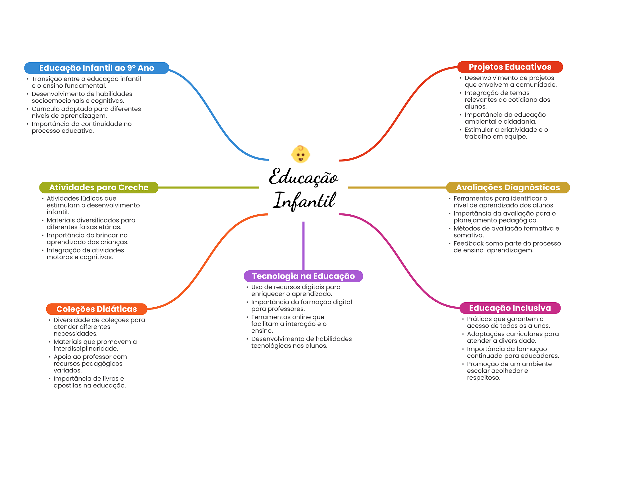 Educação Infantil ao 9° Ano Projetos Educativos Transição entre a educação infantil Desenvolvimento de projetos e ensino fundamental. que envolvem a comunidade. Desenvolvimento de habilidades Integração de temas e cognitivas. relevantes ao cotidiano dos Currículo adaptado para diferentes alunos. níveis de aprendizagem. Importância da educação Importância da continuidade no ambiental e cidadania. processo educativo. Estimular a criatividade e o trabalho em equipe. Educação Atividades para Creche Avaliações Diagnósticas Atividades lúdicas que Infantil Ferramentas para identificar estimulam desenvolvimento nível de aprendizado dos alunos. infantil. Importância da avaliação para Materiais diversificados para planejamento pedagógico. diferentes faixas etárias. Métodos de avaliação formativa e Importância do brincar no somativa. aprendizado das crianças. Feedback como parte do processo Integração de atividades de ensino-aprendizagem motoras e cognitivas. Tecnologia na Educação Uso de recursos digitais para enriquecer aprendizado. Importância da formação digital Coleções Didáticas para professores. Educação Inclusiva Diversidade de coleções para Ferramentas online que Práticas que garantem O atender diferentes facilitam a interação e acesso de todos alunos. ensino. necessidades. Adaptações curriculares para Desenvolvimento de habilidades Materiais que promovem a atender a diversidade. interdisciplinaridade. tecnológicas nos alunos. Importância da formação Apoio ao professor com continuada para educadores. recursos pedagógicos Promoção de um ambiente variados. escolar acolhedor e Importância de livros e respeitoso. apostilas na educação.