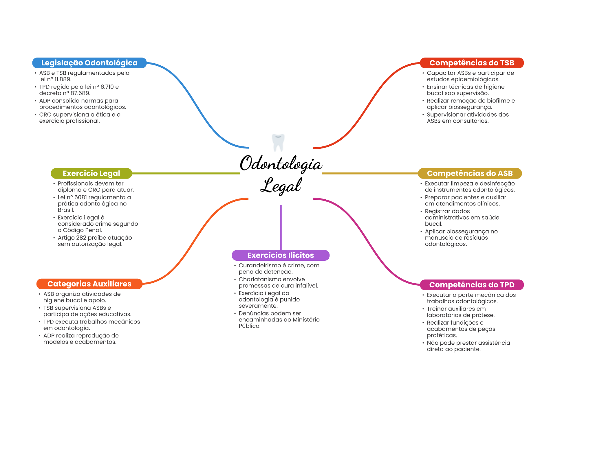Legislação Odontológica Competências do TSB ASB e TSB regulamentados pela Capacitar ASBs e participar de lei n° 11.889. estudos epidemiológicos. TPD regido pela lei n° 6.710 e Ensinar técnicas de higiene decreto n° 87.689. bucal sob supervisão. ADP consolida normas para Realizar remoção de biofilme e procedimentos odontológicos. aplicar biossegurança. CRO supervisiona a ética e Supervisionar atividades dos exercício profissional. ASBs em consultórios. Odontologia Exercício Legal Competências do ASB Profissionais devem ter Legal Executar limpeza e desinfecção diploma e CRO para atuar. de instrumentos odontológicos. Lei n° 5081 regulamenta a Preparar pacientes e auxiliar prática odontológica no em atendimentos clínicos. Brasil. Registrar dados Exercício ilegal é administrativos em saúde considerado crime segundo bucal. O Código Penal. Aplicar biossegurança no Artigo 282 proíbe atuação manuseio de resíduos sem autorização legal. odontológicos. Exercícios Ilícitos Curandeirismo é crime, com pena de detenção. Charlatanismo envolve Categorias Auxiliares promessas de cura infalível. Competências do TPD ASB organiza atividades de Exercício ilegal da Executar a parte mecânica dos higiene bucal e apoio. odontologia é punido trabalhos odontológicos. TSB supervisiona ASBs e severamente. Treinar auxiliares em participa de ações educativas. Denúncias podem ser laboratórios de prótese. TPD executa trabalhos mecânicos encaminhadas ao Ministério Público. Realizar fundições e em odontologia. acabamentos de peças ADP realiza reprodução de protéticas. modelos e acabamentos. Não pode prestar assistência direta ao paciente.