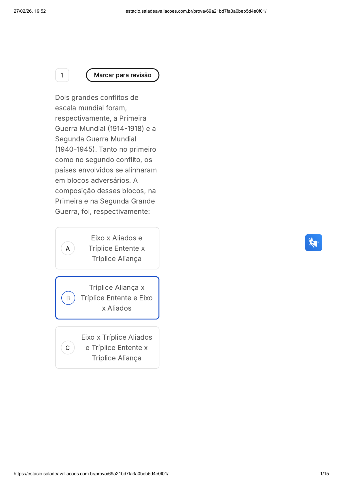 A B C 1 Marcar para revisão Dois grandes conflitos de escala mundial foram, respectivamente, a Primeira Guerra Mundial (1914-1918) e a Segunda Guerra Mundial (1940-1945). Tanto no primeiro como no segundo conflito, os países envolvidos se alinharam em blocos adversários. A composição desses blocos, na Primeira e na Segunda Grande Guerra, foi, respectivamente: Eixo x Aliados e Tríplice Entente x Tríplice Aliança Tríplice Aliança x Tríplice Entente e Eixo x Aliados Eixo x Tríplice Aliados e Tríplice Entente x Tríplice Aliança 27/02/26, 19:52 estacio.saladeavaliacoes.com.br/prova/69a21bd7fa3a0beb5d4e0f01/ https://estacio.saladeavaliacoes.com.br/prova/69a21bd7fa3a0beb5d4e0f01/ 1/15 D E A B Eixo x Aliados e Tríplice Eixo x Tríplice Aliança Tríplice Aliança x Tríplice Eixo e Eixo x Aliados 2 Marcar para revisão A crise atingiu o mundo inteiro. O operário metalúrgico de Pittsburgo, o plantador de café brasileiro, o artesão de Paris e o banqueiro de Londres, todos foram atingidos. (Paul Raynaud - LA FRANCE A SAUVÉ L'EUROPE). O autor se refere à crise mundial de 1929, iniciada nos Estados Unidos, da qual resultou: o abalo do liberalismo econômico e a tendência para a prática da intervenção do Estado na economia. o aumento do número das sociedades acionárias e da especulação financeira. 27/02/26, 19:52 estacio.saladeavaliacoes.com.br/prova/69a21bd7fa3a0beb5d4e0f01/ https://estacio.saladeavaliacoes.com.br/prova/69a21bd7fa3a0beb5d4e0f01/ 2/15 C D E a expansão do sistema de crédito e do financiamento ao consumidor. a imediata valorização dos preços da produção industrial e fim da acumulação de estoques. o crescimento acelerado das atividades de empresas industriais e comerciais, e o pleno emprego. 3 Marcar para revisão A crise de 1929, embora tenha causado grande impacto, não foi uma grande surpresa para o cenário mundial. Esta frase se justifica pelo fato de: 27/02/26, 19:52 estacio.saladeavaliacoes.com.br/prova/69a21bd7fa3a0beb5d4e0f01/ https://estacio.saladeavaliacoes.com.br/prova/69a21bd7fa3a0beb5d4e0f01/ 3/15 A B C Apesar do aumento do emprego e do consumo, havia uma desigualdade na distribuição de renda, além do surgimento de grandes fortunas baseadas na especulação do mercado de ações. Apesar do aumento do emprego, do consumo e da igualdade social, estes elementos não foram suficientes para combater os fatores da crise relacionados à baixa produção. Apesar do aumento do emprego, a baixa produção não acompanhava as necessidades de consumo o que gerou crescente desequilíbrio. 27/02/26, 19:52 estacio.saladeavaliacoes.com.br/prova/69a21bd7fa3a0beb5d4e0f01/ https://estacio.saladeavaliacoes.com.br/prova/69a21bd7fa3a0beb5d4e0f01/ 4/15 D E Apesar do aumento do emprego e da alta produção, a concorrência criada pela URSS minou todos os esforços empreendidos. Apesar da alta produção, os empregos estavam em baixa devido à concorrência criada pela URSS que passou a abastecer os mercados europeus. 4 Marcar para revisão "O efeito da Guerra Fria foi mais impressionante na política internacional do continente europeu que em sua política interna." (HOBSBAWM, Eric. Era dos extremos. Trad. São Paulo: Companhia das Letras, 1995. p. 236) Um dos efeitos a que o autor se refere pode ser sintetizado em: 27/02/26, 19:52 estacio.saladeavaliacoes.com.br/prova/69a21bd7fa3a0beb5d4e0f01/ https://estacio.saladeavaliacoes.com.br/prova/69a21bd7fa3a0beb5d4e0f01/ 5/15 A B C Os países europeus aderiram incondicionalmente à política exterior dos EUA diante da ameaça soviética de invasão do continente. Alguns países europeus criaram uma "comunidade" econômica porque temiam a hegemonia política tanto dos EUA como a da URSS. A Europa manteve-se distante dos conflitos entre as superpotências porque possuía estruturas econômicas e políticas inabaláveis. 00 hora : 31 min : 49 seg Ocultar Questão 10 de 10 Respondidas (10) Em branco (0) Finalizar prova 1 2 3 4 5 6 7 8 9 10 SM2 História Contemporânea Ii 27/02/26, 19:52 estacio.saladeavaliacoes.com.br/prova/69a21bd7fa3a0beb5d4e0f01/ https://estacio.saladeavaliacoes.com.br/prova/69a21bd7fa3a0beb5d4e0f01/ 6/15 D E A B C Os governos da maioria dos Estados europeus, diante do poder dos EUA e da URSS, adotaram uma estratégia política isolacionista. Os Estados europeus, abalados com a ordem bipolar, preferiram evitar o alinhamento político- ideológico com EUA e URSS. 5 Marcar para revisão Os movimentos fascistas foram marcados por um (uma): socialismo extremado e pela luta contra a religião católica ataque à tradição Iluminismo e ao nacionalismo defesa do sistema democrático e do liberalismo como princípio da economia 27/02/26, 19:52 estacio.saladeavaliacoes.com.br/prova/69a21bd7fa3a0beb5d4e0f01/ https://estacio.saladeavaliacoes.com.br/prova/69a21bd7fa3a0beb5d4e0f01/ 7/15 D E A B C D E separação entre proletariado e nação e defesa de uma política liberal nacionalismo extremado e pela determinação de acabar com o liberalismo 6 Marcar para revisão O conjunto de ações empreendidas pelo governo estadunidense com o propósito de reativar a economia abalada pela crise de 1929 pode ser chamado de: New Deal. Plano Marshal. Day After. Bill of rights. Tea Party 27/02/26, 19:52 estacio.saladeavaliacoes.com.br/prova/69a21bd7fa3a0beb5d4e0f01/ https://estacio.saladeavaliacoes.com.br/prova/69a21bd7fa3a0beb5d4e0f01/ 8/15 A B C D E 7 Marcar para revisão A primeira coisa a fazer ao montarmos um curso é selecionar conteúdos, lembrando que a matéria escolar pode ser relacionada a vários recortes de História. Por exemplo, as Revoluções Russa, Chinesa e Cubana ocorreram no século XX e podem ser estudadas juntas sob o título "Revoluções do Século XX". Isto porque, além da questão cronológica, elas apresentam algumas características comuns como a: filiação marxista- leninista concretização dos interesses da burguesia industrial liderança revolucionária dos camponeses defesa do ideári