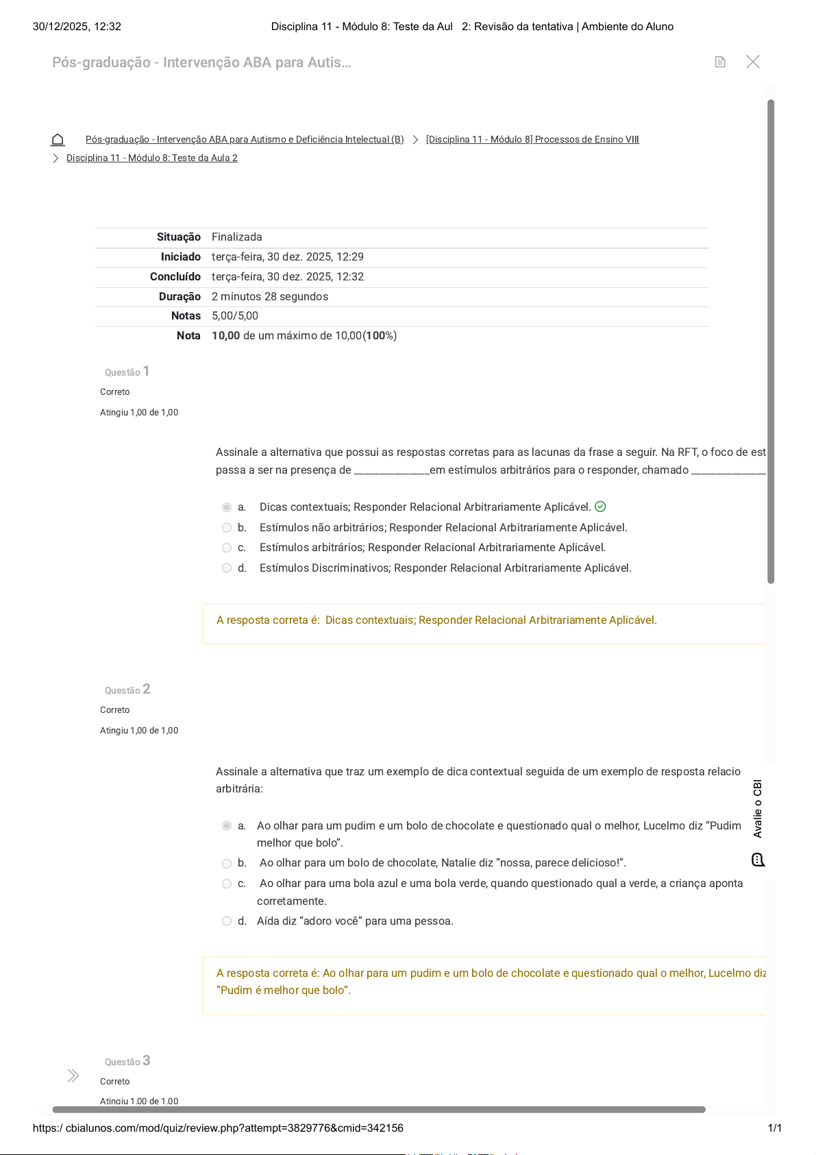 Pós-graduação - Intervenção ABA para Autismo e Deficiência Intelectual (B) [Disciplina 11 - Módulo 8] Processos de Ensino VIII Disciplina 11 - Módulo 8: Teste da Aula 2 Questão 1 Correto Atingiu 1,00 de 1,00 Questão 2 Correto Atingiu 1,00 de 1,00 Questão 3 Correto Atingiu 1,00 de 1,00 Assinale a alternativa que possui as respostas corretas para as lacunas da frase a seguir. Na RFT, o foco de est passa a ser na presença de _______________em estímulos arbitrários para o responder, chamado _______________ a. Dicas contextuais; Responder Relacional Arbitrariamente Aplicável. b. Estímulos não arbitrários; Responder Relacional Arbitrariamente Aplicável. c. Estímulos arbitrários; Responder Relacional Arbitrariamente Aplicável. d. Estímulos Discriminativos; Responder Relacional Arbitrariamente Aplicável. A resposta correta é: Dicas contextuais; Responder Relacional Arbitrariamente Aplicável. Assinale a alternativa que traz um exemplo de dica contextual seguida de um exemplo de resposta relacional arbitrária: a. Ao olhar para um pudim e um bolo de chocolate e questionado qual o melhor, Lucelmo diz “Pudim é melhor que bolo”. b. Ao olhar para um bolo de chocolate, Natalie diz “nossa, parece delicioso!”. c. Ao olhar para uma bola azul e uma bola verde, quando questionado qual a verde, a criança aponta corretamente. d. Aída diz “adoro você” para uma pessoa. A resposta correta é: Ao olhar para um pudim e um bolo de chocolate e questionado qual o melhor, Lucelmo diz “Pudim é melhor que bolo”. Situação Finalizada Iniciado terça-feira, 30 dez. 2025, 12:29 Concluído terça-feira, 30 dez. 2025, 12:32 Duração 2 minutos 28 segundos Notas 5,00/5,00 Nota 10,00 de um máximo de 10,00(100%) Av al ie o C BI Pós-graduação - Intervenção ABA para Autis… 30/12/2025, 12:32 Disciplina 11 - Módulo 8: Teste da Aula 2: Revisão da tentativa | Ambiente do Aluno https://cbialunos.com/mod/quiz/review.php?attempt=3829776&cmid=342156 1/1 https://cbialunos.com/course/view.php?id=488 https://cbialunos.com/course/section.php?id=15272 https://cbialunos.com/mod/quiz/view.php?id=342156 https://cbialunos.com/my/courses.php https://cbialunos.com/course/view.php?id=488 https://cbialunos.com/course/view.php?id=488&mb2sct=46