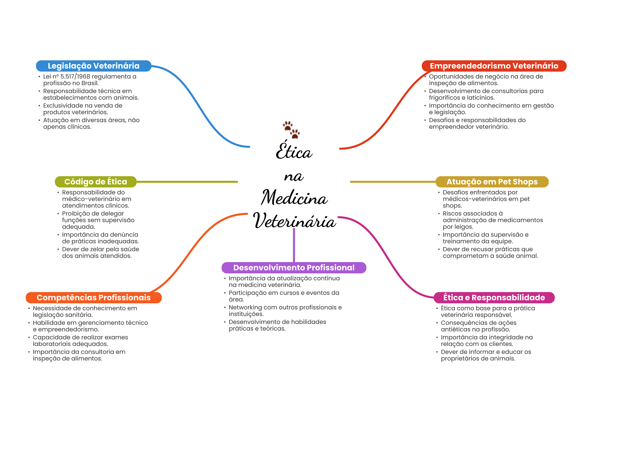 Legislação Veterinária Empreendedorismo Veterinário Lei n° 5.517/1968 regulamenta a Oportunidades de negócio na área de profissão no Brasil. inspeção de alimentos. Responsabilidade técnica em Desenvolvimento de consultorias para com animais. frigoríficos e laticínios. Exclusividade na venda de Importância do conhecimento em gestão produtos veterinários. e legislação. Atuação em diversas áreas, não Desafios e responsabilidades do apenas clínicas. empreendedor veterinário. Ética Código de Ética na Atuação em Pet Shops Responsabilidade do médico-veterinário em Medicina Desafios enfrentados por médicos-veterinários em pet atendimentos clínicos. shops. Proibição de delegar Riscos associados à funções sem supervisão Veterinária administração de medicamentos adequada. por leigos. Importância da denúncia Importância da supervisão e de práticas inadequadas. treinamento da equipe. Dever de zelar pela saúde Dever de recusar práticas que dos animais atendidos. comprometam a saúde animal. Desenvolvimento Profissional Importância da atualização contínua na medicina veterinária. Participação em cursos e eventos da Competências Profissionais área. Ética e Responsabilidade Necessidade de conhecimento em Networking com outros profissionais e Ética como base para a prática legislação sanitária. instituições. veterinária responsável. Habilidade em gerenciamento técnico Desenvolvimento de habilidades Consequências de ações e empreendedorismo. práticas e teóricas. antiéticas na profissão. Capacidade de realizar exames Importância da integridade na laboratoriais adequados. relação com OS clientes. Importância da consultoria em Dever de informar e educar os inspeção de alimentos. proprietários de animais.