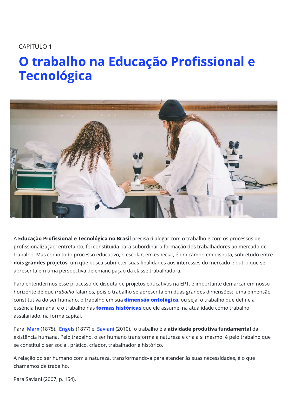 CAPÍTULO 1 trabalho na Educação Profissional e Tecnológica A Educação Profissional e Tecnológica no Brasil precisa dialogar com trabalho e com os processos de profissionalização; entretanto, foi constituída para subordinar a formação dos trabalhadores ao mercado de trabalho. Mas como todo processo educativo, o escolar, em especial, é um campo em disputa, sobretudo entre dois grandes projetos: um que busca submeter suas finalidades aos interesses do mercado e outro que se apresenta em uma perspectiva de emancipação da classe trabalhadora. Para entendermos esse processo de disputa de projetos educativos na é importante demarcar em nosso horizonte de que trabalho falamos, pois o trabalho se apresenta em duas grandes dimensões: uma dimensão constitutiva do ser humano, trabalho em sua dimensão ontológica, ou seja, trabalho que define a essência humana, e trabalho nas formas históricas que ele assume, na atualidade como trabalho assalariado, na forma capital. Para Marx (1875), Engels (1877) e Saviani (2010), trabalho é a atividade produtiva fundamental da existência humana. Pelo trabalho, ser humano transforma a natureza e cria a si mesmo: é pelo trabalho que se constitui ser social, prático, criador, trabalhador e histórico. A relação do ser humano com a natureza, transformando-a para atender às suas necessidades, é 0 que chamamos de trabalho. Para Saviani (2007, p. 154),Assim, nos tornamos homens e mulheres pelo trabalho, nos humanizamos pelo trabalho. Quando separamos a força do trabalho do processo de produção e do produto do trabalho e a vendemos, chamamos o trabalho de emprego ou de trabalho assalariado; quando trabalhador não se reconhece mais no produto do seu trabalho, chamamos essa situação de alienação. É assim que se apresenta o trabalho nas sociedades modernas dentro da estrutura capitalista. Para o capitalismo, quanto mais trabalhador se separa do produto de seu trabalho, distancia-se e não se reconhece nele, mais ainda é possível controlar sua força de trabalho e gerar lucros - que serão usufruídos por poucos. Voltar Avançar Leitura Página 2 de 22 2024 SETEC-MEC LANTEC/PROSA-UFSC. Todos os direitos reservados.Martins (2021) explica que, na perspectiva marxista, trabalho não se reduz a emprego. Para ele, [...] houve, há e poderá haver sociedade sem emprego, como, por exemplo, as formações sociais tradicionais, nas quais a existência é garantida pelo trabalho, mas nelas não há emprego. De outro modo, diz-se que não houve, não há e não haverá sociedade sem trabalho, pois este é, justamente, conjunto de ações pelas quais a humanidade garante a existência. Caso deixe de existir 0 trabalho, inexistirá a própria humanidade. (Martins, 2021, p. 10). A dupla dimensão do trabalho também foi cantada pela banda Legião Urbana em sua "Música de trabalho", no álbum "A tempestade", de 1996: "Sem trabalho eu não sou nada Não tenho dignidade Não sinto meu valor Não tenho identidade Mas que eu tenho É só um emprego E um salário miserável Eu tenho meu ofício Que me cansa de verdade Tem gente que não tem nada E outros que tem mais do que precisam [...] Na música, podemos observar a dimensão do trabalho que humaniza, cria identidade e dignidade ao homem e à mulher, e o trabalho na forma de emprego, ofício, que, em grande parte, é penoso e nada imaginativo. Como afirma Kosik (1976, p. 110), [...] o capitalismo rompe esse vínculo direto, separa trabalho da criação, os produtos dos produtores e transforma o trabalho numa fadiga incriativa e extenuante.Título: Trabalhador Fonte: William Kitzinger (2009). Marx (2015, p. 352) denunciou, nos Manuscritos Econômicos Filosóficos de 1844, que [...] homem necessitado, cheio de preocupações, não tem nenhum sentido para espetáculo mais belo. Podemos observar na letra da música que o trabalhador vive o dilema entre necessitar do trabalho que lhe dá valor e identidade e possuir apenas um emprego, que lhe cansa e que, em grande parte, lhe confere um salário que não atende às suas necessidades mais básicas de sobrevivência. Na atualidade, emprego também tem sofrido mudanças com as transformações no mundo do trabalho. Assim, outras formas de exploração do trabalhador têm sido inseridas nos processos de produção com a flexibilização do trabalho e dos direitos já assegurados e com mito do empreendedorismo. Para refletir: dimensões do trabalho Você chegou ao primeiro momento de reflexão desta unidade temática! Lembre-se de registrar suas reflexões no Memorial e/ou seguir as orientações dos seus tutores sobre essa atividade. Você reconhece as dimensões ontológica e histórica do trabalho acima analisadas? Identifique essas duas dimensões em sua instituição, em sua comunidade, em seu território, e dialogue com seus colegas de turma. Como essas dimensões se manifestam em seu contexto? Se possível, adicione no seu Memorial letras de músicas, poesias, fotografias ou outras manifestações artísticas que revelem essas dimensões contraditórias do trabalho.maneira satírica e crítica as condições de trabalho da época. Chaplin interpreta um operário que trabalha em uma linha de montagem em uma fábrica. Nesse papel, por exemplo, o personagem retrata a monotonia, a repetição exaustiva das tarefas e a falta de dignidade dos trabalhadores. Tempos Modernos Diretor: Charlie Chaplin 1936 Charlíe CHAPLIN in MODERN TIMES directed and produced by CHARLES CHAPLIN Released UNITED ARTISTS Título: Cartaz do filme Tempos Modernos Fonte: United Artists (1936). Elaboração: Prosa (2024). Ora, trabalho constitui ser humano, como afirma Saviani. É pelo trabalho que nos fazemos gente, transformamos e criamos nosso meio de vida. No trecho da música da Legião Urbana, podemos observar trabalho na sua forma de capital, já separado do ser humano e se tornando controle do próprio indivíduo. Também é possível identificar na letra da música que existe um