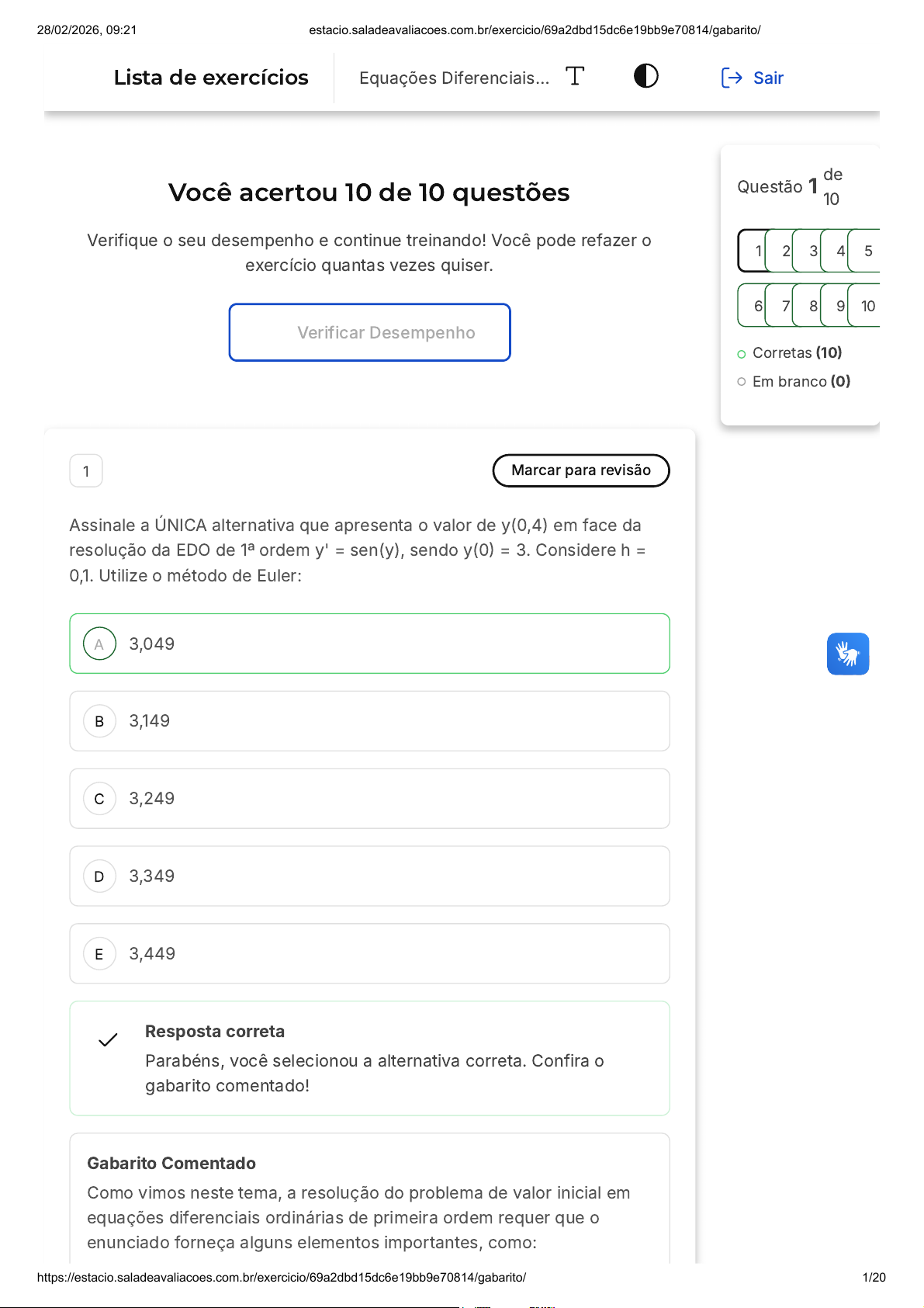 Você acertou 10 de 10 questões Verifique o seu desempenho e continue treinando! Você pode refazer o exercício quantas vezes quiser. Verificar Desempenho A B C D E 1 Marcar para revisão Assinale a ÚNICA alternativa que apresenta o valor de y(0,4) em face da resolução da EDO de 1ª ordem y' = sen(y), sendo y(0) = 3. Considere h = 0,1. Utilize o método de Euler: 3,049 3,149 3,249 3,349 3,449 Resposta correta Parabéns, você selecionou a alternativa correta. Confira o gabarito comentado! Gabarito Comentado Como vimos neste tema, a resolução do problema de valor inicial em equações diferenciais ordinárias de primeira ordem requer que o enunciado forneça alguns elementos importantes, como: Questão 1 de 10 Corretas (10) Em branco (0) 1 2 3 4 5 6 7 8 9 10 Lista de exercícios Equações Diferenciais… Sair 28/02/2026, 09:21 estacio.saladeavaliacoes.com.br/exercicio/69a2dbd15dc6e19bb9e70814/gabarito/ https://estacio.saladeavaliacoes.com.br/exercicio/69a2dbd15dc6e19bb9e70814/gabarito/ 1/20 - A equação diferencial ordinária de primeira ordem propriamente dita; O ponto inicial; O ponto final; A quantidade de intervalos (ou o tamanho de cada intervalo); e O valor da função no ponto inicial. Neste exemplo, temos que: - A equação diferencial ordinária de primeira ordem propriamente dita é y' = sen(y); O ponto inicial é 0; O ponto final é 0,4; O tamanho de cada intervalo é 0,1; e O valor da função no ponto inicial é 3. Isso posto, utilize o método indicado a seguir: 28/02/2026, 09:21 estacio.saladeavaliacoes.com.br/exercicio/69a2dbd15dc6e19bb9e70814/gabarito/ https://estacio.saladeavaliacoes.com.br/exercicio/69a2dbd15dc6e19bb9e70814/gabarito/ 2/20 A B C D E 2 Marcar para revisão Assinale a ÚNICA alternativa que apresenta o valor de y(0,4) em face da resolução da EDO de 1ª ordem y' = 2.cos(y), sendo y(0) = 3. Considere h = 0,1. Utilize o método de Euler: 2,288 2,388 2,488 2,588 2,688 Resposta correta Parabéns, você selecionou a alternativa correta. Confira o gabarito comentado! 28/02/2026, 09:21 estacio.saladeavaliacoes.com.br/exercicio/69a2dbd15dc6e19bb9e70814/gabarito/ https://estacio.saladeavaliacoes.com.br/exercicio/69a2dbd15dc6e19bb9e70814/gabarito/ 3/20 Gabarito Comentado Como vimos neste tema, a resolução do problema de valor inicial em equações diferenciais ordinárias de primeira ordem requer que o enunciado forneça alguns elementos importantes, como: - A equação diferencial ordinária de primeira ordem propriamente dita; O ponto inicial; O ponto final; A quantidade de intervalos (ou o tamanho de cada intervalo); e O valor da função no ponto inicial. Neste exemplo, temos que: - A equação diferencial ordinária de primeira ordem propriamente dita é y' = 2.cos(y); O ponto inicial é 0; O ponto final é 0,4; O tamanho de cada intervalo é 0,1; e O valor da função no ponto inicial é 3. Isso posto, utilize o método indicado a seguir: 28/02/2026, 09:21 estacio.saladeavaliacoes.com.br/exercicio/69a2dbd15dc6e19bb9e70814/gabarito/ https://estacio.saladeavaliacoes.com.br/exercicio/69a2dbd15dc6e19bb9e70814/gabarito/ 4/20 A B C D E 3 Marcar para revisão Assinale a ÚNICA alternativa que apresenta o valor de y(0,4) em face da resolução da EDO de 1ª ordem y' = y , sendo y(0) = 3. Considere h = 0,1. Utilize o método de Euler: 2 15,348 15,448 15,548 15,648 15,748 Resposta correta Parabéns, você selecionou a alternativa correta. Confira o gabarito comentado! 28/02/2026, 09:21 estacio.saladeavaliacoes.com.br/exercicio/69a2dbd15dc6e19bb9e70814/gabarito/ https://estacio.saladeavaliacoes.com.br/exercicio/69a2dbd15dc6e19bb9e70814/gabarito/ 5/20 Gabarito Comentado Como vimos neste tema, a resolução do problema de valor inicial em equações diferenciais ordinárias de primeira ordem requer que o enunciado forneça alguns elementos importantes, como: - A equação diferencial ordinária de primeira ordem propriamente dita; O ponto inicial; O ponto final; A quantidade de intervalos (ou o tamanho de cada intervalo); e O valor da função no ponto inicial. Neste exemplo, temos que: - A equação diferencial ordinária de primeira ordem propriamente dita é y' = y ; O ponto inicial é 0; O ponto final é 0,4; O tamanho de cada intervalo é 0,1; e O valor da função no ponto inicial é 3. Isso posto, utilize o método indicado a seguir: 2 28/02/2026, 09:21 estacio.saladeavaliacoes.com.br/exercicio/69a2dbd15dc6e19bb9e70814/gabarito/ https://estacio.saladeavaliacoes.com.br/exercicio/69a2dbd15dc6e19bb9e70814/gabarito/ 6/20 A B C D E 4 Marcar para revisão Assinale a ÚNICA alternativa que apresenta o valor de y(3) em face da resolução da EDO de 1ª ordem y' = cos(y), sendo y(0) = 0,3. Considere h = 0,30. Utilize o método de Runge-Kutta: 1,497 1,597 1,697 1,797 1,897 Resposta correta Parabéns, você selecionou a alternativa correta. Confira o gabarito comentado! Gabarito Comentado A resolução do problema de valor inicial em equações diferenciais ordinárias de primeira ordem requer que o enunciado forneça alguns 28/02/2026, 09:21 estacio.saladeavaliacoes.com.br/exercicio/69a2dbd15dc6e19bb9e70814/gabarito/ https://estacio.saladeavaliacoes.com.br/exercicio/69a2dbd15dc6e19bb9e70814/gabarito/ 7/20 elementos importantes, como: - A equação diferencial ordinária de primeira ordem propriamente dita; - O ponto inicial; - O ponto final; - A quantidade de intervalos (ou o tamanho de cada intervalo); e - O valor da função no ponto inicial. Neste exemplo, temos que: - A equação diferencial ordinária de primeira ordem propriamente dita é y' = cos(y); - O ponto inicial é 0; - O ponto final é 3; - O tamanho de cada intervalo é 0,3; e - O valor da função no ponto inicial é 0,3. Isso posto, utilize o método indicado a seguir: Executando o código indicado, você obterá a resposta 1.49. 5 Marcar para revisão Assinale a ÚNICA alternativa que apresenta o valor de y(1) em face da resolução da EDO de 1ª ordem y' = y , sendo y(0) = 0,3. Considere h = 0,1