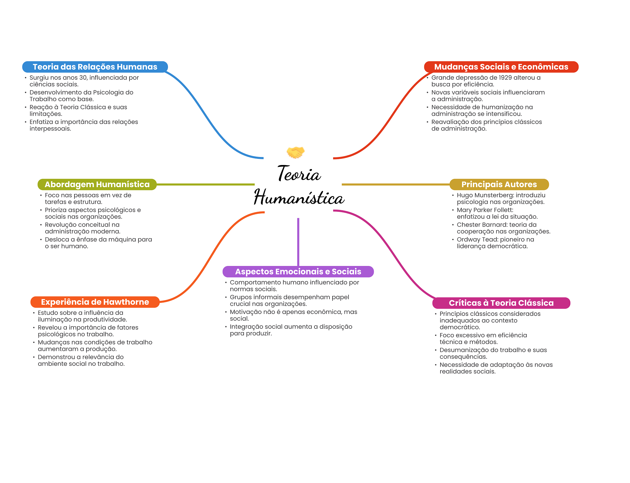 Teoria das Relações Humanas Mudanças Sociais e Econômicas Surgiu nos anos 30, influenciada por Grande depressão de 1929 alterou a ciências sociais. busca por eficiência. Desenvolvimento da Psicologia do Novas variáveis sociais influenciaram Trabalho como base. a administração. Reação à Teoria Clássica e suas Necessidade de humanização na limitações. administração se intensificou. Enfatiza a importância das relações Reavaliação dos princípios clássicos interpessoais. de administração. Teoria Abordagem Humanística Principais Autores Foco nas pessoas em vez de tarefas e estrutura. Humanística Hugo Munsterberg: introduziu psicologia nas organizações. Prioriza aspectos psicológicos e Mary Parker Follett: sociais nas organizações. enfatizou a lei da situação. Revolução conceitual na Chester Barnard: teoria da administração moderna. cooperação nas organizações. Desloca a ênfase da máquina para Ordway Tead: pioneiro na ser humano. liderança democrática. Aspectos Emocionais e Sociais Comportamento humano influenciado por normas sociais. Grupos informais desempenham papel Experiência de Hawthorne crucial nas organizações. Críticas à Teoria Clássica Estudo sobre a influência da Motivação não é apenas econômica, mas Princípios clássicos considerados iluminação na produtividade. social. inadequados ao contexto Revelou a importância de fatores Integração social aumenta a disposição democrático. psicológicos no trabalho. para produzir. Foco excessivo em eficiência Mudanças nas condições de trabalho técnica e métodos. aumentaram a produção. Desumanização do trabalho e suas Demonstrou a relevância do consequências. ambiente social no trabalho. Necessidade de adaptação às novas realidades sociais.