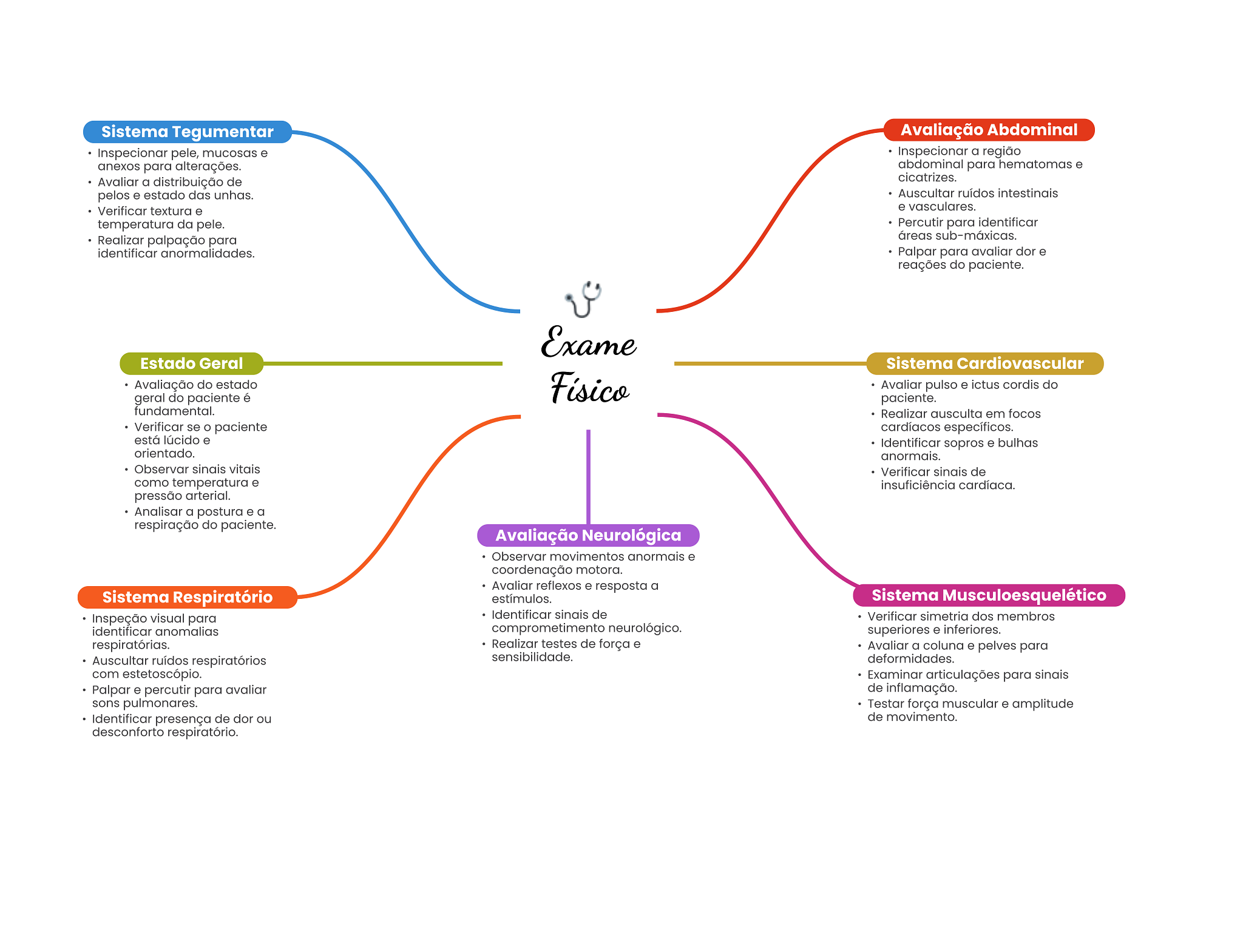 Sistema Tegumentar Avaliação Abdominal Inspecionar pele, mucosas e Inspecionar a região anexos para alterações. abdominal para hematomas e Avaliar a distribuição de cicatrizes. pelos e estado das unhas. Auscultar ruídos Verificar textura e e vasculares. temperatura da pele. Percutir para identificar Realizar palpação para áreas sub-máxicas. identificar anormalidades. Palpar para avaliar dor e reações do paciente. Exame Estado Geral Sistema Cardiovascular Avaliação do estado Físico Avaliar pulso e ictus cordis do geral do paciente é paciente. fundamental. Realizar ausculta em focos Verificar se paciente cardíacos específicos. está lúcido e Identificar sopros e bulhas orientado. anormais. Observar sinais vitais Verificar sinais de como temperatura e insuficiência cardíaca. pressão arterial. Analisar a postura e a respiração do paciente. Avaliação Neurológica Observar movimentos anormais e coordenação motora. Avaliar reflexos e resposta a Sistema Respiratório estímulos. Sistema Musculoesquelético Inspeção visual para Identificar sinais de Verificar simetria dos membros identificar anomalias comprometimento neurológico. superiores e inferiores. respiratórias. Realizar testes de força e Avaliar a coluna e pelves para Auscultar ruídos respiratórios sensibilidade. deformidades. com estetoscópio. Examinar articulações para sinais Palpar e percutir para avaliar de inflamação. sons pulmonares. Testar força muscular e amplitude Identificar presença de dor ou de movimento. desconforto respiratório.