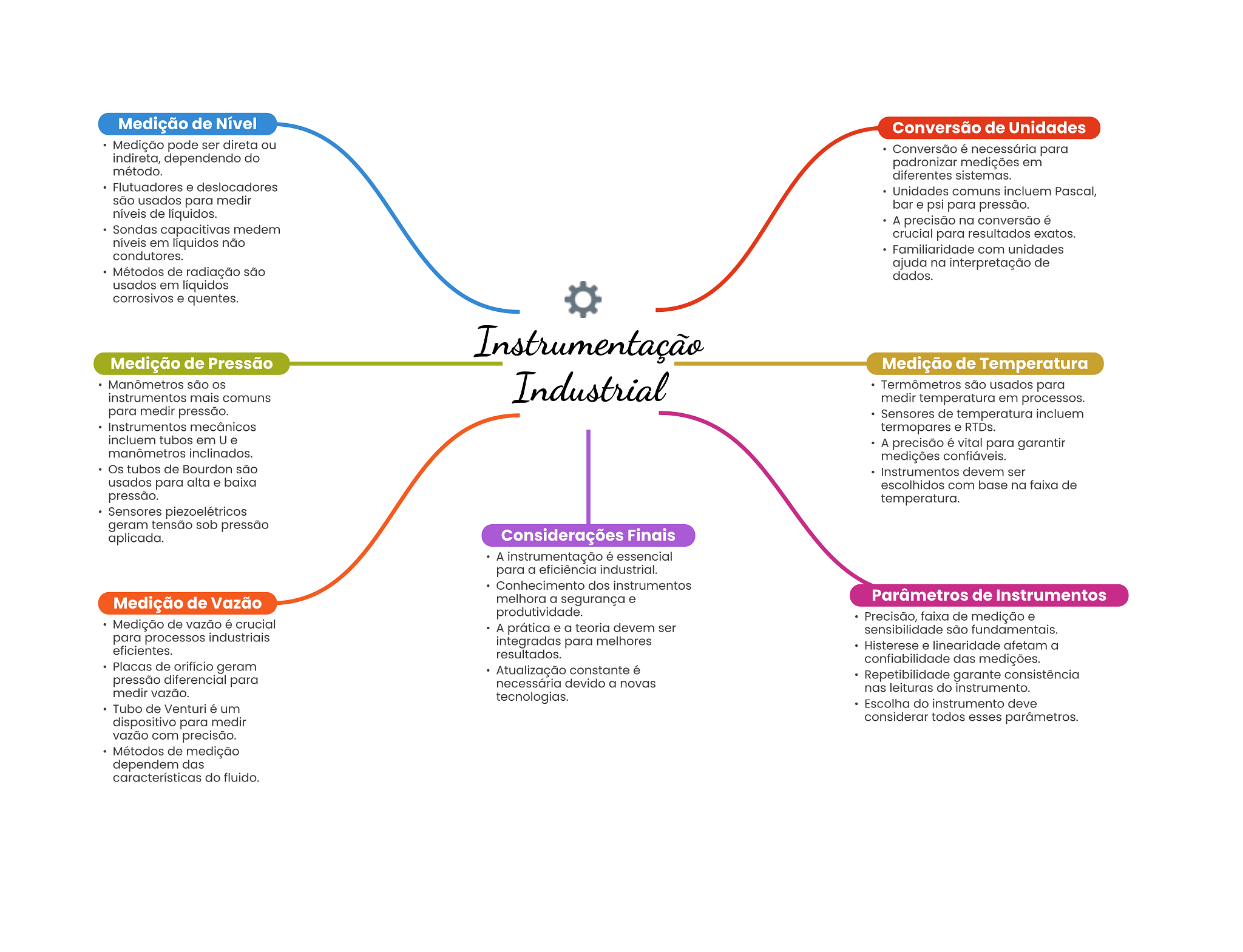 Medição de Nível Conversão de Unidades Medição pode ser direta ou Conversão é necessária para indireta, dependendo do padronizar medições em método. diferentes sistemas. Flutuadores e deslocadores Unidades comuns incluem Pascal, são usados para medir bar e psi para pressão. níveis de líquidos. A precisão na conversão é Sondas capacitivas medem crucial para resultados exatos. níveis em líquidos não Familiaridade com unidades condutores. ajuda na interpretação de Métodos de radiação são dados. usados em líquidos corrosivos e quentes. Instrumentação Medição de Pressão Medição de Temperatura Manômetros são OS Industrial Termômetros são usados para instrumentos mais comuns medir temperatura em processos. para medir pressão. Sensores de temperatura incluem Instrumentos mecânicos termopares e RTDs. incluem tubos em U e A precisão é vital para garantir manômetros inclinados. medições confiáveis. Os tubos de Bourdon são Instrumentos devem ser usados para alta e baixa escolhidos com base na faixa de pressão. temperatura. Sensores piezoelétricos geram tensão sob pressão aplicada. Considerações Finais A instrumentação é essencial para a eficiência industrial. Conhecimento dos instrumentos melhora a segurança e Parâmetros de Instrumentos Medição de Vazão produtividade. Precisão, faixa de medição e Medição de vazão é crucial A prática e a teoria devem ser sensibilidade são fundamentais. para processos industriais integradas para melhores eficientes. Histerese e linearidade afetam a resultados. confiabilidade das medições. Placas de orifício geram Atualização constante é pressão diferencial para Repetibilidade garante consistência necessária devido a novas medir vazão. nas leituras do instrumento. tecnologias. Tubo de Venturi é um Escolha do instrumento deve dispositivo para medir considerar todos esses parâmetros. vazão com precisão. Métodos de medição dependem das características do fluido.