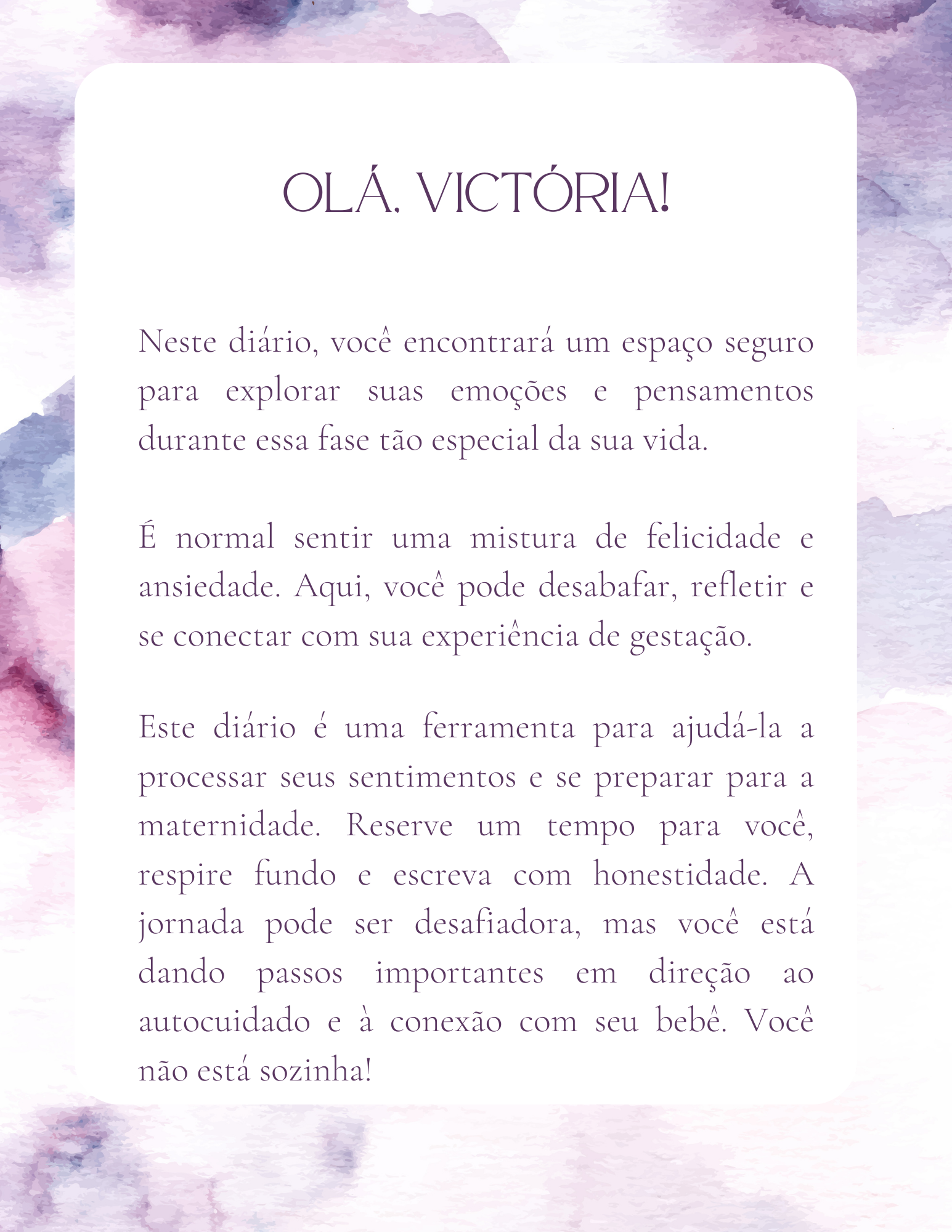 OLÁ. VICTÓRIA! Neste diário, você encontrará um espaço seguro para explorar suas emoções e pensamentos durante essa fase tão especial da sua vida. É normal sentir uma mistura de felicidade e ansiedade. Aqui, você pode desabafar, refletir e se conectar com sua experiência de gestação. Este diário é uma ferramenta para ajudá-la a processar seus sentimentos e se preparar para a maternidade. Reserve um tempo para você, respire fundo e escreva com honestidade. A jornada pode ser desafiadora, mas você está dando passos importantes em direção ao autocuidado e à conexão com seu bebê. Você não está sozinha!