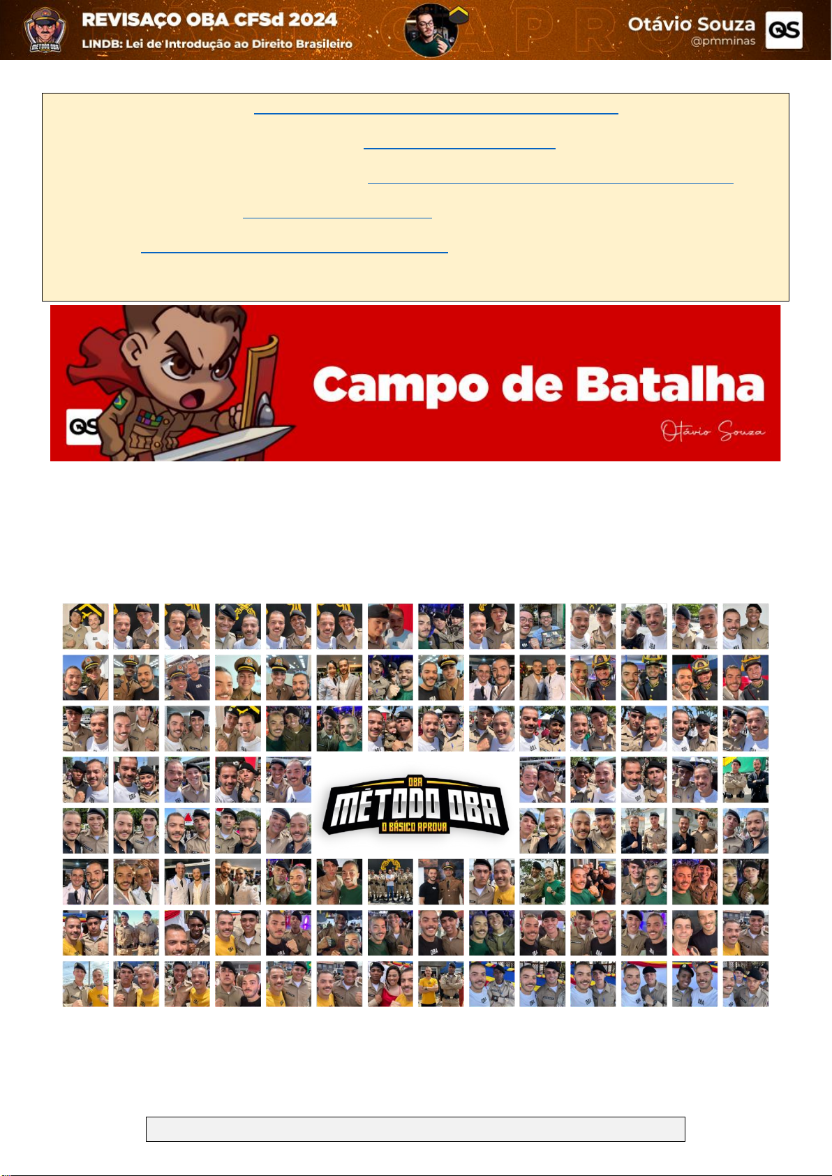 Otávio Souza ∙ Método OBA - @pmminas 1 Siga meu Instagram: https://pmminas.com/mentoria-pmmg-v2/ Combo de Apostilas e Mentorias: https://pmminas.com/ Inscreva-se nas Aulas Semanais: https://pmminas.com/aula-ao-vivo-pmmg/ Grupo do Telegram: https://t.me/pmminas Youtube: https://www.youtube.com/pmminas Autor: Otávio Souza – PMMINAS Em breve você estará fardado e tiraremos uma foto juntos. Vejo você na sua formatura Licenciado para richard pereira, e-mail richarpereira.est@gmail.com, cpf: 15494269663, celular: 33998291607 Direitos Autorais reservados PMMinas Negócios Digitais LTDA Otávio Souza ∙ Método OBA - @pmminas 2 1. IBFC - Deleg (PC BA)/PC BA/2022 No que se refere ao disposto na Lei de Introdução às Normas do Direito Brasileiro, assinale a alternativa correta. a) Salvo disposição contrária, a lei começa a vigorar em todo o país três meses depois de oficialmente publicada b) Nos Estados estrangeiros, a obrigatoriedade da lei brasileira, quando admitida, se inicia 120 dias depois de oficialmente publicada c) As correções a texto de lei já em vigor consideram-se lei nova d) Mesmo se for destinada à vigência temporária, a lei terá vigor até que outra a modifique ou revogue e) A lei revogada, via de regra, restaura-se por ter a lei revogadora perdido a vigência 2. DIRENS Aeronáutica - EAOAp (CIAAR)/CIAAR/Serviços Jurídicos/2021 Informe se é verdadeiro (V) ou falso (F) o que se afirma sobre o disposto na Lei de Introdução às normas do Direito Brasileiro. ( ) Todas as leis começam a vigorar em todo o país quarenta e cinco dias depois de oficialmente publicadas. ( ) As correções ao texto de lei, já em vigor, não são consideradas como se a lei fosse nova, não havendo revogação da lei corrigida, nem nova publicação da mesma. ( ) A lei posterior revoga a anterior quando expressamente o declare, quando seja com ela incompatível ou quando regule inteiramente a matéria de que tratava a lei anterior. ( ) A lei terá vigor até que outra a modifique ou revogue, não se destinando à vigência temporária, sendo que a lei revogada não se restaura por ter a lei revogadora perdido a vigência, salvo disposição em contrário. De acordo com as afirmações, a sequência correta é a) (F); (F); (V); (V). b) (V); (V); (F); (F). c) (V); (F); (F); (V). d) (F); (V); (V); (F). 3. CEBRASPE (CESPE) - DPF/PF/2018 Diante da existência de normas gerais sobre determinado assunto, publicou-se oficialmente nova lei que estabelece disposições especiais acerca desse assunto. Nada ficou estabelecido acerca da data em que essa nova lei entraria em vigor nem do prazo de sua vigência. Seis meses depois da publicação oficial da nova lei, um juiz recebeu um processo em que as partes discutiam um contrato firmado anos antes. A partir dessa situação hipotética, julgue o item a seguir, considerando o disposto na Lei de Introdução às Normas do Direito Brasileiro. A nova lei começou a vigorar no país quarenta e cinco dias depois de oficialmente publicada e permanecerá em vigor até que outra lei a modifique ou a revogue. Certo Errado 4. CEBRASPE (CESPE) - Del Pol (PC GO)/PC GO/2017 Licenciado para richard pereira, e-mail richarpereira.est@gmail.com, cpf: 15494269663, celular: 33998291607 Direitos Autorais reservados PMMinas Negócios Digitais LTDA Otávio Souza ∙ Método OBA - @pmminas 3 A Lei n.º XX/XXXX, composta por quinze artigos, elaborada pelo Congresso Nacional, foi sancionada, promulgada e publicada. A respeito dessa situação, assinale a opção correta, de acordo com a Lei de Introdução às Normas do Direito Brasileiro. a) Se algum dos artigos da lei sofrer alteração antes de ela entrar em vigor, será contado um novo período de vacância para o dispositivo alterado. b) Caso essa lei tenha revogado dispositivo da legislação anterior, automaticamente ocorrerá o efeito repristinatório se nela não houver disposição em contrário. c) A lei irá revogar a legislação anterior caso estabeleça disposições gerais sobre assunto tratado nessa legislação. d) Não havendo referência ao período de vacância, a nova lei entra em vigor imediatamente, sendo eventuais correções em seu texto consideradas nova lei. e) Não havendo referência ao período de vacância, a lei entrará em vigor, em todo o território nacional, três meses após sua publicação. 5. NUCEPE UESPI - Del Pol (PC PI)/PC PI/2014 É na Lei de Introdução às normas do Direito Brasileiro que encontramos normas que disciplinam o âmbito de aplicação das normas jurídicas. Dentre as alternativas abaixo, marque a CORRETA. a) Salvo disposição contrária, a lei começa a vigorar em todo o país 45 (quarenta e cinco) dias depois de oficialmente ultrapassado o período de vacatio legis. b) A vigência das leis, que os governos estaduais elaborem por autorização do Governo Federal, depende da aprovação deste e começará no prazo que a legislação estadual fixar. c) A lei nova, que estabeleça disposições gerais ou especiais a par das já existentes, não revoga nem modifica a lei anterior. d) Quando a lei for omissa, o juiz decidirá o caso de acordo com a analogia, os costumes, os princípios gerais de direito e equidade. e) A lei em vigor terá efeito imediato, condicional e geral, respeitados o ato jurídico perfeito, direito adquirido e a coisa julgada. 6. COPEC CETAM - Del Pol (PC AM)/PC AM/2009 O lapso temporal compreendido entre a publicação da lei e sua entrada em vigor denomina-se vacatio legis. Com efeito, salvo disposição em contrário, a lei começa a vigorar em todo País: a) quarenta e cinco dias depois de aprovada. b) quarenta e cinco dias depois de oficialmente publicada. c) trinta dias depois de oficialmente publicada. d) trinta dias depois de aprovada. 7. DIRENS Aeronáutica - EAOAp (CIAAR)/CIAAR/Serviços Jurídicos/2023 Licenciado para richard pereira, e-mail richarpereira.est@gmail.com, cpf: 15494269663, celular: 33998291607 Direitos Autorais