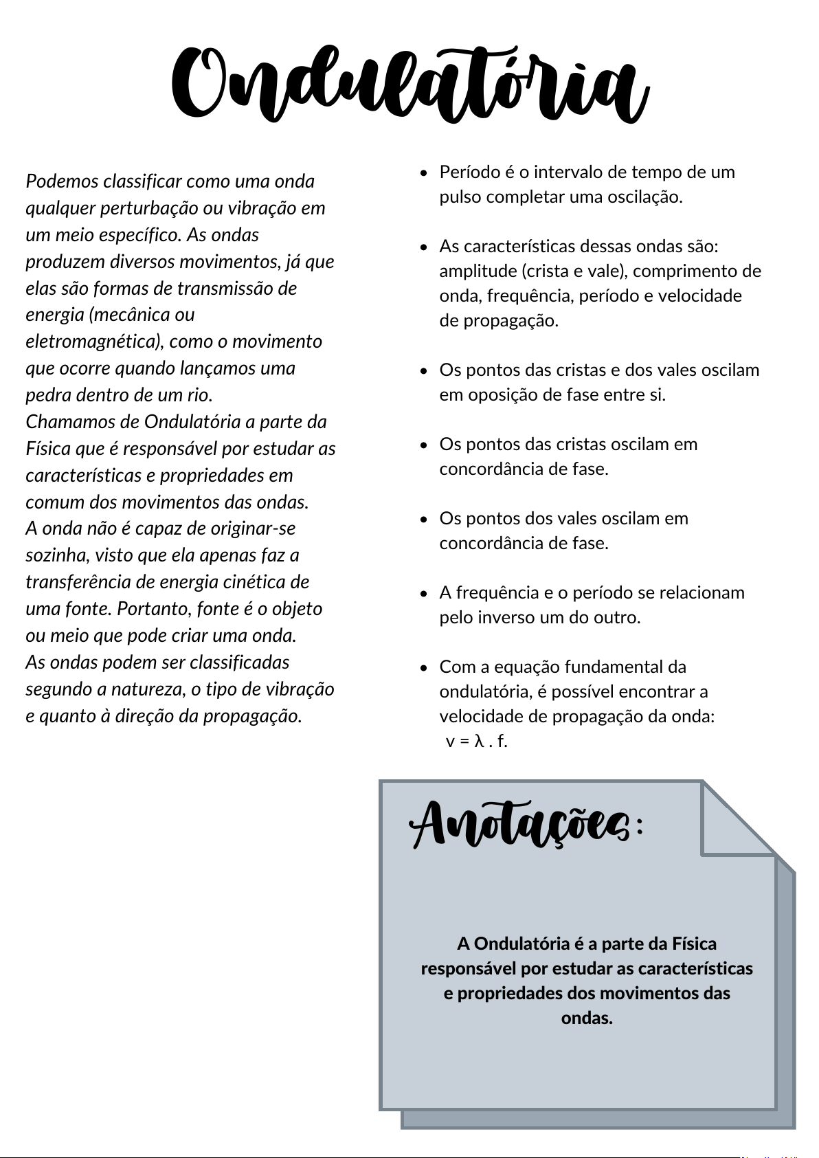 Ondulatória Podemos classificar como uma onda qualquer perturbação ou vibração em um meio específico. As ondas produzem diversos movimentos, já que elas são formas de transmissão de energia (mecânica ou eletromagnética), como o movimento que ocorre quando lançamos uma pedra dentro de um rio. Chamamos de Ondulatória a parte da Física que é responsável por estudar as características e propriedades em comum dos movimentos das ondas. A onda não é capaz de originar-se sozinha, visto que ela apenas faz a transferência de energia cinética de uma fonte. Portanto, fonte é o objeto ou meio que pode criar uma onda. As ondas podem ser classificadas segundo a natureza, o tipo de vibração e quanto à direção da propagação. Anotações: A Ondulatória é a parte da Física responsável por estudar as características e propriedades dos movimentos das ondas. Período é o intervalo de tempo de um pulso completar uma oscilação. As características dessas ondas são: amplitude (crista e vale), comprimento de onda, frequência, período e velocidade de propagação. Os pontos das cristas e dos vales oscilam em oposição de fase entre si. Os pontos das cristas oscilam em concordância de fase. Os pontos dos vales oscilam em concordância de fase. A frequência e o período se relacionam pelo inverso um do outro. Com a equação fundamental da ondulatória, é possível encontrar a velocidade de propagação da onda: v = λ . f. https://mundoeducacao.uol.com.br/fisica/ondas-2.htm https://mundoeducacao.uol.com.br/fisica/ondas-2.htm https://mundoeducacao.uol.com.br/fisica/ondas-2.htm https://mundoeducacao.uol.com.br/fisica/ondas-mecanicas.htm https://mundoeducacao.uol.com.br/fisica/o-que-sao-ondas-eletromagneticas.htm https://mundoeducacao.uol.com.br/fisica/ondas-mecanicas.htm https://mundoeducacao.uol.com.br/fisica/ondas-mecanicas.htm https://mundoeducacao.uol.com.br/fisica/ondas-mecanicas.htm https://mundoeducacao.uol.com.br/fisica/energia-cinetica.htm Tipos de ondas As ondas periódicas são perturbações no meio provocadas por uma fonte com período constante, ou seja, o intervalo para completar um pulso ou uma oscilação é um valor constante. Classificação das ondas periódicas Como qualquer onda, as ondas periódicas podem ser classificadas em relação a sua natureza, direção de propagação e de vibração. Esquema ilustrativo com exemplos e características de ondas transversais e longitudinais → Classificação das ondas periódicas quanto à natureza Mecânica: ondas que precisam de um meio para se propagar, como a onda do mar e a onda sonora. Eletromagnética: ondas que não precisam de um meio material para se propagar, como a luz. → Classificação das ondas periódicas quanto à direção de propagação Unidimensional: ondas que se propagam em apenas uma direção, como um pulso em uma corda. Bidimensional: ondas que se propagam em duas dimensões, como ondas na superfície de uma piscina. Tridimensional: ondas que se propagam em todas as direções, como a onda sonora. → Classificação das ondas periódicas quanto à direção de vibração Longitudinal: ondas que possuem a direção de vibração da fonte igual à direção de propagação da onda, como a onda sonora saindo de um equipamento de som. Transversal: ondas que possuem a direção de vibração perpendicular à direção de propagação da onda, como a onda de uma corda. Elementos da onda Elementos das ondas periódicas As ondas periódicas, como qualquer onda, possuem: amplitude (A), comprimento de onda (λ), frequência (f), período (T) e velocidade de propagação (v). Amplitude (A): é a distância entre o eixo central e o ponto mais alto (crista) ou mais baixo da onda (vale). Sua unidade de medida no Sistema Internacional é o metro (m). Comprimento de onda (λ): é a medida de um ciclo completo da onda, que pode ser medido entre duas cristas, dois vales ou entre uma crista e um vale. Sua unidade de medida no S.I. é o metro (m). Frequência (f): é a quantidade de ciclos em um determinado intervalo de tempo. Se as cristas e os vales estão muito próximos, isso significa que a frequência da onda é alta, do contrário, a frequência é baixa. Sua unidade de medida no S.I. é o hertz (Hz). Período (T): é o intervalo de tempo para se completar um ciclo de onda. Por isso, o período é medido no intervalo de um comprimento de onda. Sua unidade de medida no S.I. é o segundo (s). Velocidade de propagação (v): muda dependendo do meio onde a onda está, e é dada pela equação fundamental da ondulatória: V = λ/T = λ . f. Sua unidade de medida no S.I. é o metro por segundo (m/s). https://brasilescola.uol.com.br/o-que-e/fisica/o-que-e-onda.htm Fórmulas das ondas periódicas Para encontrar o período ou a frequência de uma onda periódica, basta relacionar essas duas grandezas. Para encontrar e frequência: Para encontrar o período: Para encontrar a velocidade de propagação de uma onda, basta utilizar a equação de velocidade na cinemática, que, adaptada para a ondulatória, é chamada de equação fundamental da ondulatória: Substituindo o deslocamento linear pelo deslocamento da onda e o intervalo de tempo pelo período: Comprimento de onda O comprimento de onda é a distância de um ciclo de onda. Esse comprimento pode ser encontrado entre duas cristas, pontos mais altos da onda, ou entre dois vales, pontos mais baixos da onda. O comprimento de onda é medido em metros e representado pela letra grega λ. Os pontos mais altos, as cristas, vibram em concordância de fase. Os pontos mais baixos, os vales, também vibram em concordância. Contudo, as cristas e os vales vibram em oposição de fase entre si. Exemplo: O gráfico representa uma onda que se propaga com velocidade constante de 200 m/s. A amplitude (A), o comprimento de onda (λ) e a frequência (f) da onda são, respectivamente: a) 2,4 cm; 1,0 cm; 40 kHz b) 2,4 cm; 4,0 cm; 20 kHz c) 1,2 cm; 2,0 cm; 40 kHz d) 1,