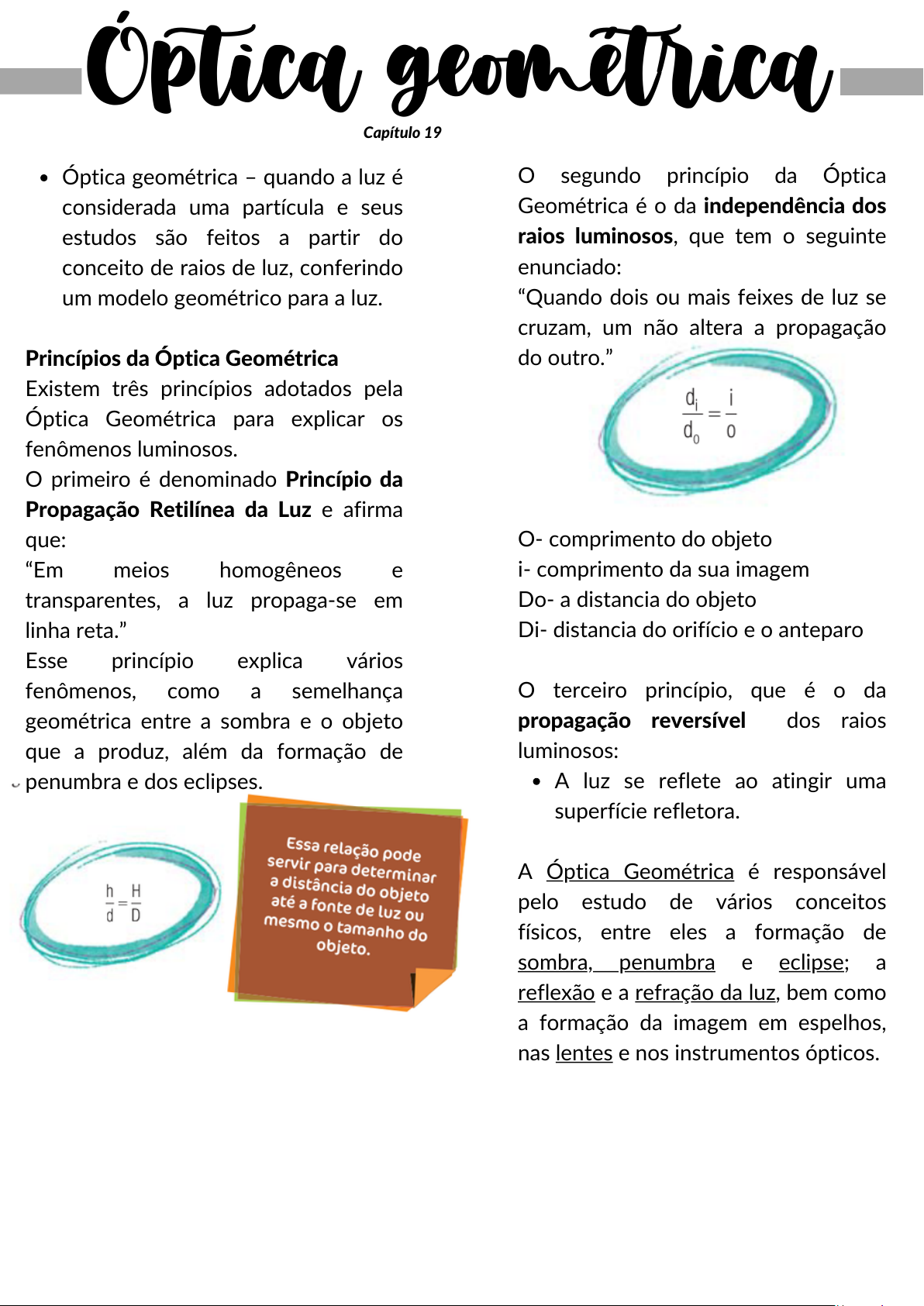 Óptica geométrica Óptica geométrica – quando a luz é considerada uma partícula e seus estudos são feitos a partir do conceito de raios de luz, conferindo um modelo geométrico para a luz. Princípios da Óptica Geométrica Existem três princípios adotados pela Óptica Geométrica para explicar os fenômenos luminosos. O primeiro é denominado Princípio da Propagação Retilínea da Luz e afirma que: “Em meios homogêneos e transparentes, a luz propaga-se em linha reta.” Esse princípio explica vários fenômenos, como a semelhança geométrica entre a sombra e o objeto que a produz, além da formação de penumbra e dos eclipses. O segundo princípio da Óptica Geométrica é o da independência dos raios luminosos, que tem o seguinte enunciado: “Quando dois ou mais feixes de luz se cruzam, um não altera a propagação do outro.” O- comprimento do objeto i- comprimento da sua imagem Do- a distancia do objeto Di- distancia do orifício e o anteparo O terceiro princípio, que é o da propagação reversível dos raios luminosos: A luz se reflete ao atingir uma superfície refletora. A Óptica Geométrica é responsável pelo estudo de vários conceitos físicos, entre eles a formação de sombra, penumbra e eclipse; a reflexão e a refração da luz, bem como a formação da imagem em espelhos, nas lentes e nos instrumentos ópticos. Capítulo 19 https://brasilescola.uol.com.br/fisica/conceitos-basicos-otica-geometrica.htm https://brasilescola.uol.com.br/fisica/sombra-penumbra.htm https://brasilescola.uol.com.br/fisica/eclipse.htm https://brasilescola.uol.com.br/fisica/reflexao-luz.htm https://brasilescola.uol.com.br/fisica/a-refracao-luz.htm https://brasilescola.uol.com.br/fisica/lentes-1.htm Reflexão da Luz Reflexão da luz é um fenômeno óptico em que uma onda eletromagnética visível incide em um determinado meio, retornando ao meio original no qual ela se propagava. Existem dois tipos de reflexão, chamados de reflexão regular e difusa. Reflexão da luz é um fenômeno óptico em que uma onda eletromagnética visível incide em um determinado meio, retornando ao meio original no qual ela se propagava. Existem dois tipos de reflexão, chamados de reflexão regular e difusa. Na reflexão regular, o ângulo de incidência da luz é igual ao ângulo de reflexão. Esse ângulo, por sua vez, é medido com relação à direção normal ao plano de reflexão. Exemplos de reflexão da luz Quando vemos o nosso reflexo em um espelho, retrovisor ou ainda na superfície de uma poça d'água, estamos observando a reflexão regular da luz. Quando enxergamos qualquer objeto que não esteja emitindo luz própria, mas não vemos nele o nosso reflexo, estamos observando a reflexão difusa da luz. Na reflexão difusa, os raios de luz incidente e refletido não formam o mesmo ângulo com relação à direção normal e não precisam estar contidos no mesmo plano. Leis da reflexão da luz As leis da reflexão da luz apontam quais são as condições necessárias para que ocorra a reflexão regular da luz. A primeira lei da reflexão afirma que os raios de luz incidente e refletido precisam formar o mesmo ângulo com relação à direção normal. A segunda lei da reflexão da luz afirma que os raios de luz incidente e refletido precisam estar contidos no mesmo plano. https://mundoeducacao.uol.com.br/fisica/ondas-eletromagneticas.htm https://mundoeducacao.uol.com.br/fisica/ondas-eletromagneticas.htm Espelhos Planos Espelhos planos são superfícies planas, polidas e sem curvatura, capazes de promover a reflexão regular da luz. Quando os raios de luz são refletidos por espelhos planos, o ângulo dos raios refletidos é igual ao ângulo dos raios incidentes, além disso, os raios incidentes e refletidos encontram-se no mesmo plano. No caso dos espelhos planos, os raios de luz refletidos não se cruzam, em vez disso, são os seus prolongamentos que se cruzam para formar imagens. Nos espelhos planos, as imagens são formadas por prolongamentos de raios refletidos. Para que possamos enxergar o nosso reflexo em alguma superfície refletiva, esta deve promover a reflexão regular da luz, ou seja, refletir raios de luz com ângulo igual ao ângulo incidente. Quase todas as superfícies refletem a luz, as paredes brancas, por exemplo, são capazes de fazê-lo, no entanto, de maneira difusa. Em razão disso, é possível enxergá-las, entretanto, não podemos enxergar o nosso reflexo, uma vez que os raios de luz refletidos não apresentam ângulos iguais aos dos raios incidentes. imagens virtuais: são formadas pelo cruzamento de prolongamentos dos raios de luz são sempre diretas, ou seja, apresentam a mesma orientação vertical que os seus objetos; não podem ser projetadas sobre algum anteparo, diferentemente das imagens reais, que podem ser projetadas. Quando olhamos para um espelho plano, como aqueles que temos nos banheiros e móveis de casa, nossa imagem é formada atrás do espelho a mesma distância que nos encontramos da superfície refletora do espelho. Portanto, se você se encontra a 2 m de um espelho plano, sua imagem é formada 2 m atrás do espelho plano, a uma distância de 4 m até você. https://mundoeducacao.uol.com.br/fisica/reflexao-luz.htm Espelhos esféricos Assim como os espelhos planos, os espelhos esféricos obedecem às leis da reflexão, no entanto, a curvatura da sua superfície altera a forma das imagens, por isso, eles podem conjugá-las em diferentes posições e em diferentes tamanhos. Existem dois tipos de espelhos esféricos, os espelhos côncavos e os espelhos convexos. Enquanto os espelhos côncavos convergem a luz refletida, os convexos divergem-na. Espelhos côncavos Os espelhos côncavos têm o formato de uma cavidade esférica refletora. Eles apresentam uma superfície que reflete a luz, e outra, oposta e opaca, ou seja, que não permite a transmissão dela. Quando um feixe de luz incide paralelamente ao eixo de simetria do espelho côncavo, ele 