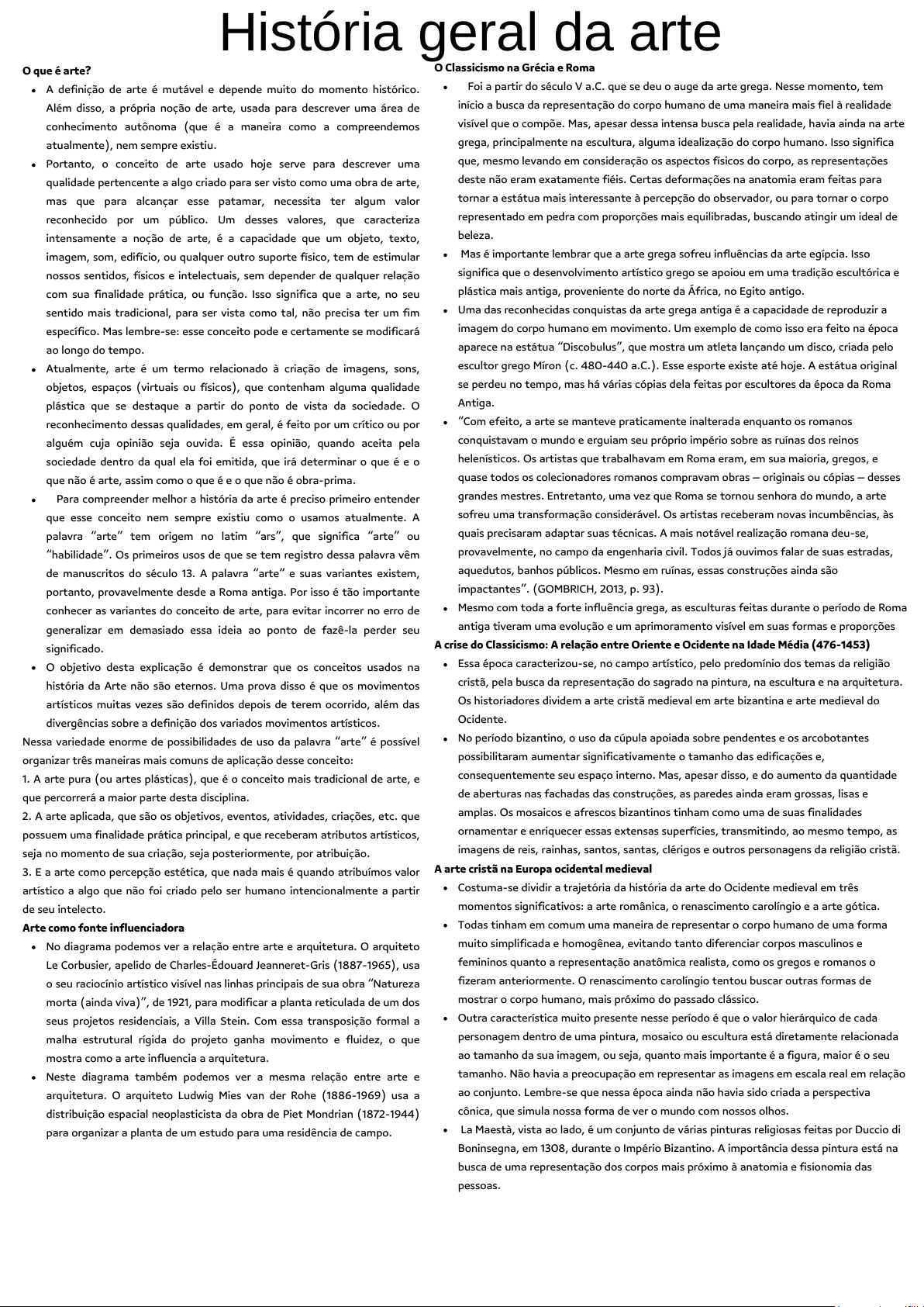 O que é arte? A definição de arte é mutável e depende muito do momento histórico. Além disso, a própria noção de arte, usada para descrever uma área de conhecimento autônoma (que é a maneira como a compreendemos atualmente), nem sempre existiu. Portanto, o conceito de arte usado hoje serve para descrever uma qualidade pertencente a algo criado para ser visto como uma obra de arte, mas que para alcançar esse patamar, necessita ter algum valor reconhecido por um público. Um desses valores, que caracteriza intensamente a noção de arte, é a capacidade que um objeto, texto, imagem, som, edifício, ou qualquer outro suporte físico, tem de estimular nossos sentidos, físicos e intelectuais, sem depender de qualquer relação com sua finalidade prática, ou função. Isso significa que a arte, no seu sentido mais tradicional, para ser vista como tal, não precisa ter um fim específico. Mas lembre-se: esse conceito pode e certamente se modificará ao longo do tempo. Atualmente, arte é um termo relacionado à criação de imagens, sons, objetos, espaços (virtuais ou físicos), que contenham alguma qualidade plástica que se destaque a partir do ponto de vista da sociedade. O reconhecimento dessas qualidades, em geral, é feito por um crítico ou por alguém cuja opinião seja ouvida. É essa opinião, quando aceita pela sociedade dentro da qual ela foi emitida, que irá determinar o que é e o que não é arte, assim como o que é e o que não é obra-prima. Para compreender melhor a história da arte é preciso primeiro entender que esse conceito nem sempre existiu como o usamos atualmente. A palavra “arte” tem origem no latim “ars”, que significa “arte” ou “habilidade”. Os primeiros usos de que se tem registro dessa palavra vêm de manuscritos do século 13. A palavra “arte” e suas variantes existem, portanto, provavelmente desde a Roma antiga. Por isso é tão importante conhecer as variantes do conceito de arte, para evitar incorrer no erro de generalizar em demasiado essa ideia ao ponto de fazê-la perder seu significado. O objetivo desta explicação é demonstrar que os conceitos usados na história da Arte não são eternos. Uma prova disso é que os movimentos artísticos muitas vezes são definidos depois de terem ocorrido, além das divergências sobre a definição dos variados movimentos artísticos. Nessa variedade enorme de possibilidades de uso da palavra “arte” é possível organizar três maneiras mais comuns de aplicação desse conceito: 1. A arte pura (ou artes plásticas), que é o conceito mais tradicional de arte, e que percorrerá a maior parte desta disciplina. 2. A arte aplicada, que são os objetivos, eventos, atividades, criações, etc. que possuem uma finalidade prática principal, e que receberam atributos artísticos, seja no momento de sua criação, seja posteriormente, por atribuição. 3. E a arte como percepção estética, que nada mais é quando atribuímos valor artístico a algo que não foi criado pelo ser humano intencionalmente a partir de seu intelecto. Arte como fonte influenciadora No diagrama podemos ver a relação entre arte e arquitetura. O arquiteto Le Corbusier, apelido de Charles-Édouard Jeanneret-Gris (1887-1965), usa o seu raciocínio artístico visível nas linhas principais de sua obra “Natureza morta (ainda viva)”, de 1921, para modificar a planta reticulada de um dos seus projetos residenciais, a Villa Stein. Com essa transposição formal a malha estrutural rígida do projeto ganha movimento e fluidez, o que mostra como a arte influencia a arquitetura. Neste diagrama também podemos ver a mesma relação entre arte e arquitetura. O arquiteto Ludwig Mies van der Rohe (1886-1969) usa a distribuição espacial neoplasticista da obra de Piet Mondrian (1872-1944) para organizar a planta de um estudo para uma residência de campo. História geral da arte O Classicismo na Grécia e Roma Foi a partir do século V a.C. que se deu o auge da arte grega. Nesse momento, tem início a busca da representação do corpo humano de uma maneira mais fiel à realidade visível que o compõe. Mas, apesar dessa intensa busca pela realidade, havia ainda na arte grega, principalmente na escultura, alguma idealização do corpo humano. Isso significa que, mesmo levando em consideração os aspectos físicos do corpo, as representações deste não eram exatamente fiéis. Certas deformações na anatomia eram feitas para tornar a estátua mais interessante à percepção do observador, ou para tornar o corpo representado em pedra com proporções mais equilibradas, buscando atingir um ideal de beleza. Mas é importante lembrar que a arte grega sofreu influências da arte egípcia. Isso significa que o desenvolvimento artístico grego se apoiou em uma tradição escultórica e plástica mais antiga, proveniente do norte da África, no Egito antigo. Uma das reconhecidas conquistas da arte grega antiga é a capacidade de reproduzir a imagem do corpo humano em movimento. Um exemplo de como isso era feito na época aparece na estátua “Discobulus”, que mostra um atleta lançando um disco, criada pelo escultor grego Míron (c. 480-440 a.C.). Esse esporte existe até hoje. A estátua original se perdeu no tempo, mas há várias cópias dela feitas por escultores da época da Roma Antiga. “Com efeito, a arte se manteve praticamente inalterada enquanto os romanos conquistavam o mundo e erguiam seu próprio império sobre as ruínas dos reinos helenísticos. Os artistas que trabalhavam em Roma eram, em sua maioria, gregos, e quase todos os colecionadores romanos compravam obras – originais ou cópias – desses grandes mestres. Entretanto, uma vez que Roma se tornou senhora do mundo, a arte sofreu uma transformação considerável. Os artistas receberam novas incumbências, às quais precisaram adaptar suas técnicas. A mais notável realização romana deu-se, provavelmente, no campo da engenharia civil. Todos j