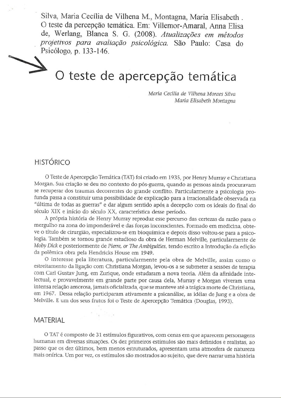 Silva, Maria Cecília de Vilhena M., Montagna, Maria Elisabeth O teste da percepção temática. Em: Villemor-Amaral, Anna Elisa de, Werlang, Blanca S. G. (2008). Atualizações em métodos projetivos para avaliação psicológica. São Paulo: Casa do Psicólogo, p. 133-146. O teste de apercepção temática Maria Cecilia de Vilhena Moraes Silva Maria Elisabeth Montagna HISTÓRICO O Teste de Apercepção Temática (TAT) foi criado em 1935, por Henry Murray e Christiana Morgan. Sua criação se deu no contexto do pós-guerra, quando as pessoas ainda procuravam se recuperar dos traumas decorrentes do grande conflito. Particularmente a psicologia pro- funda passa a constituir uma possibilidade de explicação para a irracionalidade observada na "última de todas as guerras" e dar algum sentido após a decepção com ideais do final do século XIX e início do século XX, característica desse período. A própria história de Henry Murray reproduz esse percurso das certezas da razão para mergulho na zona do imponderável e das forças inconscientes. Formado em medicina, obte- ve título de cirurgião, especializou-se em bioquímica e depois disso voltou-se para a psico- logia. Também se tornou grande estudioso da obra de Herman Melville, particularmente de Moby Dick e posteriormente de Pierre, or The Ambiguities, tendo escrito a Introdução da edição da polêmica obra pela Hendricks House em 1949. O interesse pela literatura, particularmente pela obra de Melville, assim como O estreitamento da ligação com Christiana Morgan, levou-os a se submeter a sessões de terapia com Carl Gustav Jung, em Zurique, onde estudaram a nova teoria. Além da afinidade inte- lectual, e provavelmente em grande parte por causa dela, Murray e Morgan viveram uma intensa relação amorosa, jamais oficializada, que se manteve até a trágica morte de Christiana, em 1967. Dessa relação participaram ativamente a psicanálise, as idéias de Jung e a obra de Melville. E um dos seus frutos foi Teste de Apercepção Temática (Douglas, 1993). MATERIAL O TAT é composto de 31 estímulos figurativos, com cenas em que aparecem personagens humanas em diversas situações. Os dez primeiros estímulos são mais definidos e realistas, ao passo que OS dez últimos, bem menos estruturados, apresentam uma atmosfera de natureza mais onírica. Um por vez, os estímulos são mostrados ao sujeito, que deve narrar uma história134 ATUALIZAÇÕES EM MÉTODOS PROJETIVOS PARA AVALIAÇÃO PSICOLÓGICA sobre que se passa na cena apresentada. A escolha dos estímulos foi feita empiricamente. Foram usadas fotografias de telas expostas em museus, anúncios publicados em revistas, fotos de filmes e de outras fontes, além de imagens desenhadas pela própria Christiana Morgan e pelo artista plástico Samuel Thal, ou por eles redesenhada para assegurar um estilo uniforme. O produto final são reproduções de situações dramáticas, de contornos imprecisos, impressão difusa e tema inexplícito. Murray e Morgan procuraram figuras que provocassem associações com OS conflitos universais ou seja, aqueles mais comuns para a maioria das pessoas. Exposto a esse material, indivíduo, sem perceber, identifica-se com uma personagem por ele escolhida e, com total liberdade, comunica sua experiência perceptiva, mnêmica, imaginativa e emocional em uma história completa inspirada no estímulo apresentado. Os autores acreditavam que as histórias eliciadas por esses estímulos revelassem as principais preocupações do indivíduo, algumas tendências inconscientes subjacentes, mostrando as situações e relações que sugerem ao indivíduo temor, desejos, dificuldades, assim como as necessidades e pressões fundamentais na dinâmica subjacente de sua personalidade (Silva, 1983). Devido ao tempo excessivo que a aplicação dos 20 cartões exige, Bellak e Abrams (1996) sugerem a aplicação de um conjunto básico de 10 estímulos, independentemente do sexo do examinando: 1, 2, 3RH, 4, 6RH, 7MF, 8RH, 9MF, 10 e 13 HF. Para OS autores, cartão 1 é mais valioso da série: "se apenas um estímulo pudesse ser aplicado... [o cartão 1] seria a melhor opção para se poder afirmar alguma coisa sobre a personalidade do indivíduo". Alguns temas que esse cartão pode mobilizar são: relacionamento com pais, necessi- dade de realização, conteúdos simbólicos relacionados à sexualidade, expressão da agressividade, imagem corporal, preocupações obsessivas e até aspectos neuropsicológicos associados a negligência ou déficit de atenção. O cartão 2 favorece a investigação das relações familiares; também é útil para a identifi- cação de tendências compulsivas e da concepção do sujeito quanto aos papéis sexuais. O cartão 3 RH é útil para a identificação de elementos depressivos e para a observação de como sujeito lida com a agressividade. Aspectos relacionados à imagem corporal e à iden- tidade sexual também podem ser expressos. O cartão 4 aborda relacionamento heterossexual. Pode revelar indícios de problemas da sexualidade, além de ciúmes frente à situação triangular. O cartão 6 RH remete às relações mãe/filho, em geral, ao passo que cartão 7 MF remete a essas relações, principalmente para indivíduos do sexo feminino. O cartão 8 RH favorece temas relacionados à agressividade e, eventualmente, à ambição. O cartão 9 MF é importante para a identificação de sentimentos entre figuras femininas e também em casos de suspeita de tendências depressivas ou suicidas. Eventualmente esse cartão se presta também à manifestação de tendências paranóides. O cartão 10, devido à ambigüidade de gênero das personagens, favorece a expressão de dados relacionados à identidade sexual. Por fim, cartão 13 HF favorece a expressão de conflitos relacionados à sexualidade, para sujeitos do sexo feminino ou masculino. Eventualmente manifestam-se tendências orais e traços obsessivo-compulsivos.TÉCNICAS TEMÁTICAS