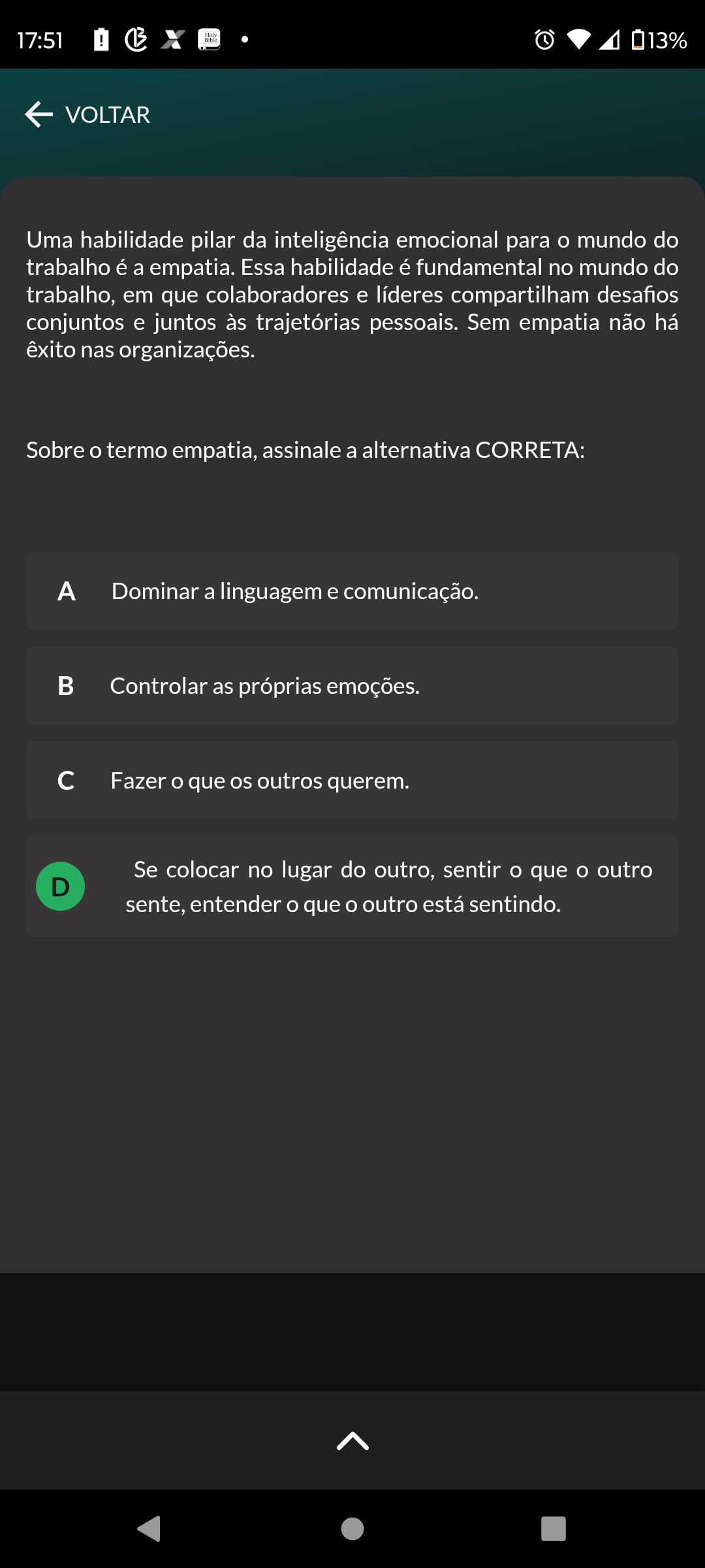 17:51 VOLTAR Uma habilidade pilar da inteligência emocional para mundo do trabalho é a empatia. Essa habilidade é fundamental no mundo do trabalho, em que colaboradores e líderes compartilham desafios conjuntos e juntos às trajetórias pessoais. Sem empatia não há êxito nas organizações. Sobre o termo empatia, assinale a alternativa CORRETA: Dominar a linguagem e comunicação. Controlar as próprias emoções. c Fazer que os outros querem. Se colocar no lugar do outro, sentir que outro D sente, entender o que outro está sentindo.