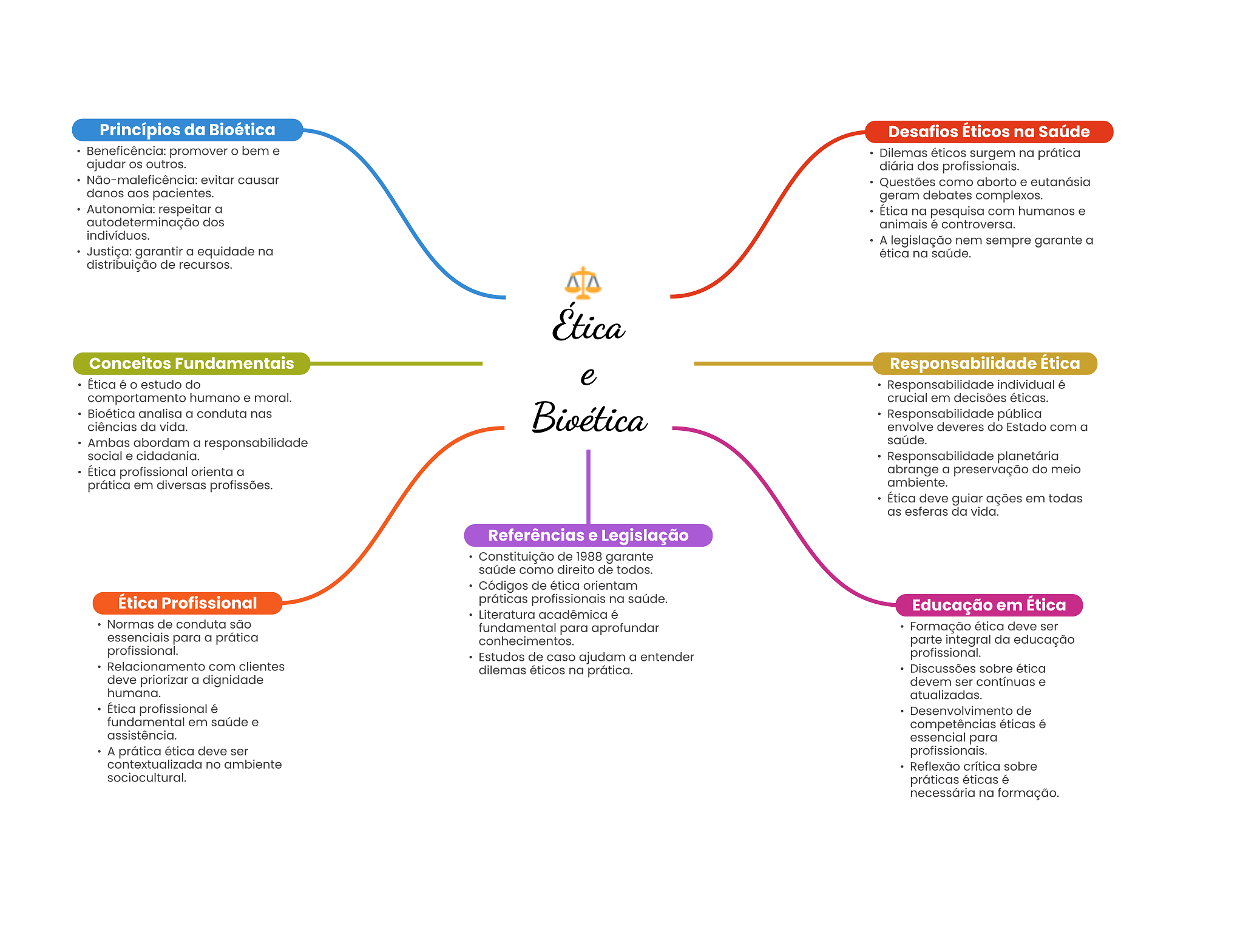 Princípios da Bioética Desafios Éticos na Saúde Beneficência: promover bem e Dilemas éticos surgem na prática ajudar outros. diária dos profissionais. evitar causar Questões como aborto e eutanásia danos aos pacientes. geram debates complexos. Autonomia: respeitar a Ética na pesquisa com humanos e autodeterminação dos animais é controversa. indivíduos. A legislação nem sempre garante a Justiça: garantir a equidade na ética na saúde. distribuição de recursos. Ética Conceitos Fundamentais Responsabilidade Ética Ética é estudo do e Responsabilidade individual é comportamento humano e moral. crucial em decisões éticas. Bioética analisa a conduta nas Bioética Responsabilidade pública ciências da vida. envolve deveres do Estado com a Ambas abordam a responsabilidade saúde. social e cidadania. Responsabilidade planetária Ética profissional orienta a abrange a preservação do meio prática em diversas profissões. ambiente. Ética deve guiar ações em todas as esferas da vida. Referências e Legislação Constituição de 1988 garante saúde como direito de todos. Códigos de ética orientam Ética Profissional práticas profissionais na saúde. Educação em Ética Literatura acadêmica é Normas de conduta são fundamental para aprofundar Formação ética deve ser essenciais para a prática conhecimentos. parte integral da educação profissional. Estudos de caso ajudam a entender profissional. Relacionamento com clientes dilemas éticos na prática. Discussões sobre ética deve priorizar a dignidade devem ser contínuas e humana. atualizadas. Ética profissional é Desenvolvimento de fundamental em saúde e competências éticas é assistência. essencial para A prática ética deve ser profissionais. contextualizada no ambiente Reflexão crítica sobre sociocultural. práticas éticas é necessária na formação.